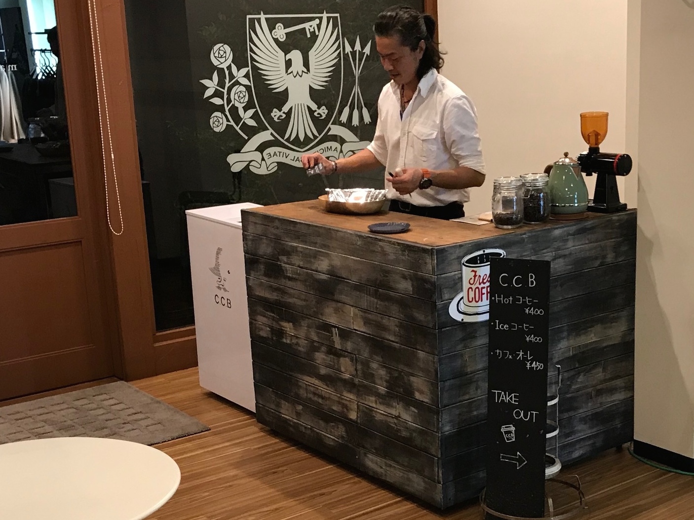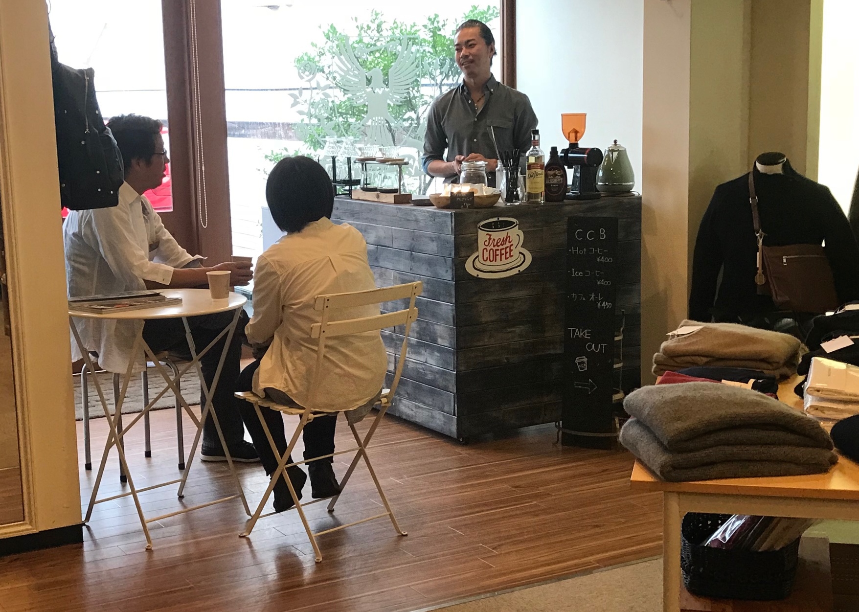 で、今日です。濱中さんと戸島さんに販売応援をいただいている写真を撮れなかったのが残念でしたが、こちらは良い写真をいただきました。C.C.Bの輔(たすく)さん。マガジーノの入り口に、特別にカフェを出店してくださっています。ご来店になられたお客様のほぼ全ての方が、輔(たすく)さんの淹れてくれた美味しいコーヒーを飲みながら、ひと時を過ごしていかれました。