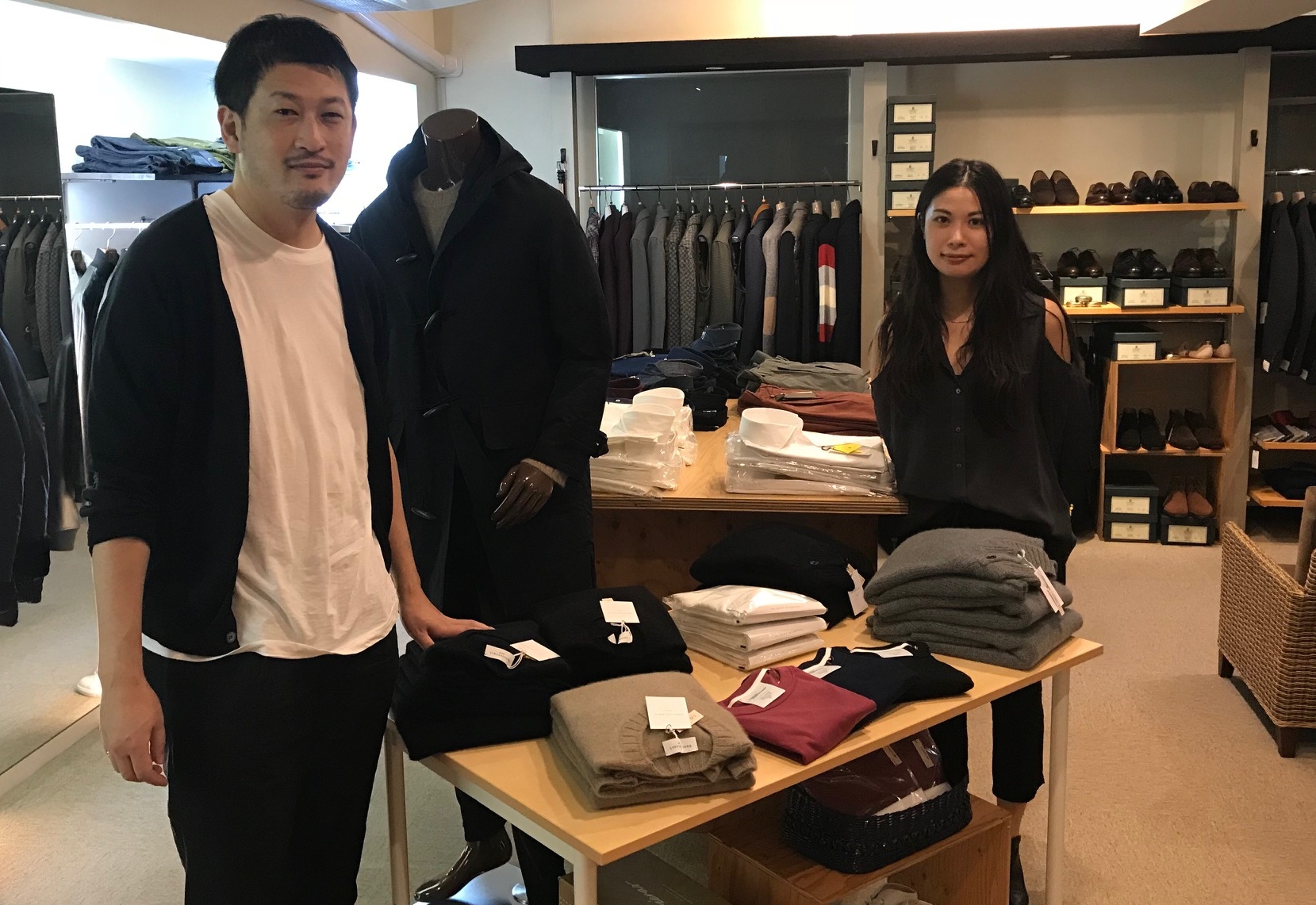 東京より応援に駆けつけてくださったのは、オカベ&パートナーズの濱中さんと戸島さん。ブレイク中の【norlha/ノラ】や【Borelio/ボレリオ】、それからマガジーノでご案内中のカットソーの【MAISON CORNICHION/メゾン コルニション】に、ニットの【Rencontrant/レンコントラント】。それから、コートの【LE PAR-DESSUS/ルーパーデッシュ】。イタリアだけに留まらない世界各国のブランドの提案で、我々服好きを楽しませてくれるエージェントさん。そんな目利きのエージェントのお2人が、明日の28日(土曜)夕方までマガジーノの店頭に立ってくださいます。
