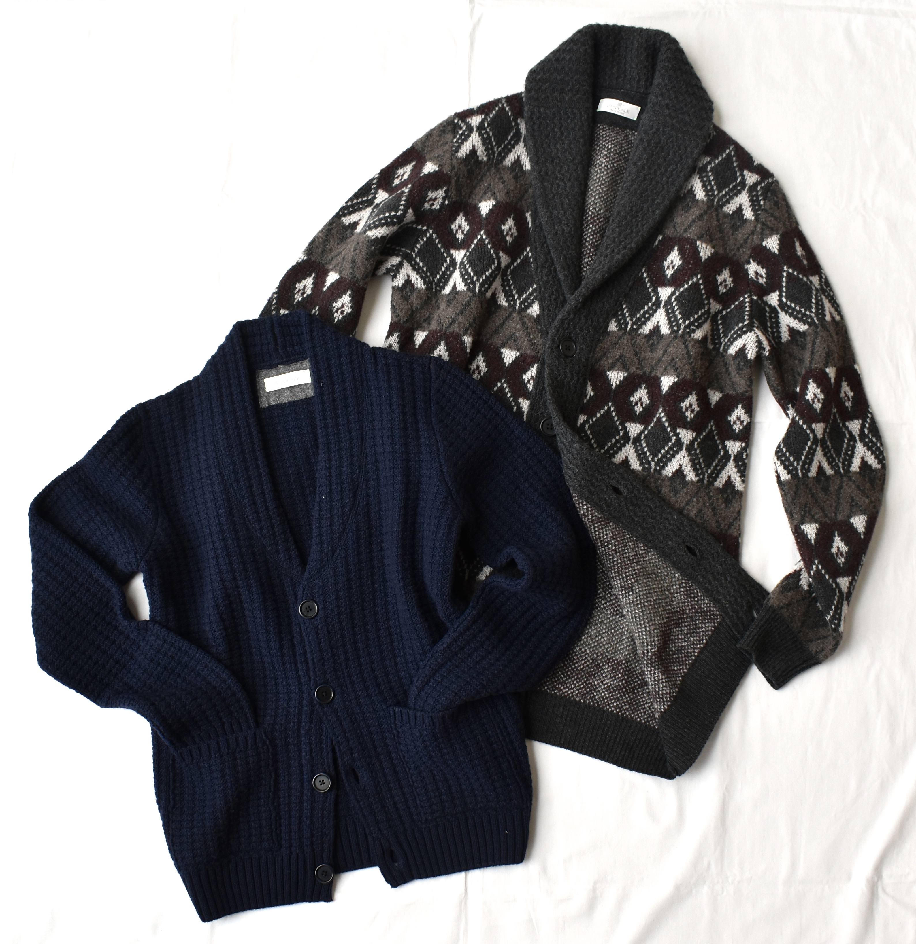 厚手のカーディガンも重宝するアイテムですよね。シックなネイビーのバスケット編みに、フェアアイル柄のロングカーディガンです。