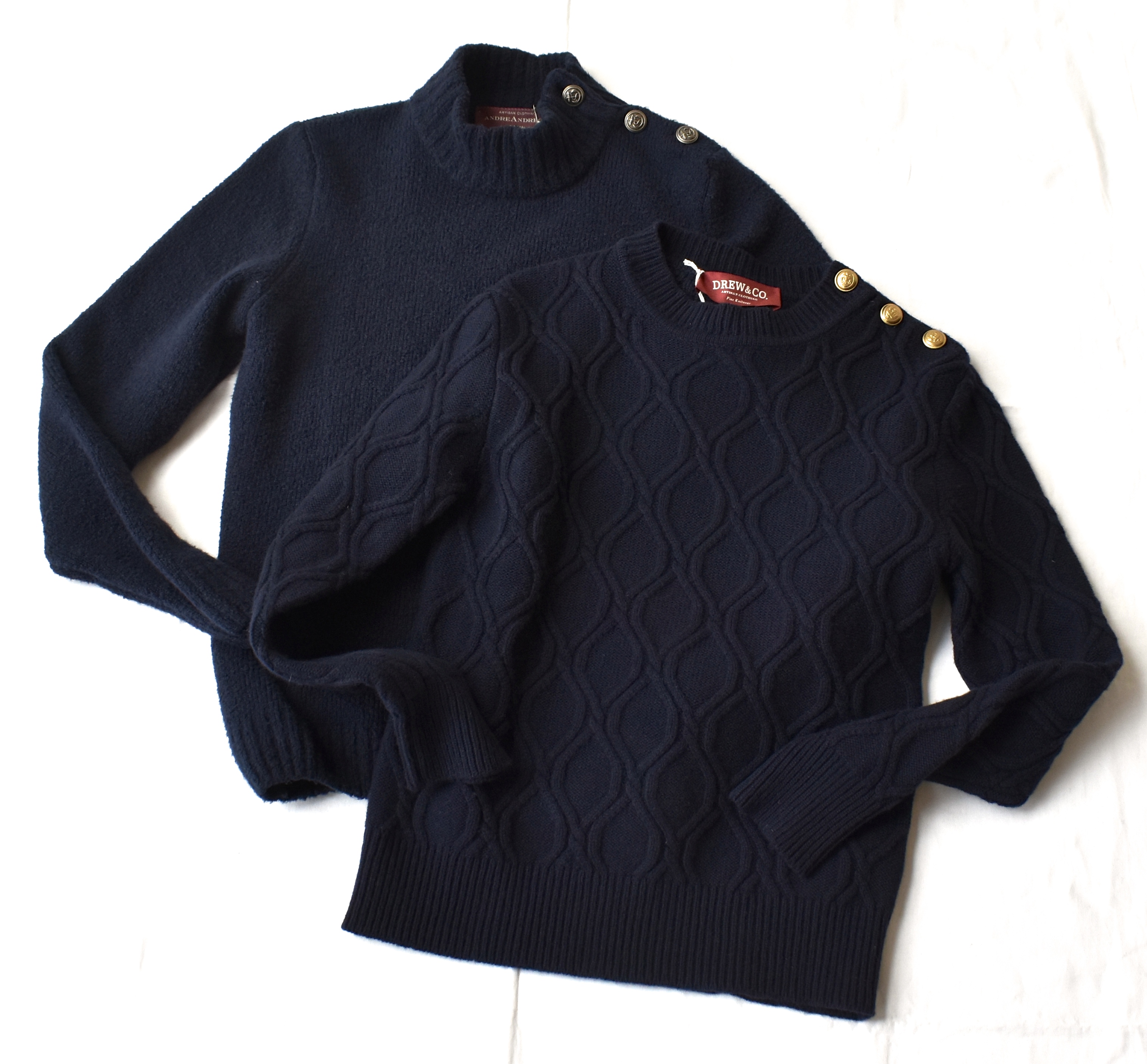 右:【DREW&CO./ドリューアンドコー】肩メタル釦付きケーブル編みクルーネック