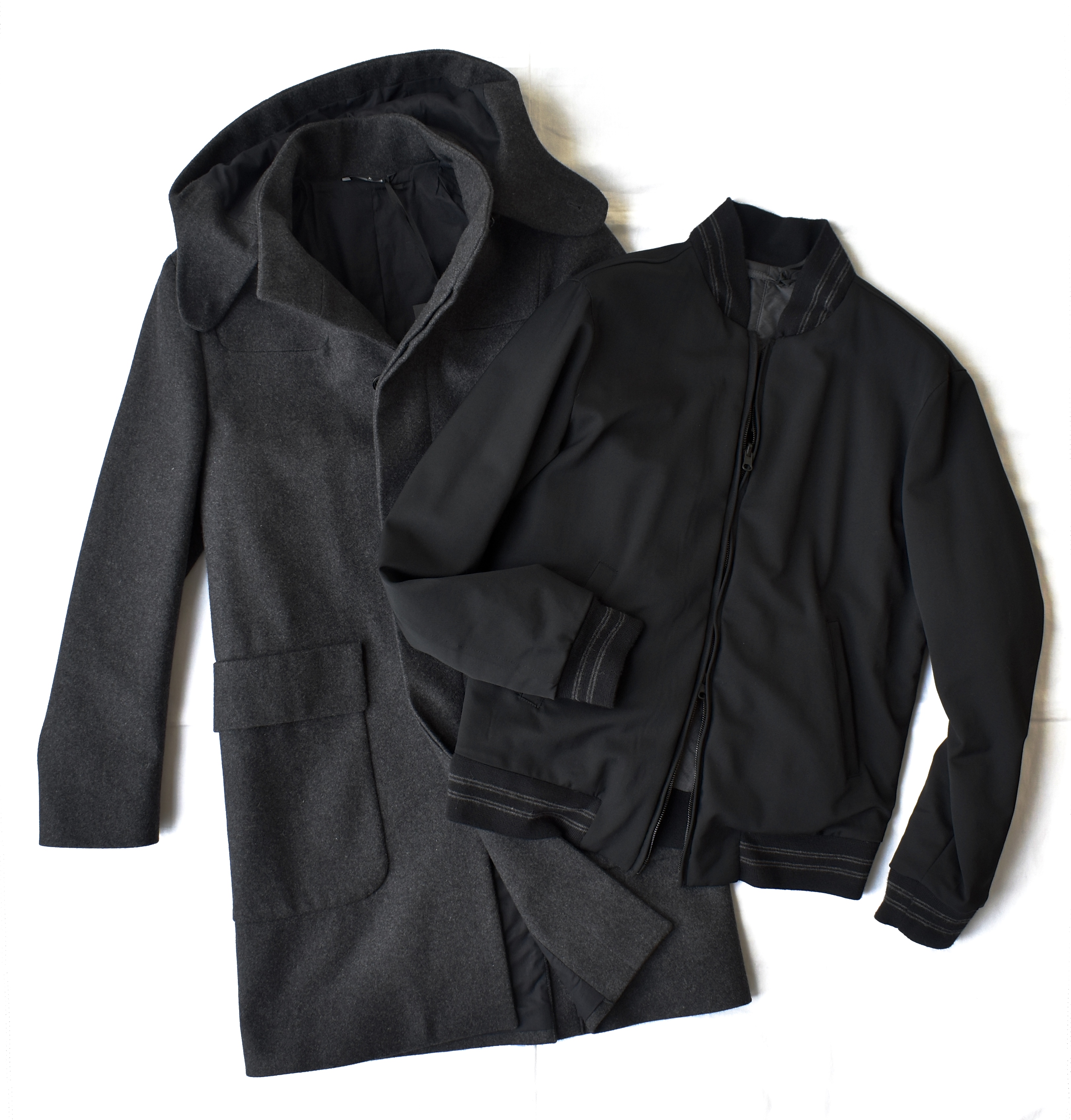 ウール素材のアウターは、品があります。ダッフルコートを基調としたスマートなコート(フードは取外し可能)に、ブラックのウール素材でクールな顔つきのMA-1です。