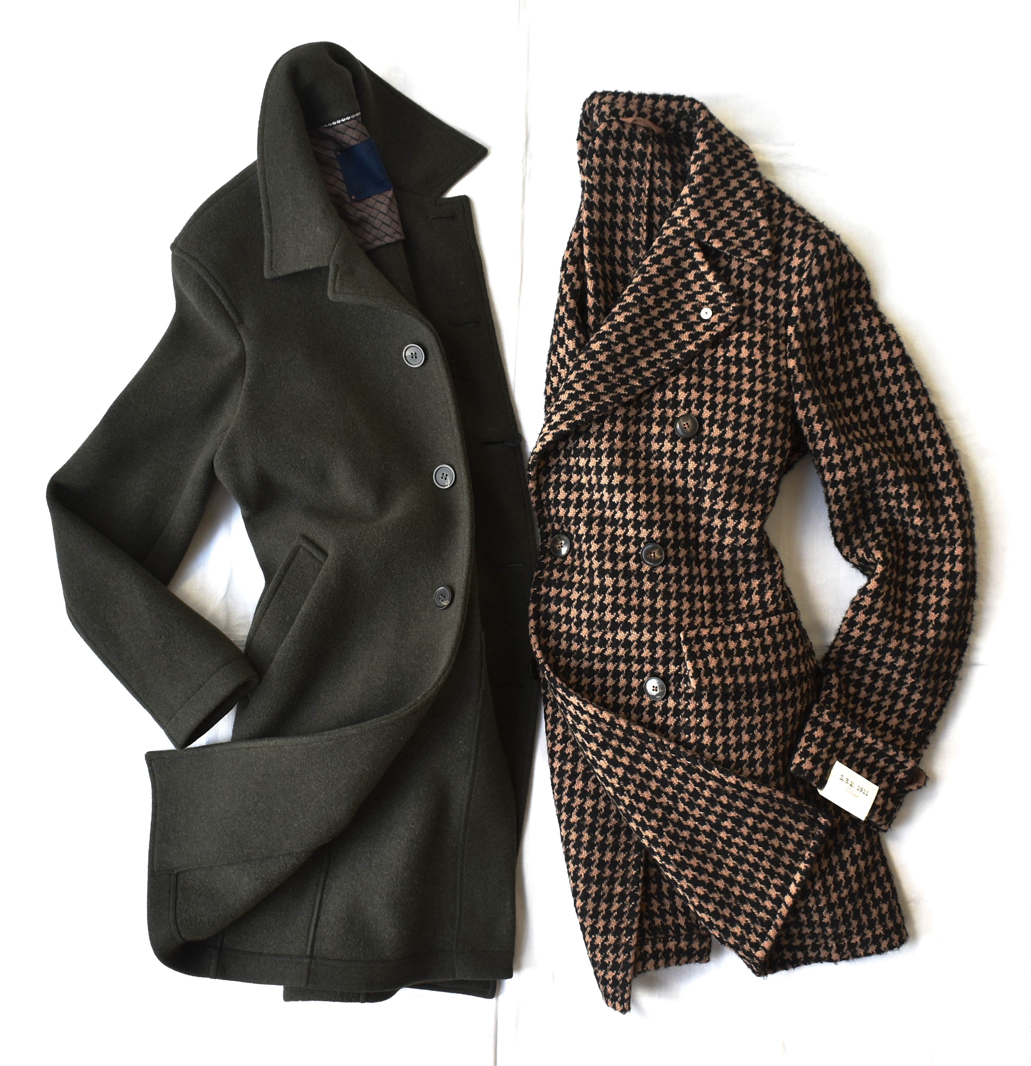 ずいぶん表情の異なる両者ですが、こちらもウール系コート。白スニーカーと気軽に合わせたいオリーブ色のジャージーコートに、クラシック感溢れるポロコート。どちらもイイですね。