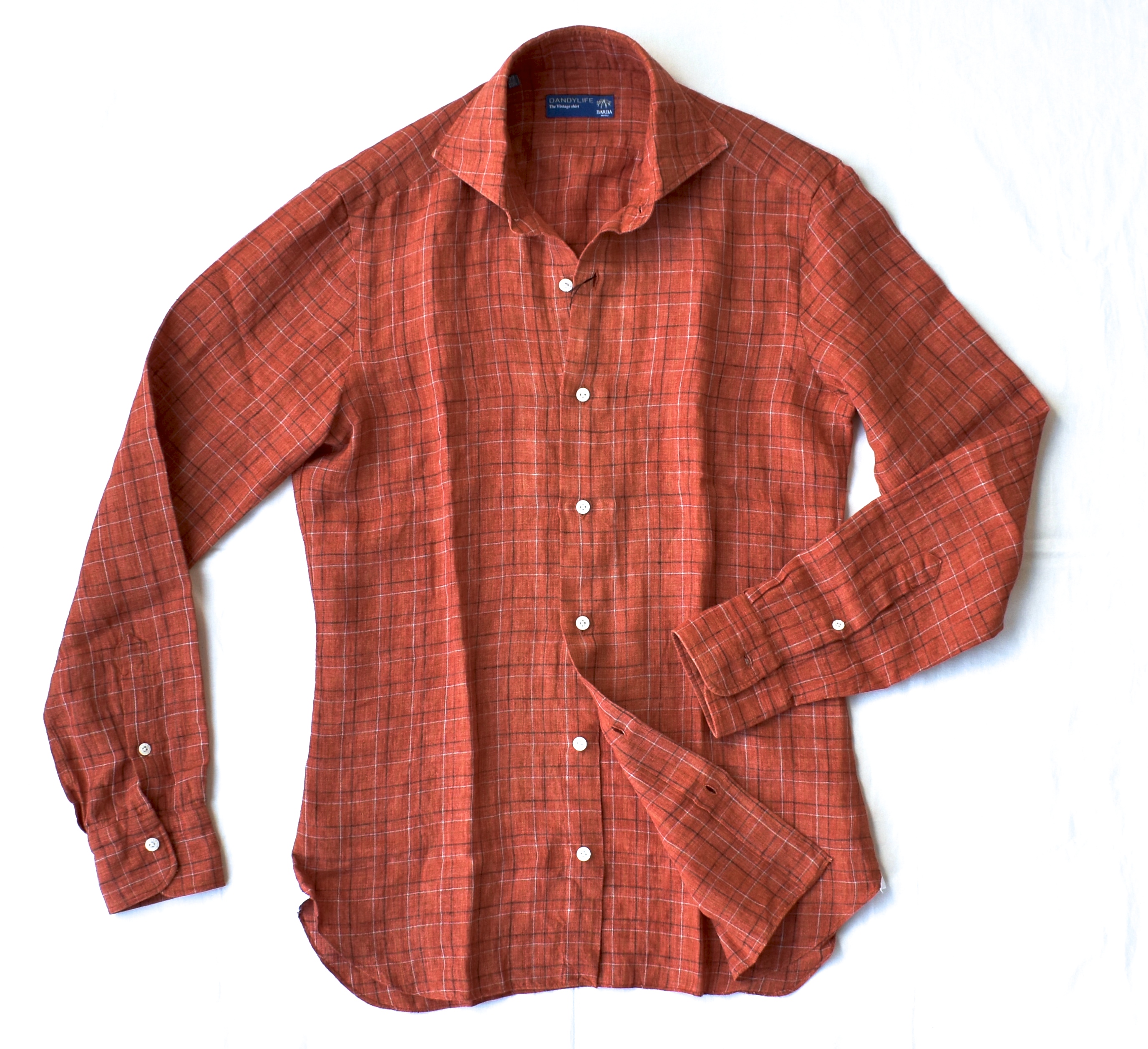 リネン・コットンのチェック柄。リネンの持つ特有な素材(シワ)感に、掠(かす)れた色味が堪りません。オトナな雰囲気が漂う、良いオレンジですね。