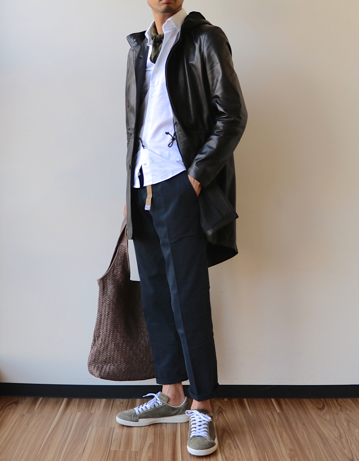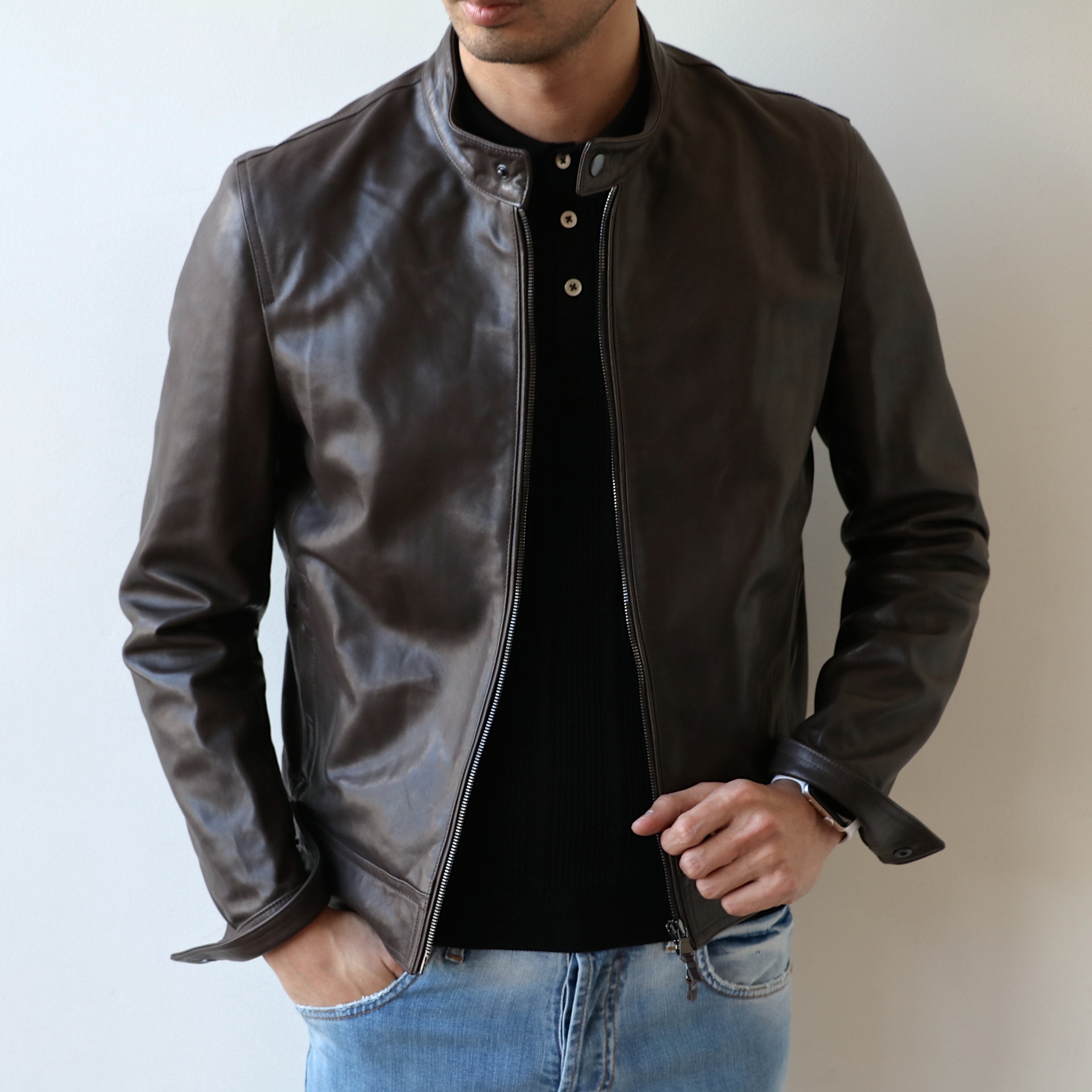 嬉しいことに、マイサイズ(身長183cm・体重67kg・胸囲95cm)の48は完売。46サイズをややタイトめに着ています。「NAPPA SILK」という0.5ミリ厚のしなやかなレザーは、春や秋を中心に大活躍することでしょう。