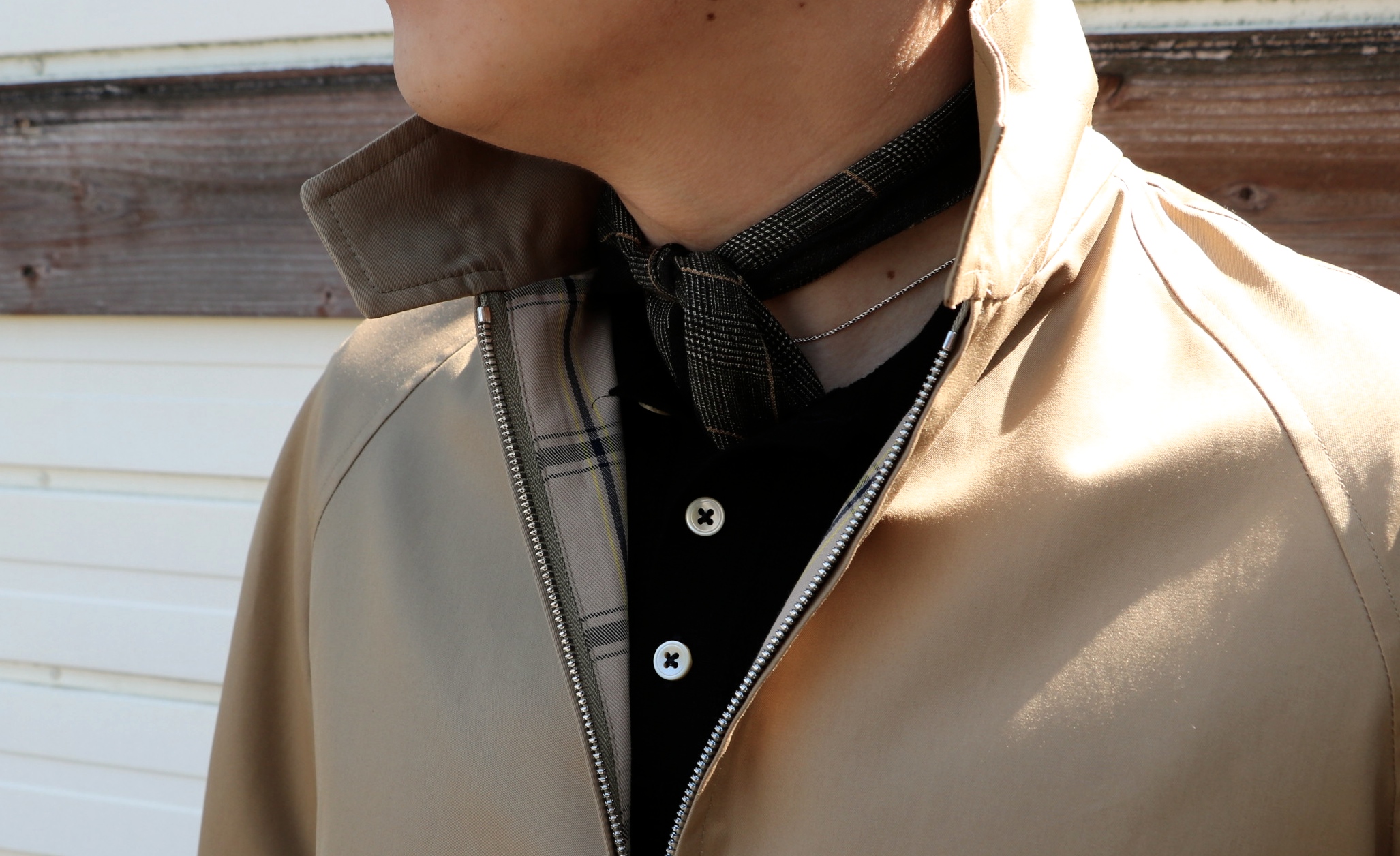 襟を折って寝かせることも出来ますが、立てて着こなすのが自然でしょう。控えめなチェックの裏地は、絶妙のバランスですね。