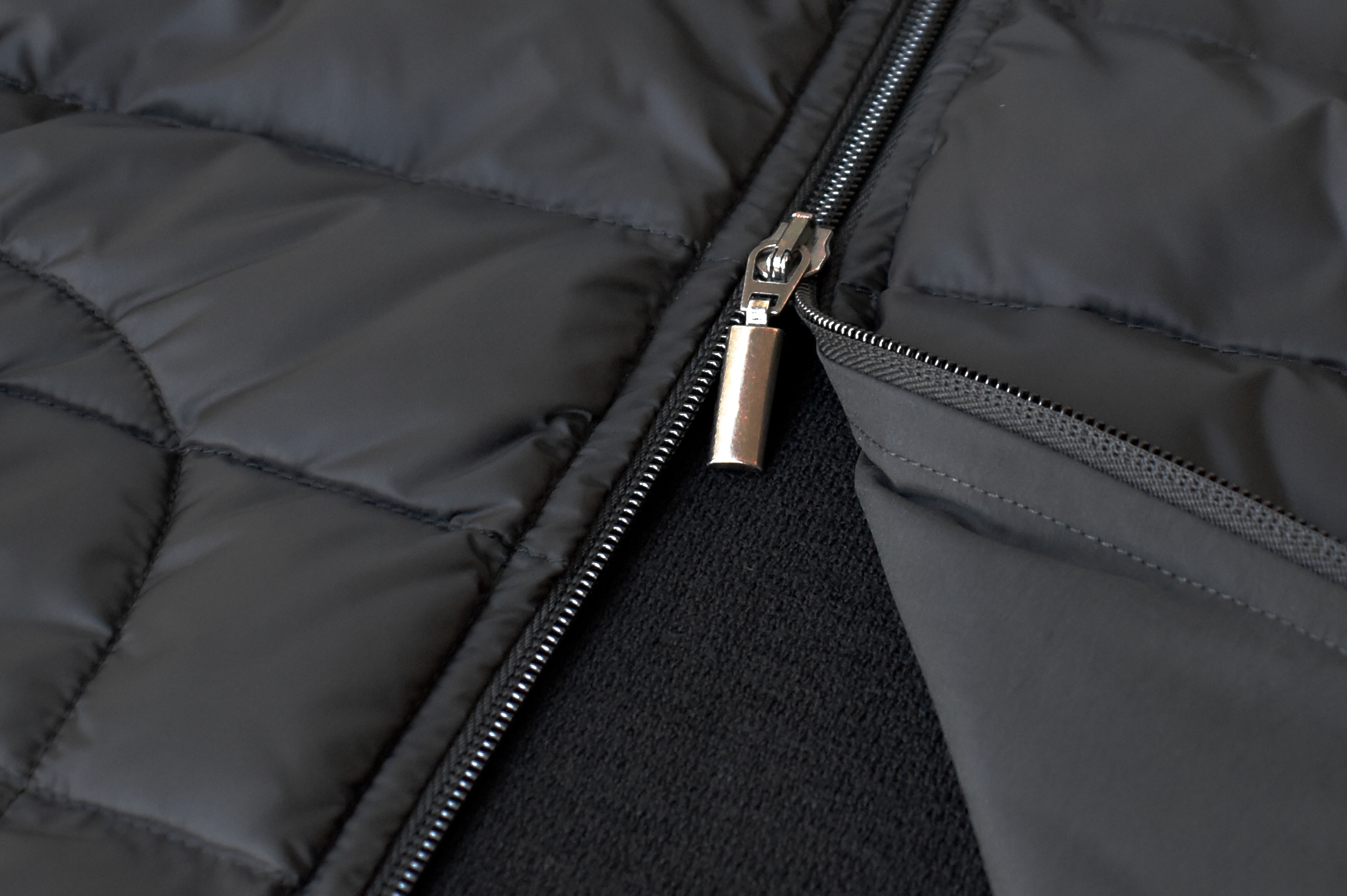 小振りな立ち襟は、ダンディな印象です。ジップを開いた状態で自然に襟が立つように設計されています。前身頃はダウン、後ろ身頃と袖・襟はメリノウールのニット...という配置になっています。