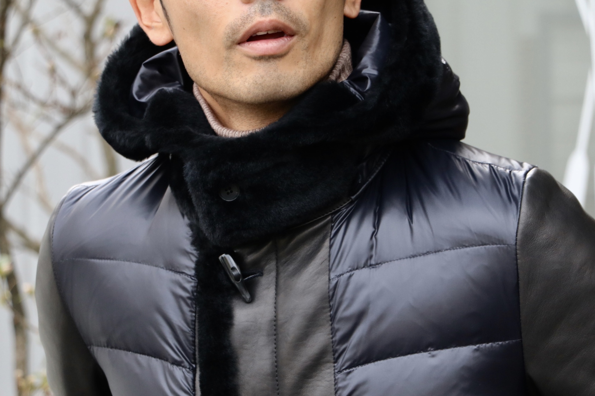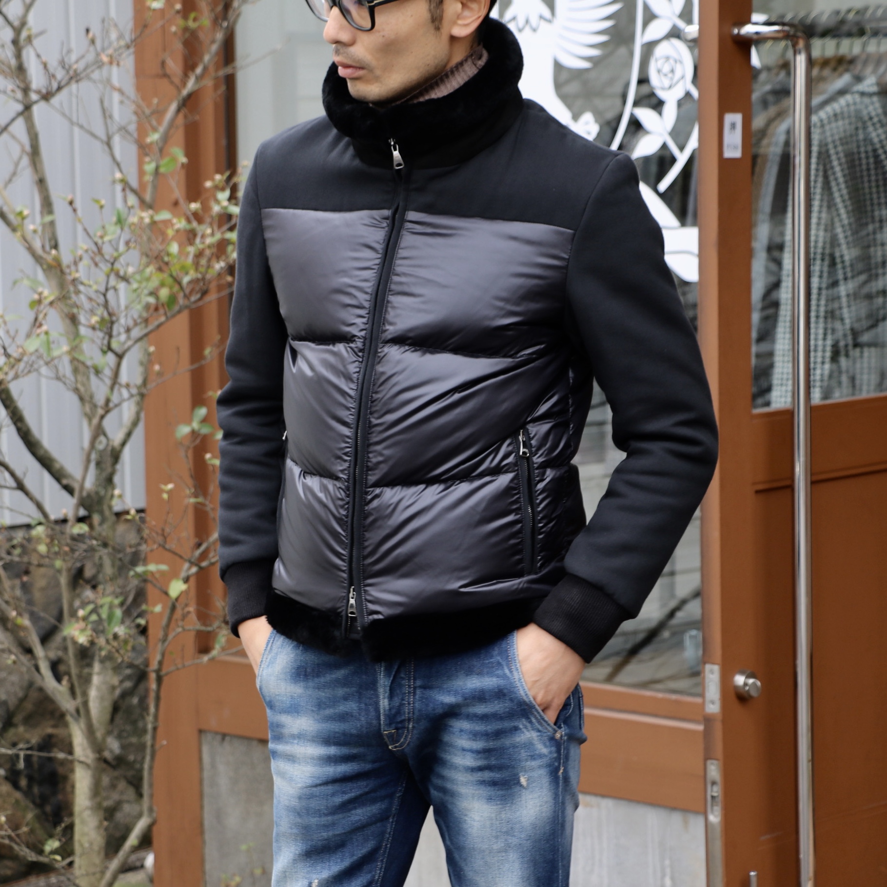 こちらは、ムートンダウンのコート。お尻が覆われる程度の丈感に、前はトグル&ジップによる開閉システム。黒のムートン、ネイビーブラックのナイロンダウン、黒のナッパレザーによるトリオです。エンメティのブランド広告のような、抜群に存在感のあるモデルです。