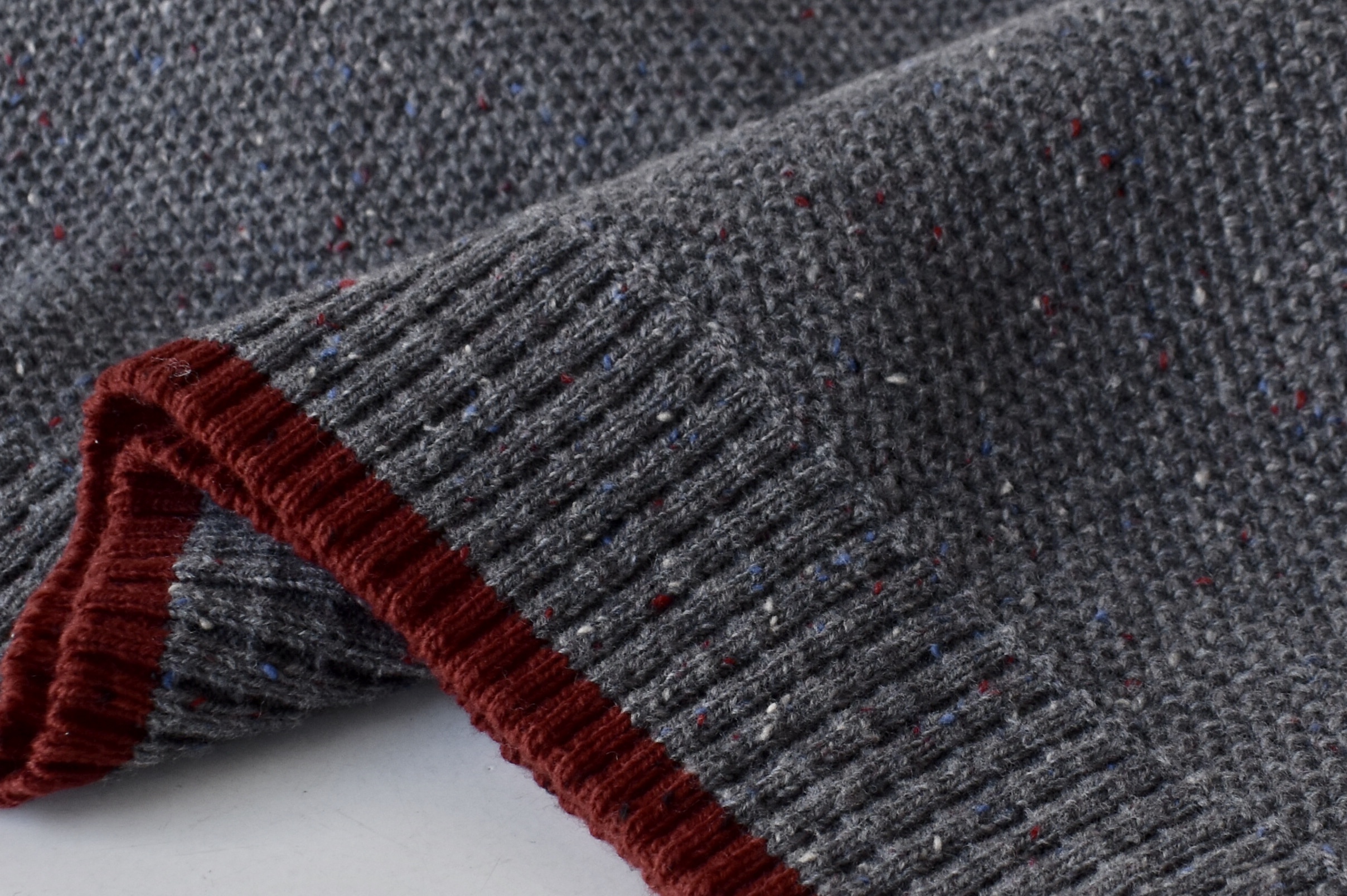 まず、Vネックです。襟・裾・袖口のリブ編み&ダークレッドの差し色が、ちょっとしたアクセントに。ややざっくりとした編み時は、ライトグレイ。無造作にブルー、オリーブ、薄いオレンジのカラーネップが顔を出し、絶妙な風合いをアピールしてくれます。