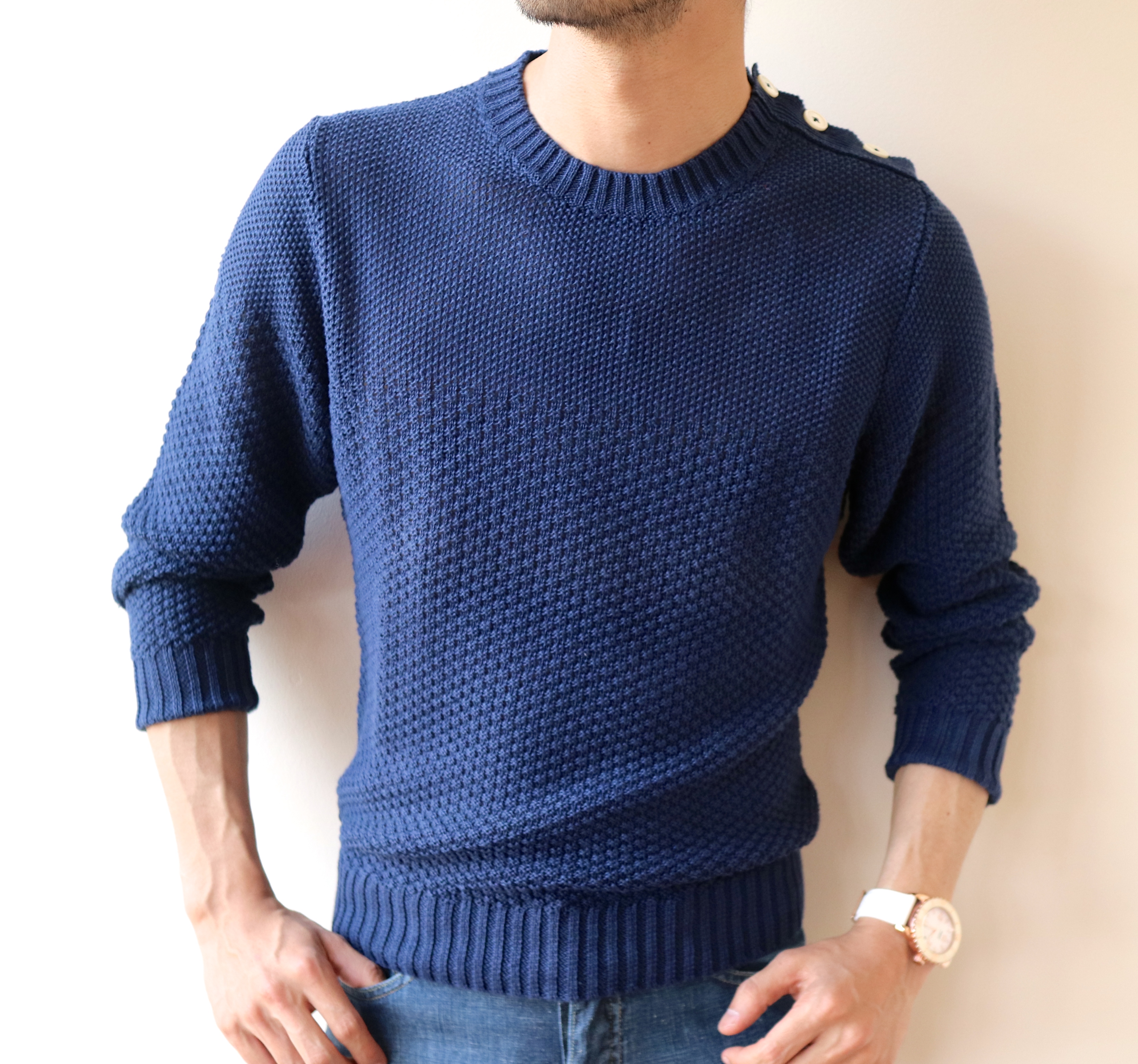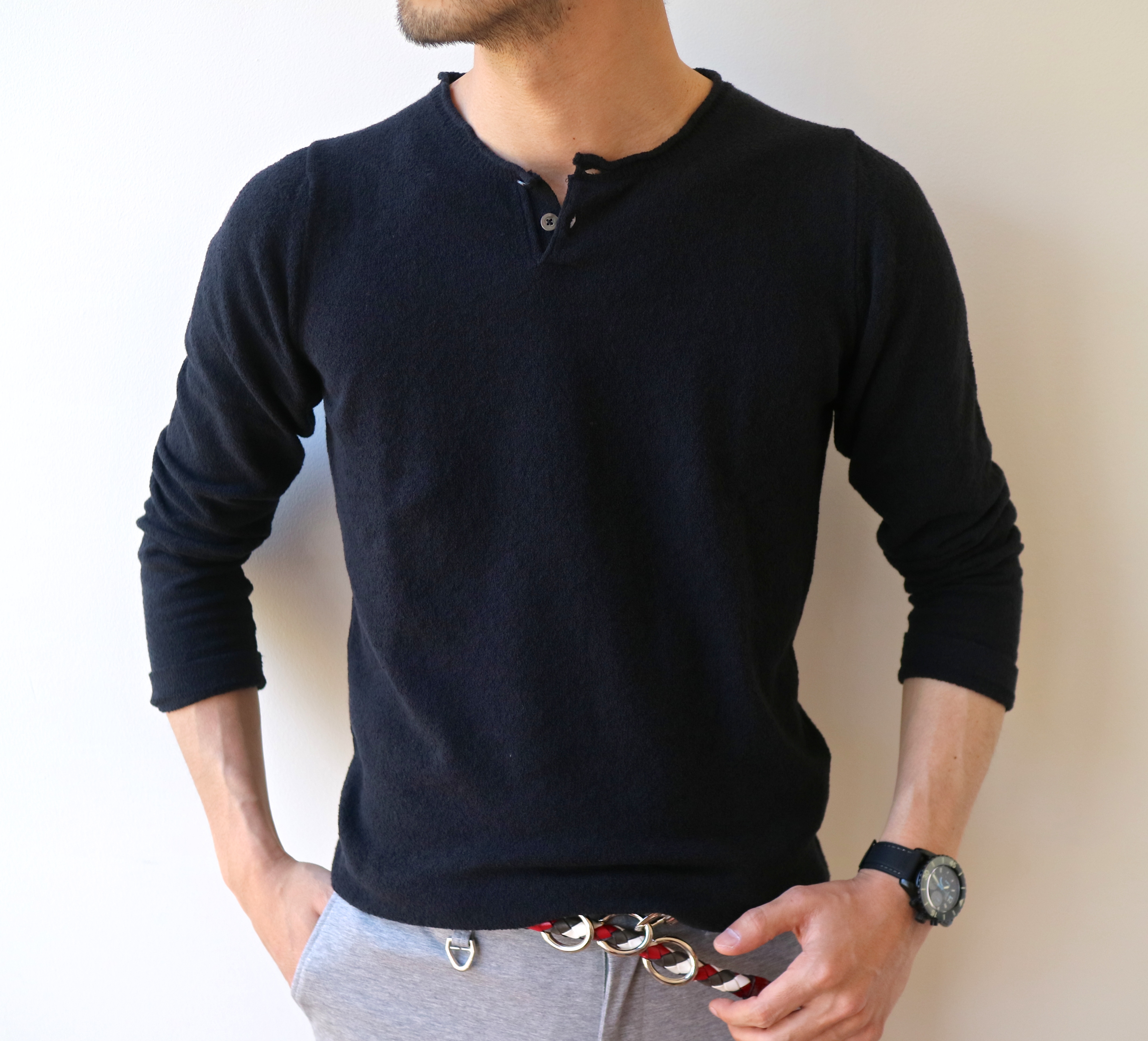 上質なタオルのような編み地に、小振りな開き具合のヘンリーネックのニット。これからの時期、腕捲くりをして着用すれば、それだけで充分絵になるはずです。