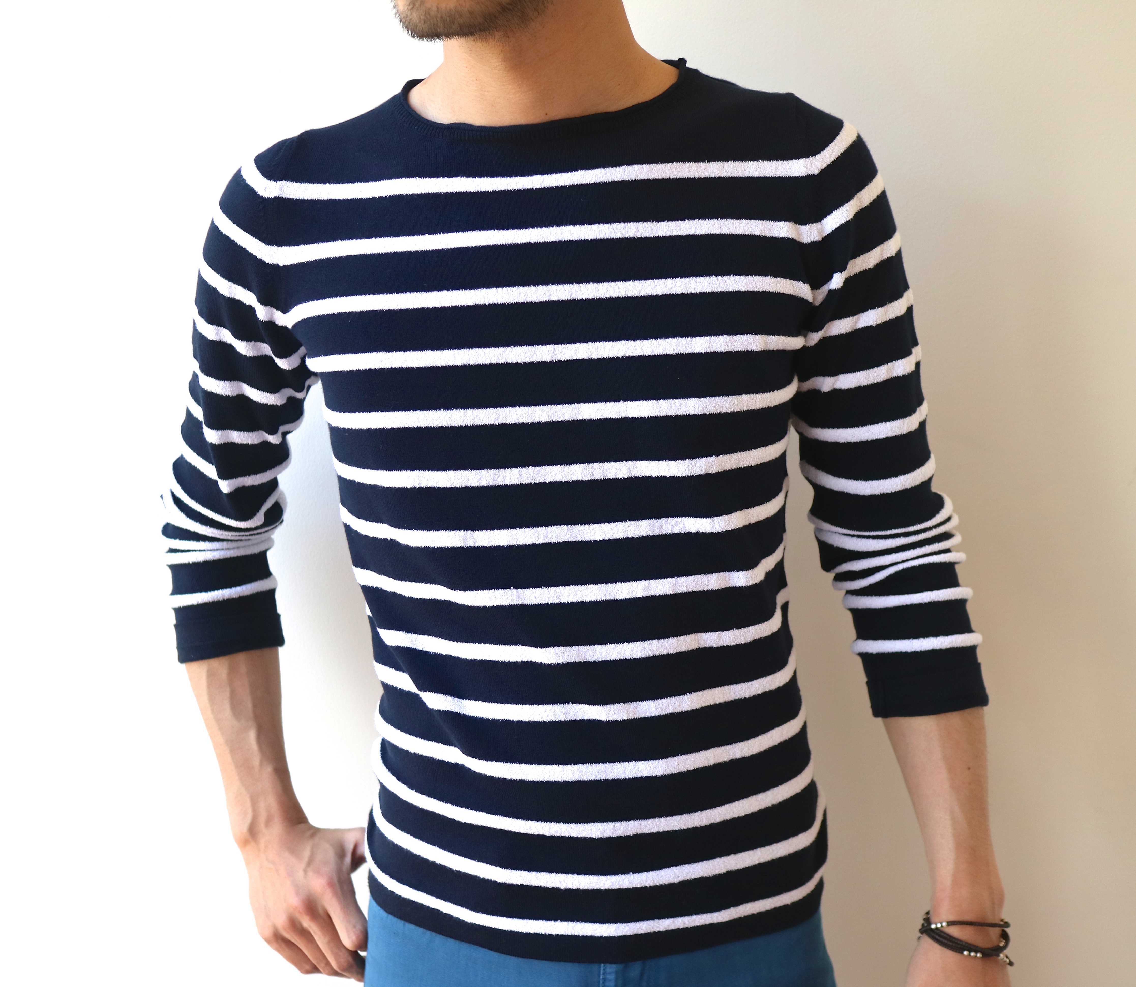 ボーダー派、もしくはボーダーにトライしたい派の貴方には、ボーダー部分にパイル調の編み地を配した1枚を。さり気なくも、確信犯的な変化付けが光ります。