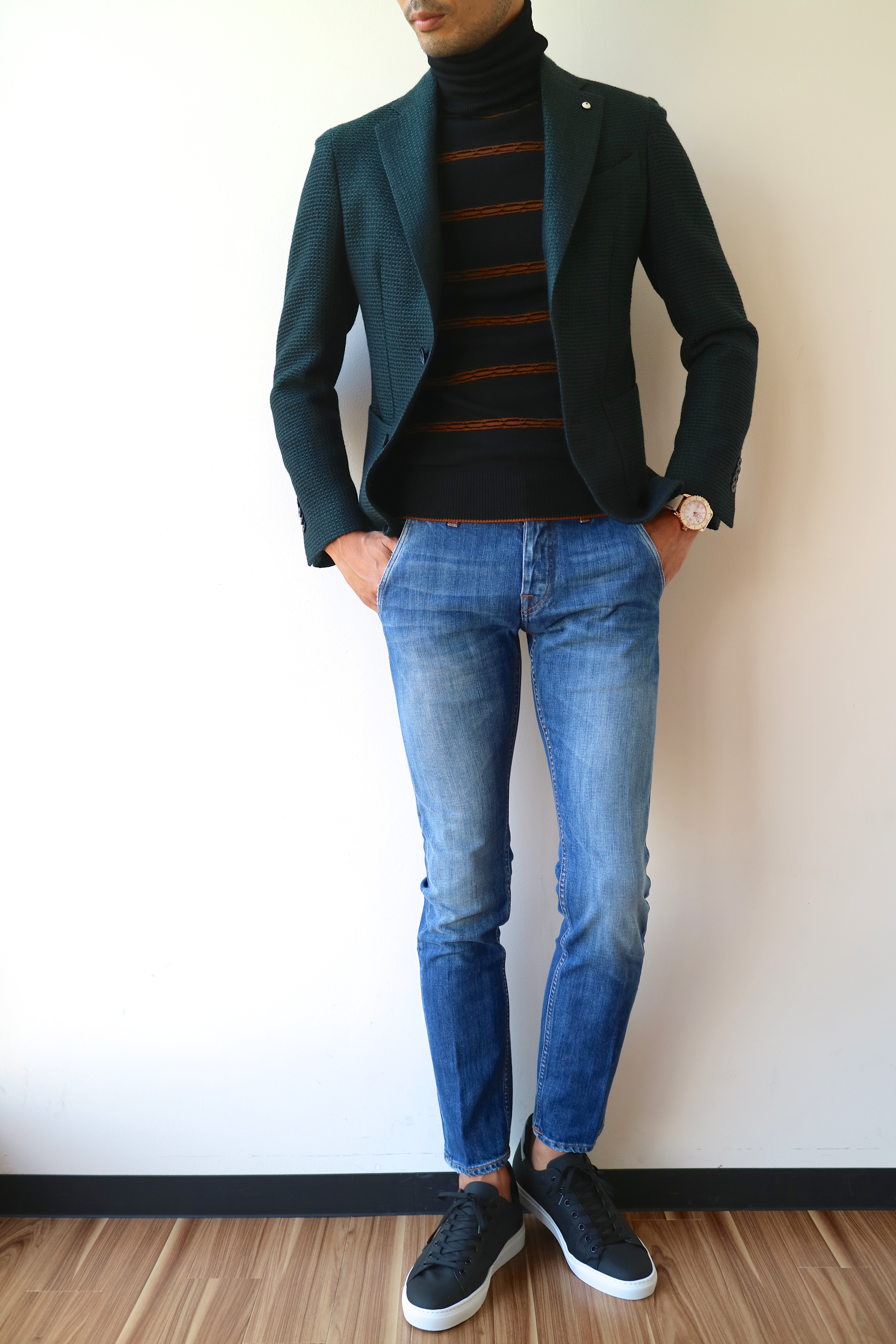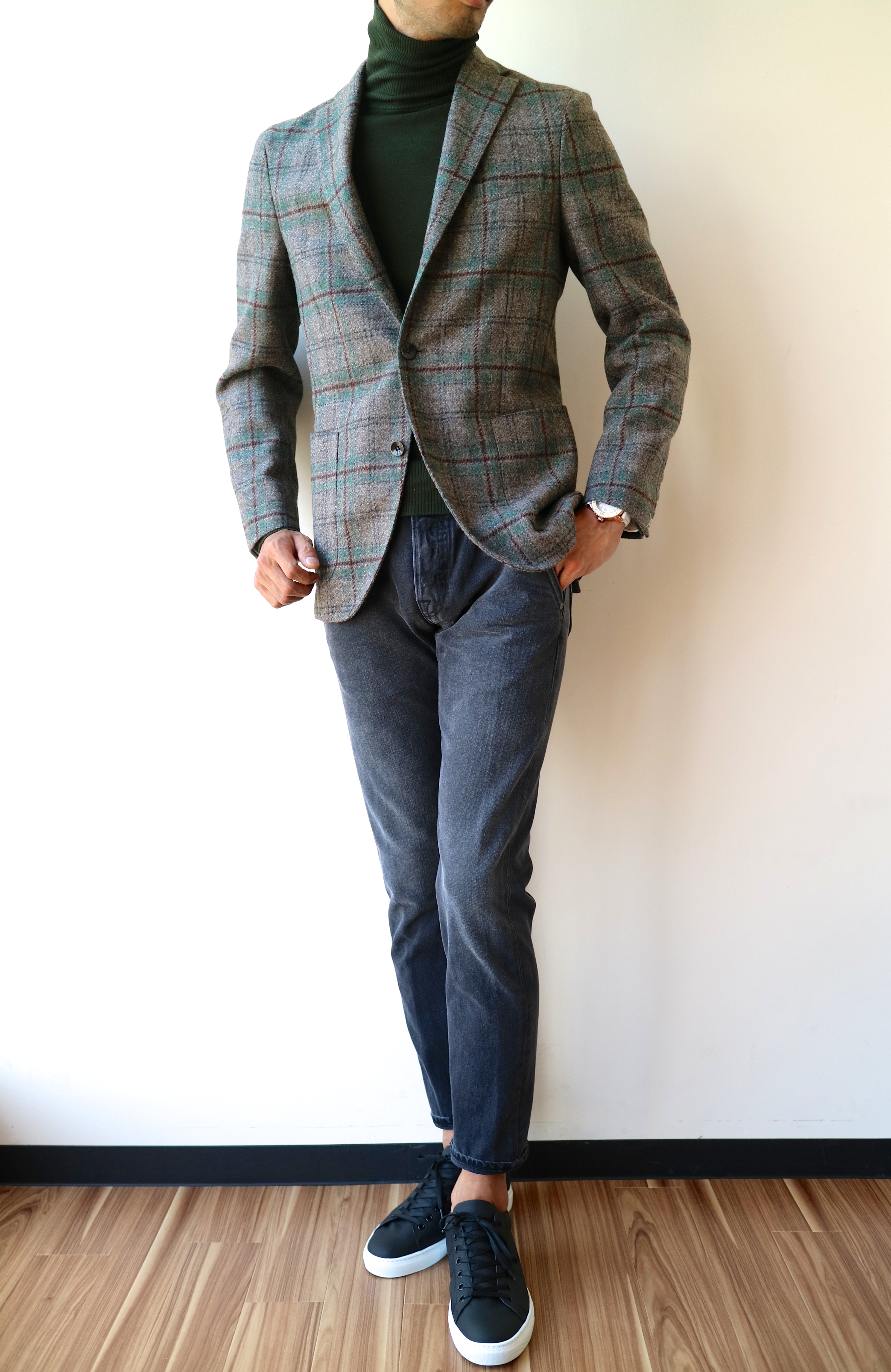 ジャケットのインに、タートルネック。凝った組み合わせではないのに、不思議と雰囲気が出る、個人的に大好きな組み合わせです。ジャケットはBOGLIOLIのDOVERを、パンツはCare labelのslack 352、靴はKEPTをピックアップしました。