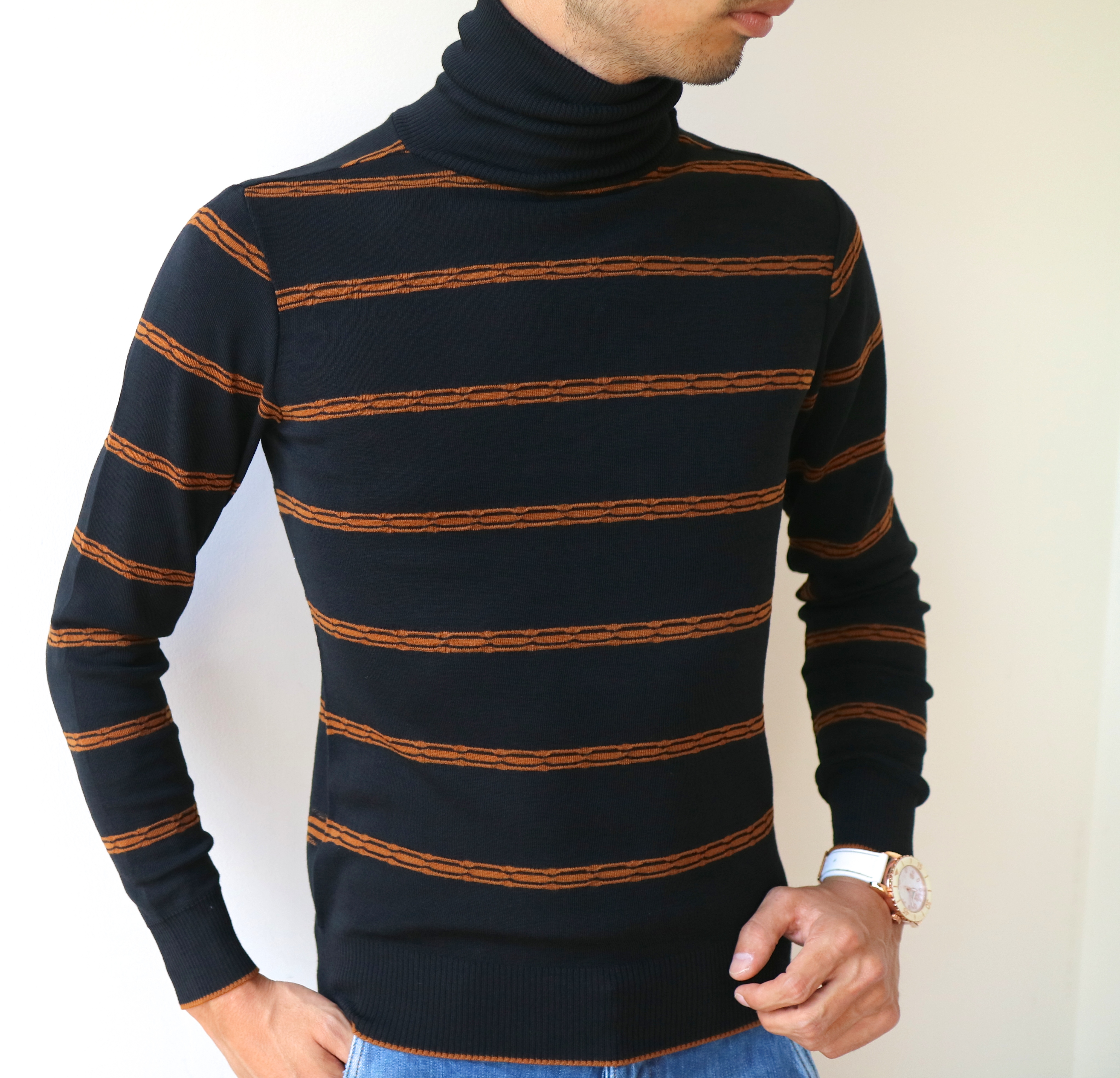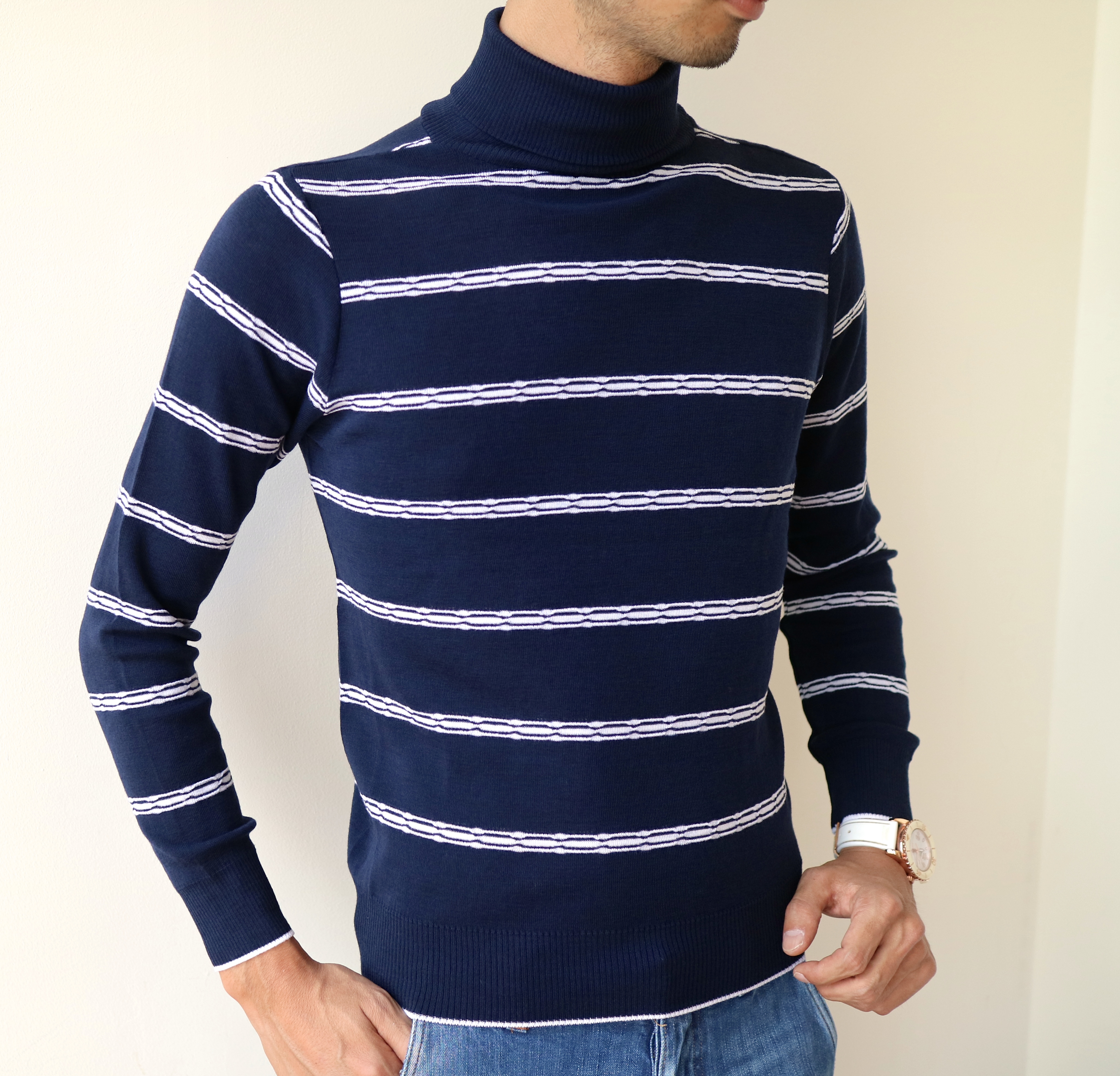 MODEL:「LT573」変則ボーダー柄 ハイゲージタートルネックニット