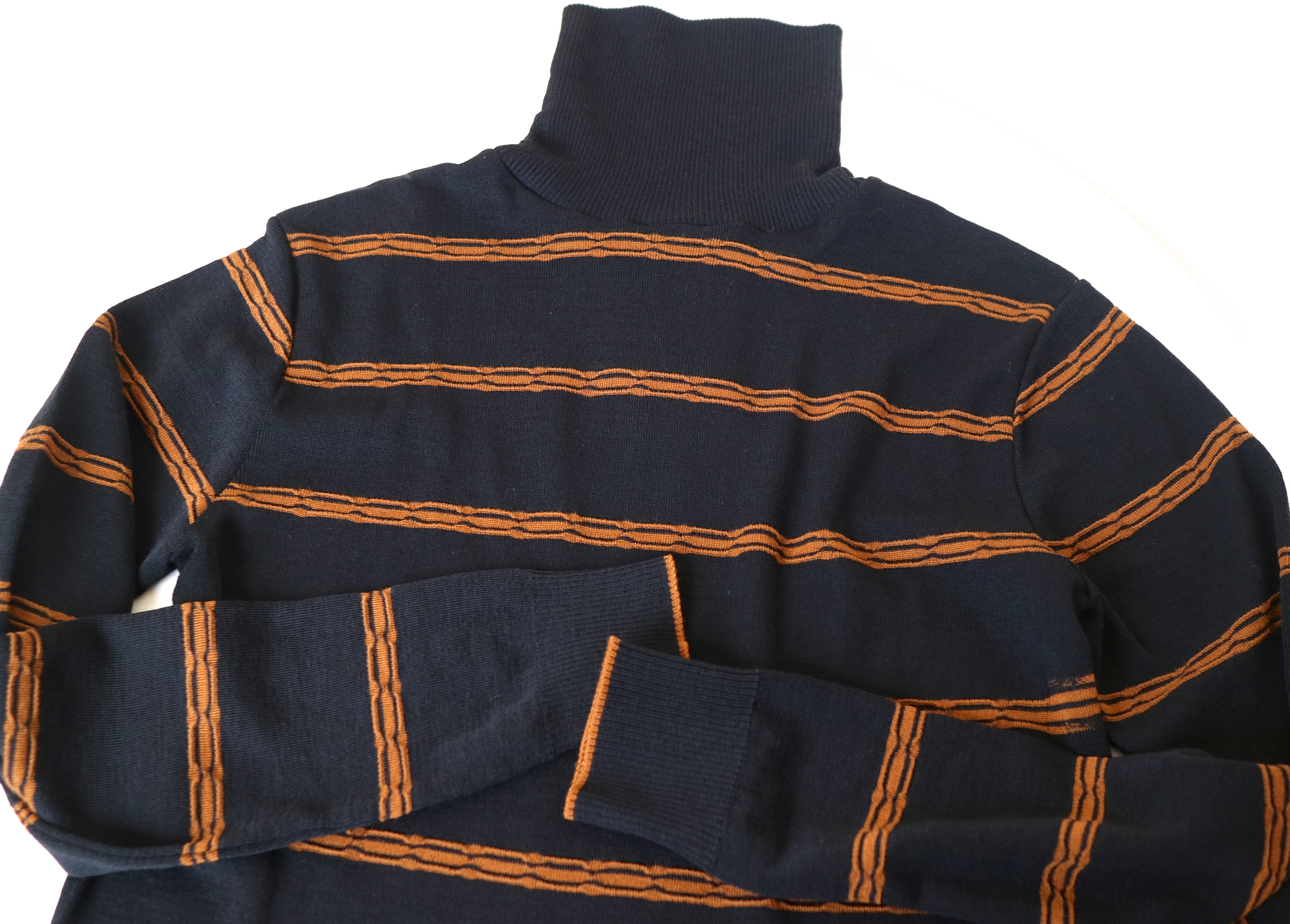 同じくハイゲージで無地のタートルネックもご用意しております。軽く・さらりとした質感、そしてよく伸びる編み地の感触は、前述のボーダー柄と同様です。