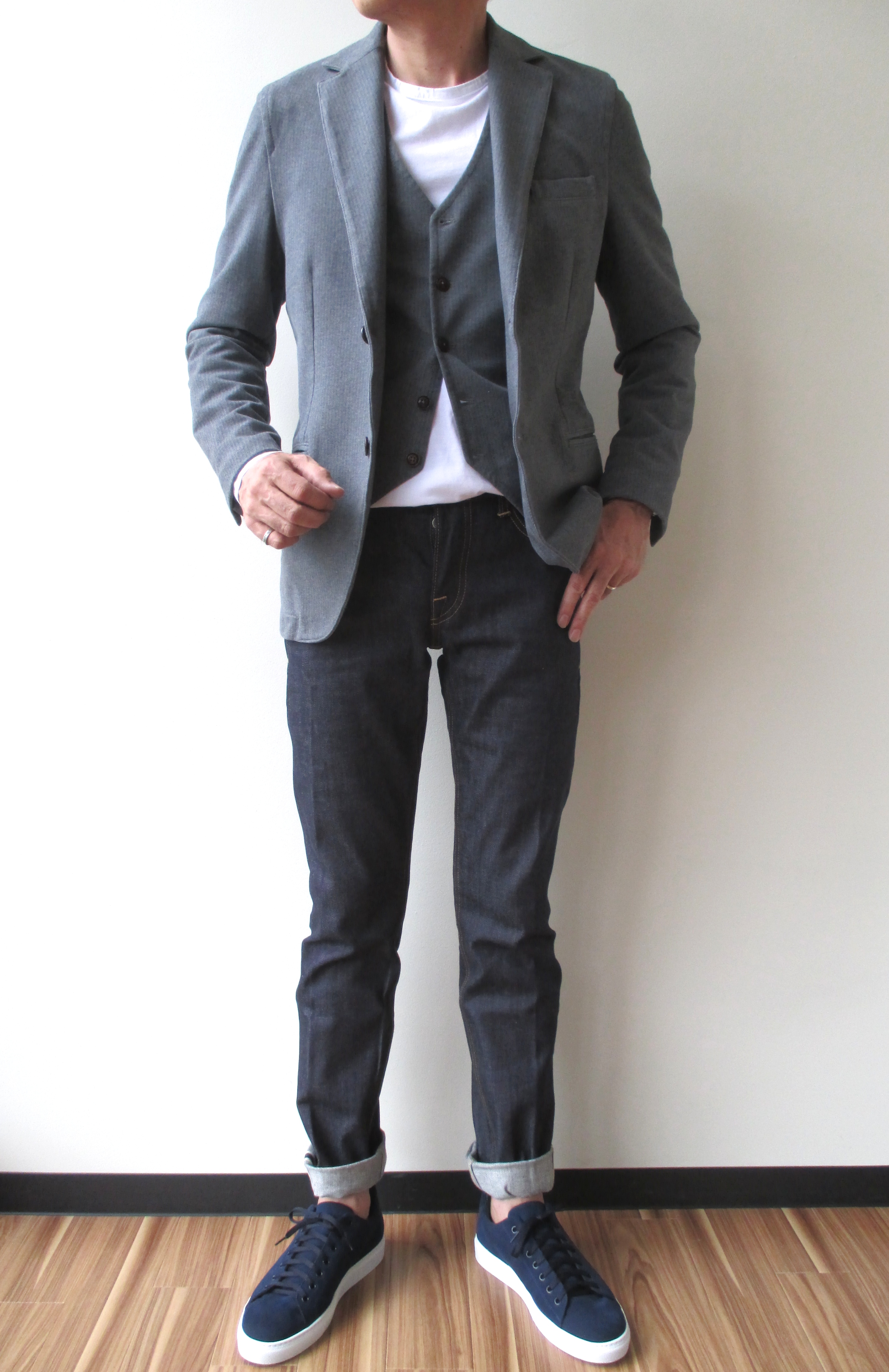デニムに合わせてみました。カジュアル感を出しつつ、モノトーンのグレーカーディガンとブラックシャツでシックにみせる作戦でしたが・・・