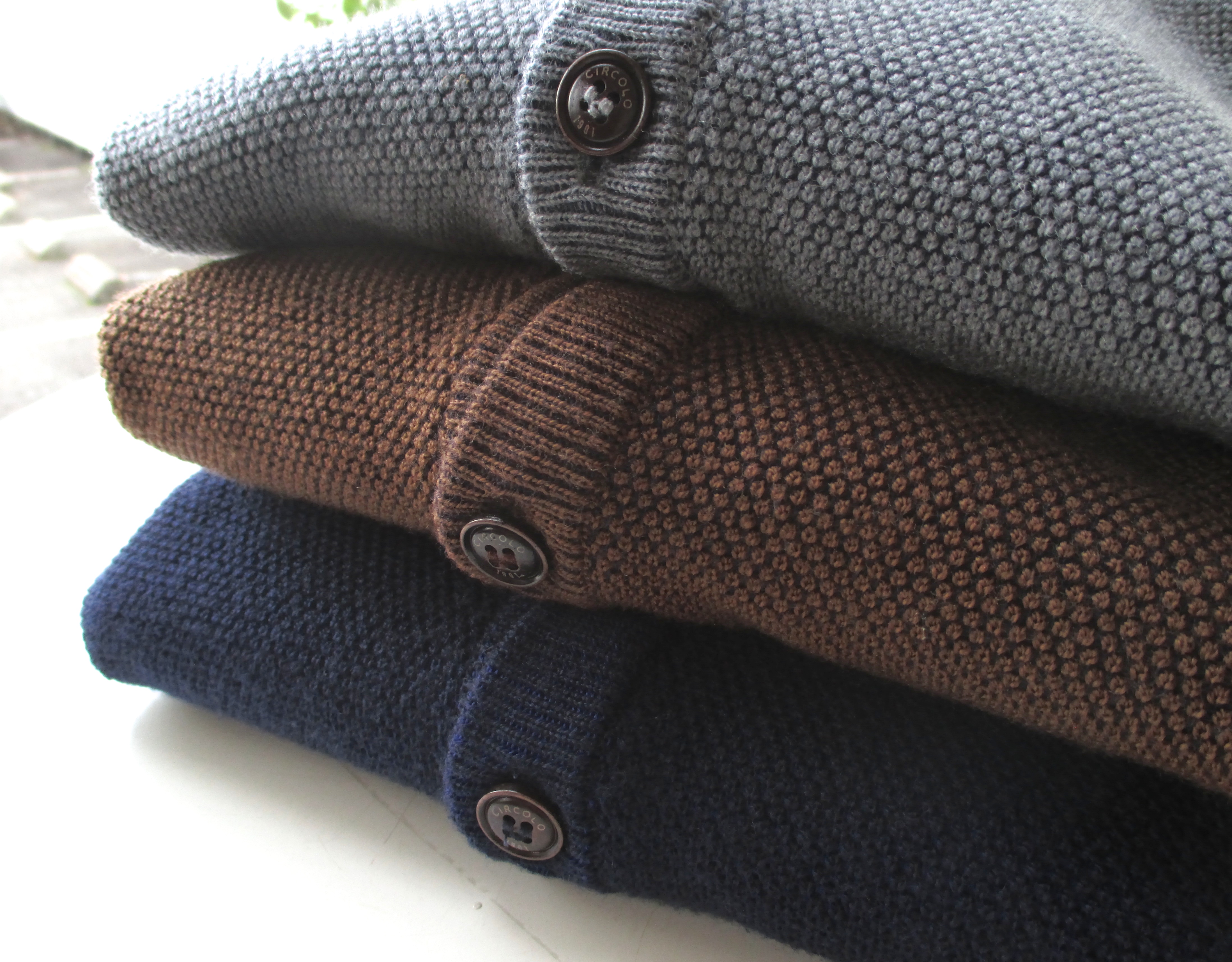 秋冬の立ち上がりから春先まで長い付き合いのできそうな予感がする、ウール・コットンのカーディガン。注目したいのが、凹凸感がつけられたニット地。よ〜く見ると、ネイビーには明るいブルーの糸が、ブラウンにはブルーの糸が、そしてグレイッシュブルーにもブルーの糸が編み込まれています。ユニーク(独特)な表情付けに抜かりはないという、チルコロらしい仕上がりです。