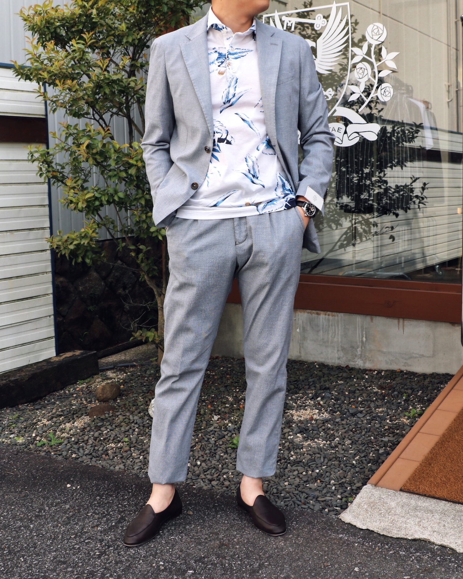 ノスタルジックな雰囲気を意識したコーディネートにしてみました。ベージュのセットアップは持っていないので、日常で着用したことはないですが、僕のイメージは抜け感を取り入れながら合わせるのがしっくりきます。開襟シャツですが、襟は外に出さず着用し、すっきりとした印象に。ジャケットを脱いでも物足りなくなってしまうことはなく、シャツ1枚でも洒脱に魅せてくれるので夏の柄シャツは重宝します。
