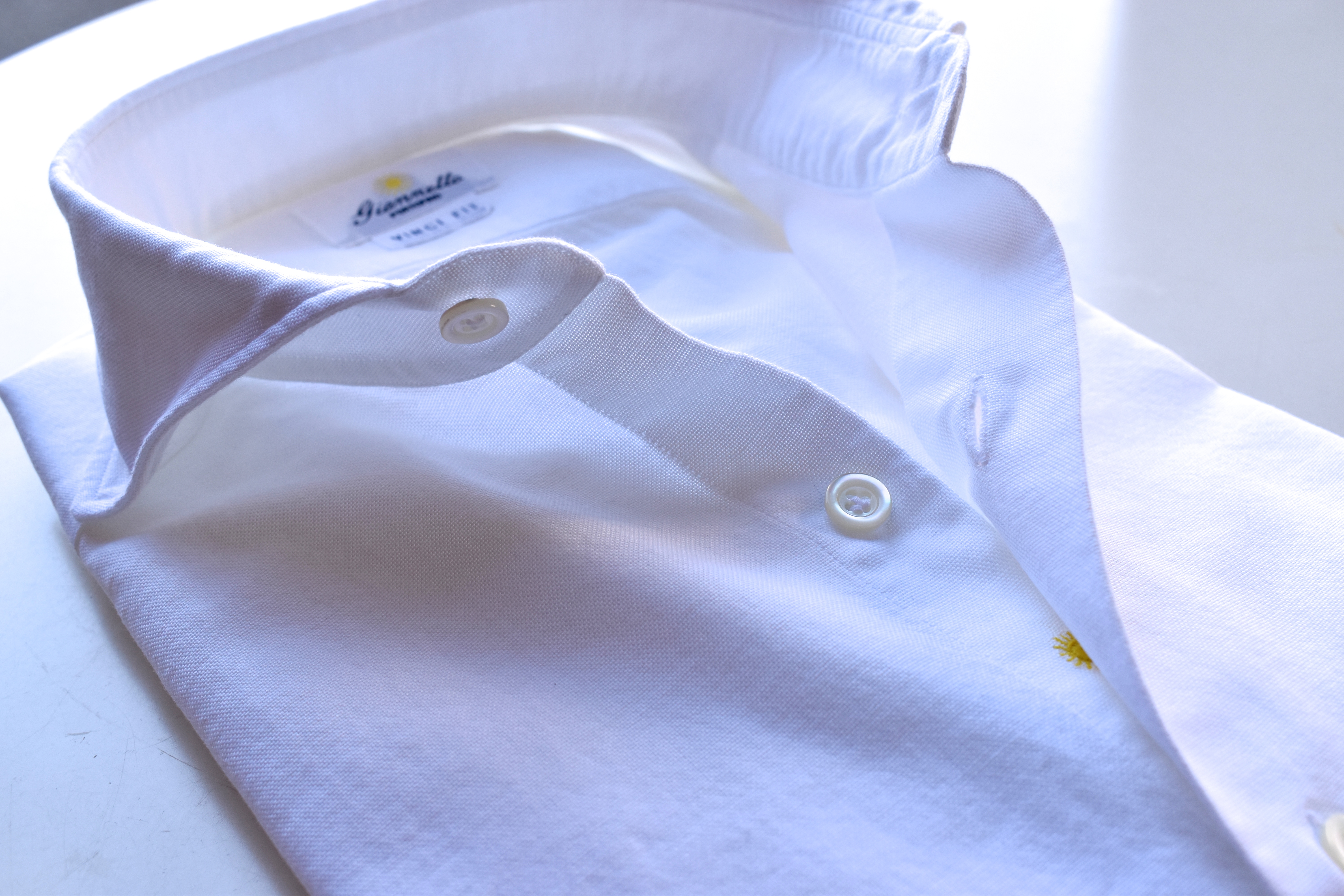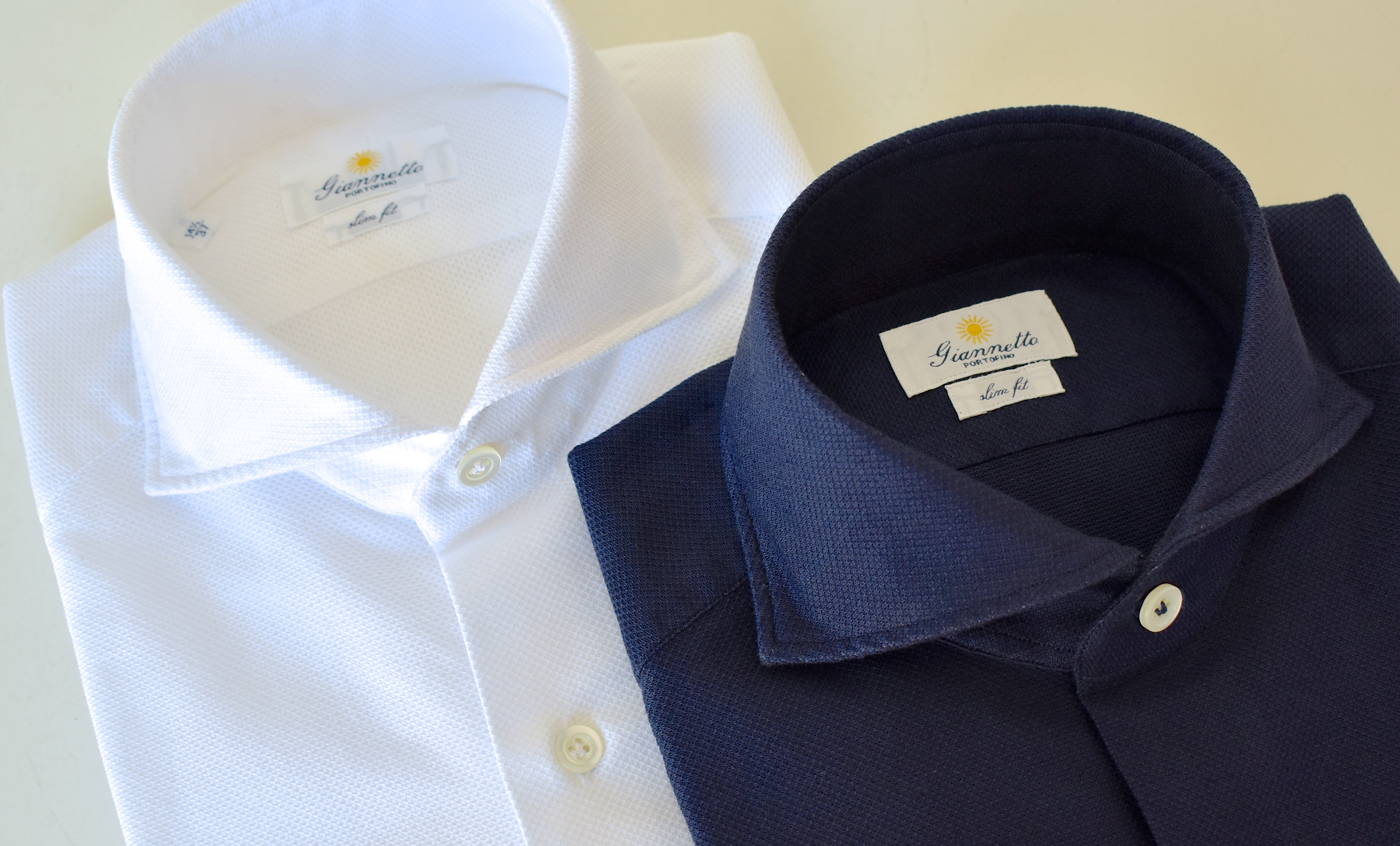 引き続き、【Giannetto/ジャンネット】のシャツシリーズをご紹介していきます。昨日のご案内でトップバッターに選んだのは、春らしいストライプシャツに、凝ったジャカード地。今日は、定番から入りましょう。