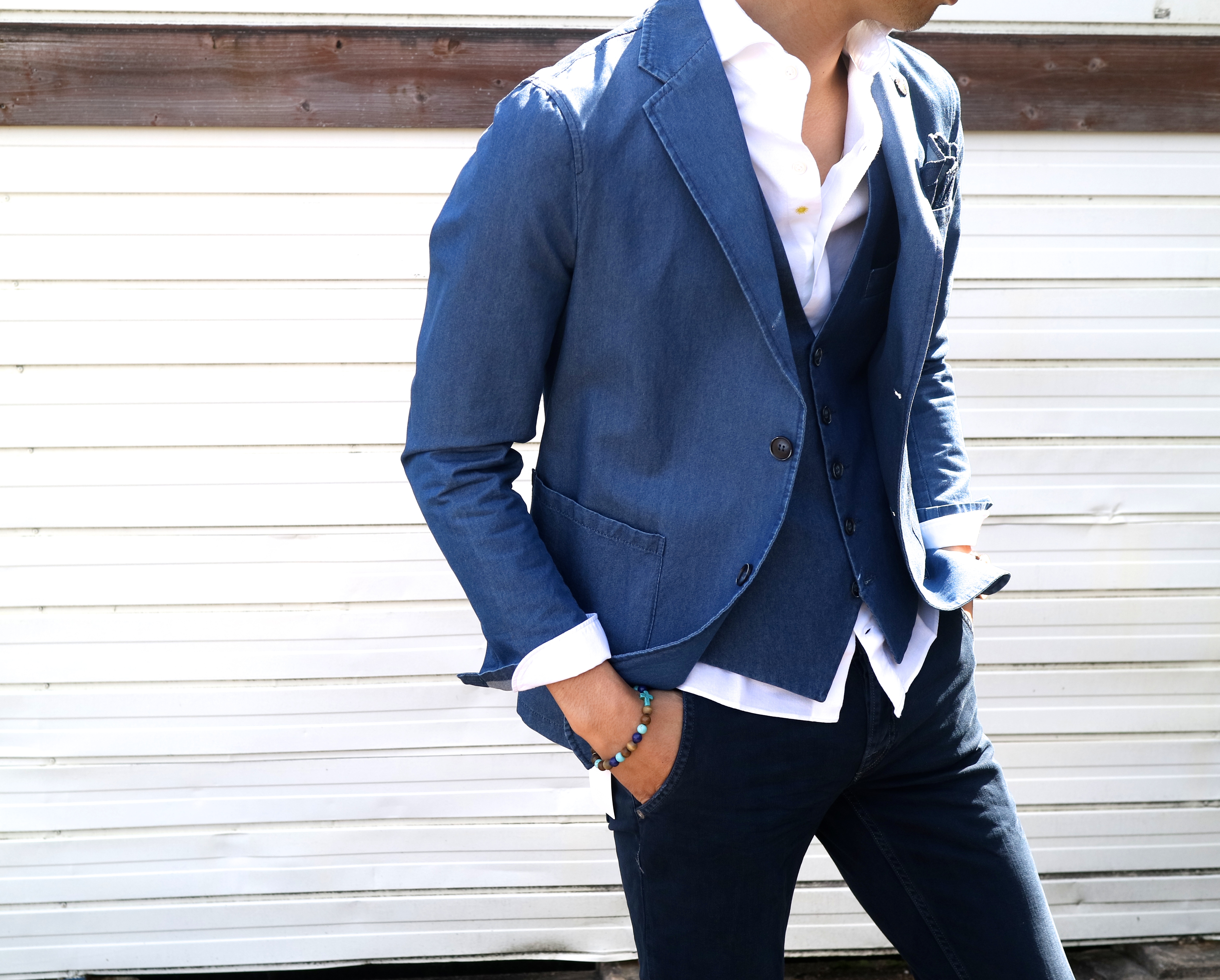 デニムのシャツ地を使ったシャツジャケットに、チーフ付きのテイラードジレ。南イタリアのシャツファクトリー・ジャンネットの世界観、この春夏に存分に味わってみては如何でしょうか。