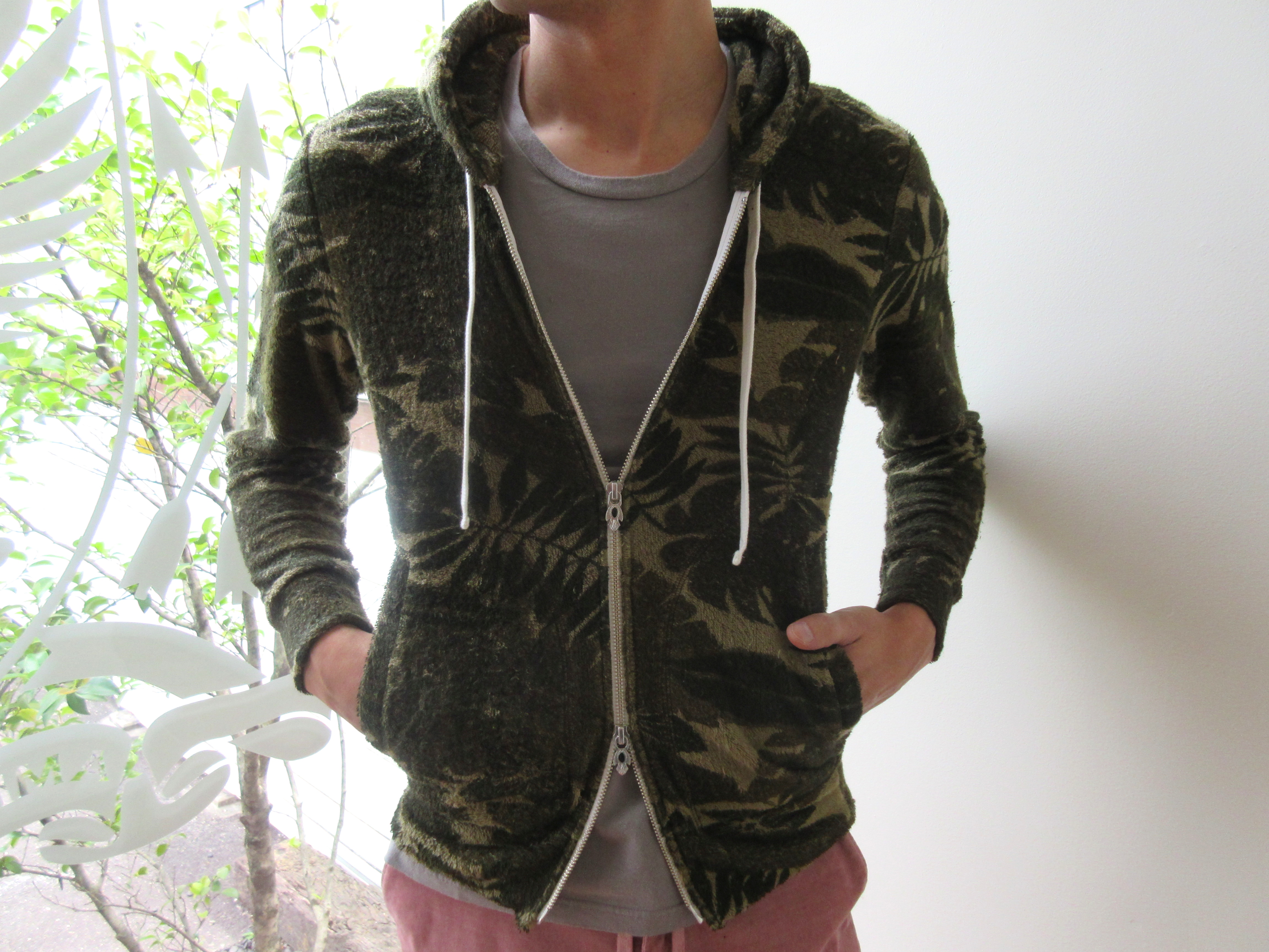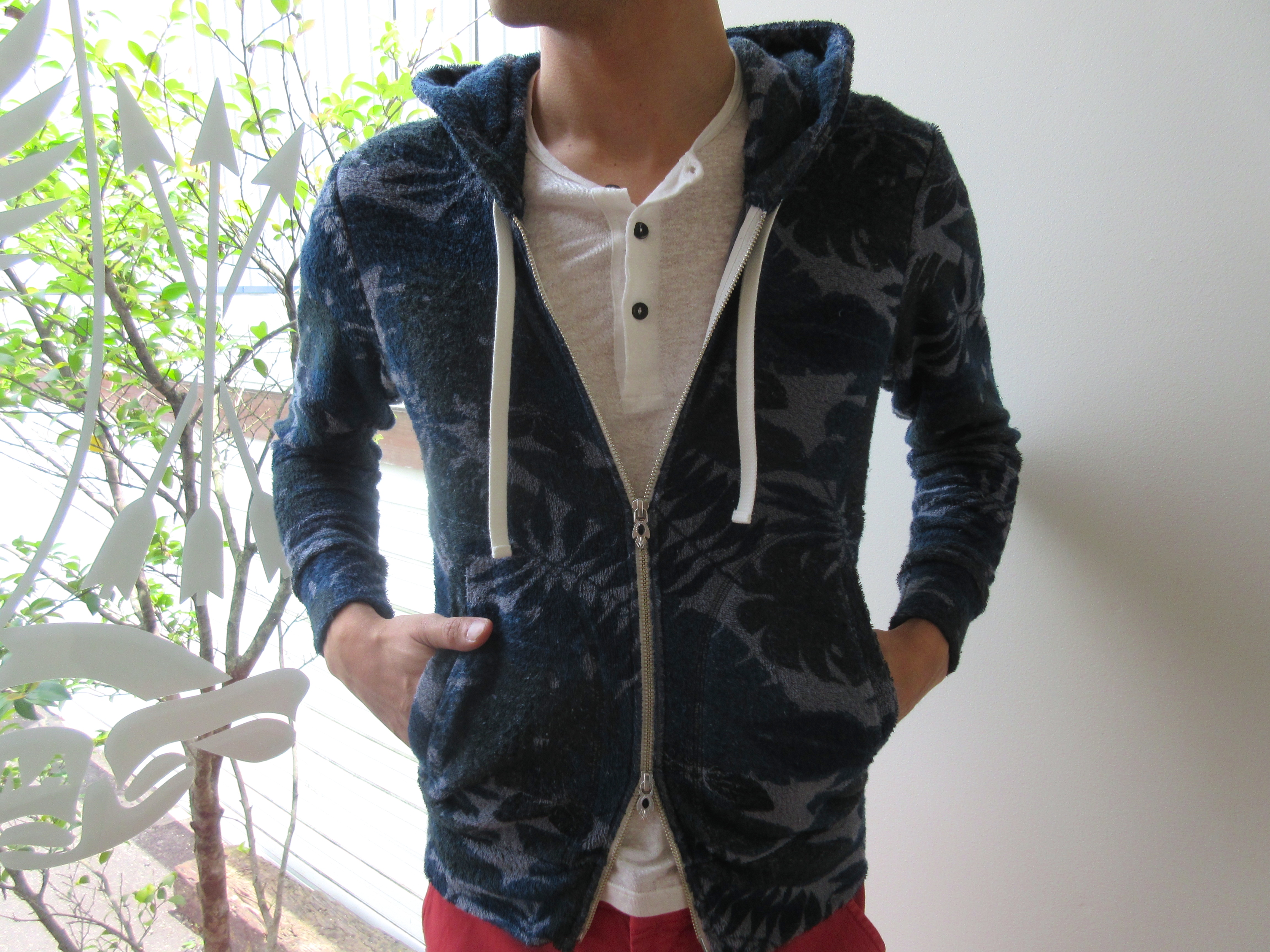 独特のリラックス感と触り心地の良さで人気のあるパイル地のジップアップパーカーは、同系統のボタニカル柄が巧く溶け込んだ、守備範囲の広そうな仕上がりです。写真の様な差し色的なカラーとも仲良くやってくれます。