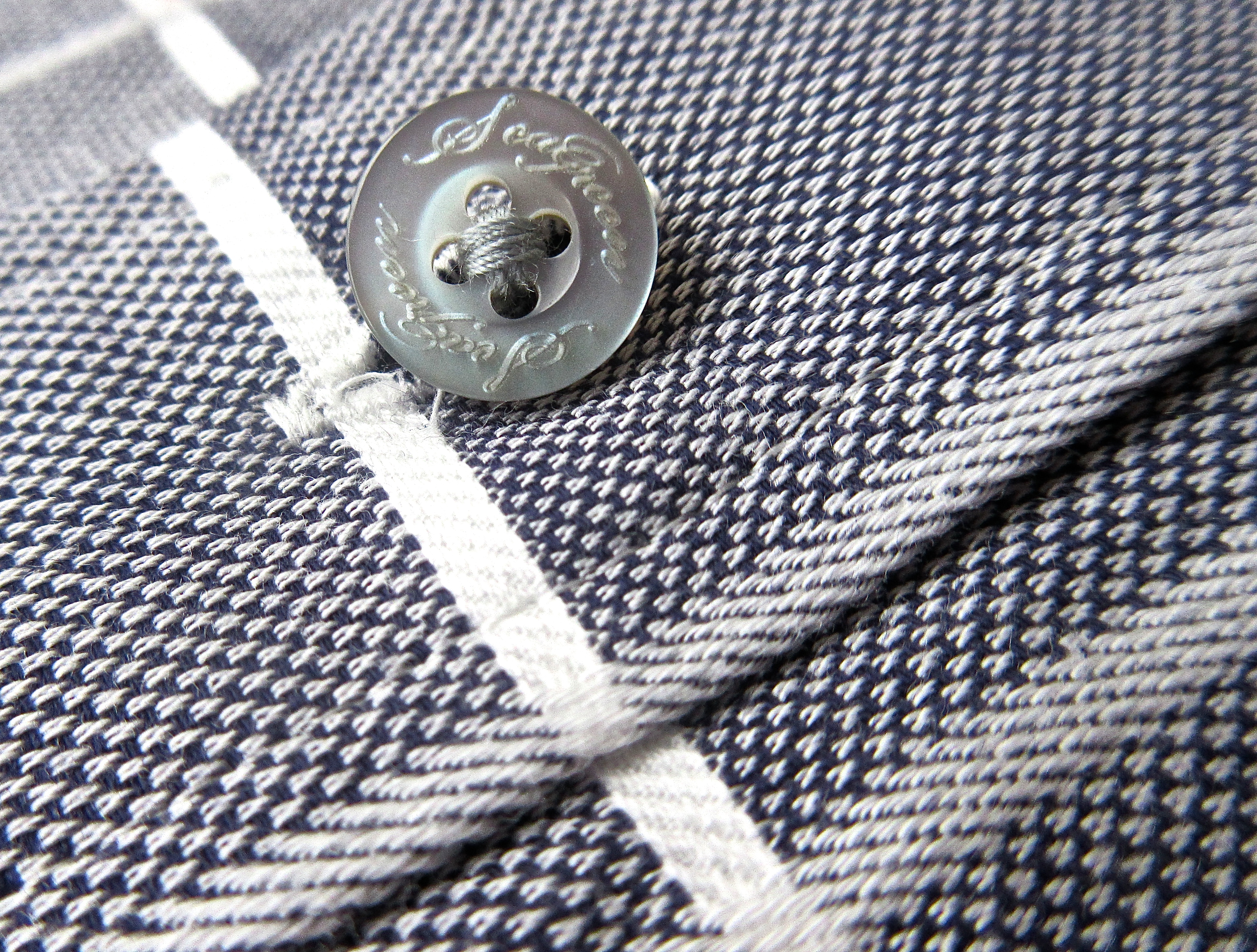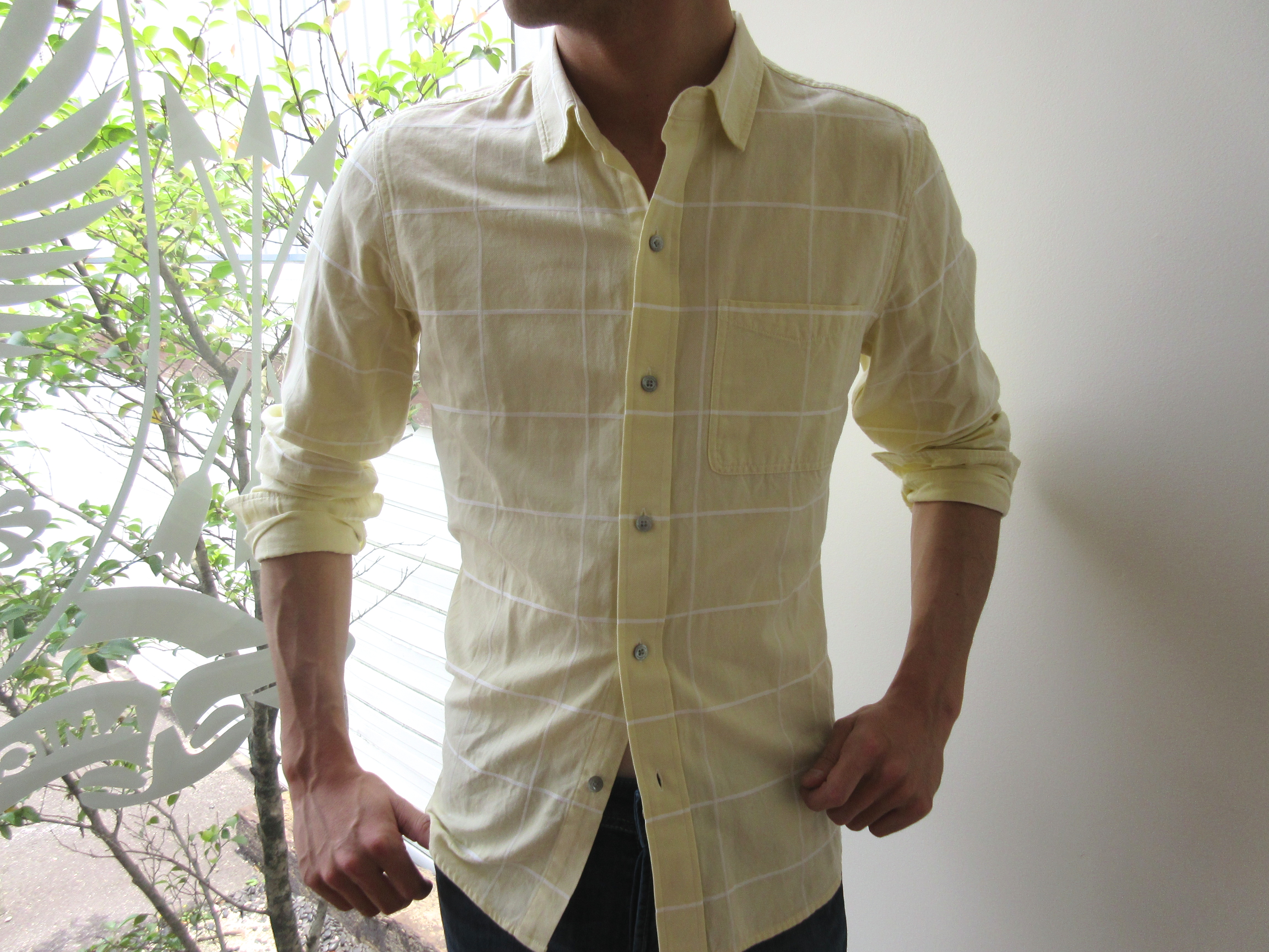 光沢の有る釦はブランド名がさり気なく刻印され、全体の雰囲気を上品にしてくれます。触り心地は柔らか目ですが、適度なハリも感じられ、襟を立たせる時や袖をまくる時のクセは上手くつけられるであろう生地感です。そしてウインドウペンは、よく見ると、横のラインがはっきりとした白に、縦のラインが少しぼかした様な白で描かれており、微かですが、1全体の印象を柔らかく演出してくれています。