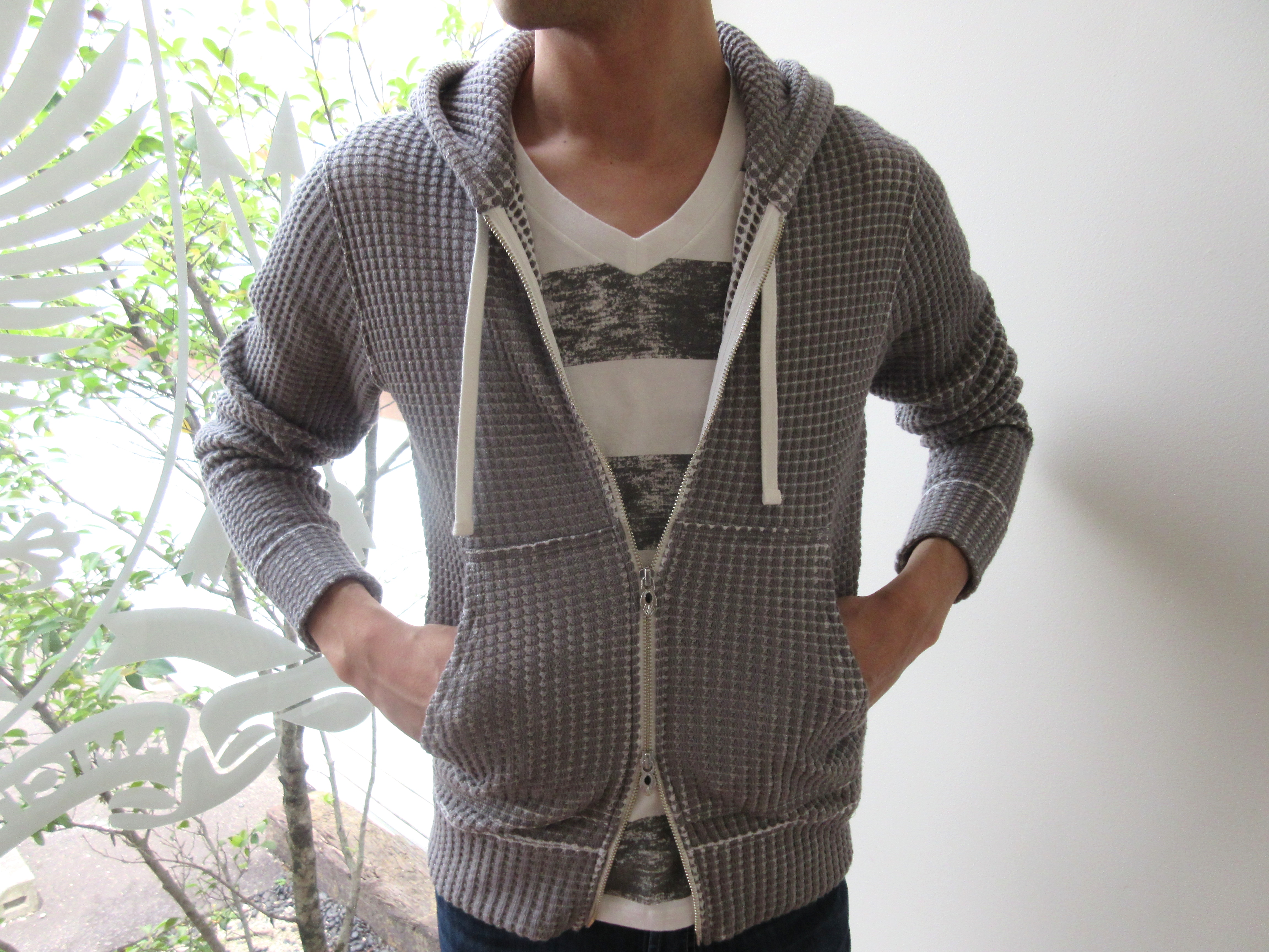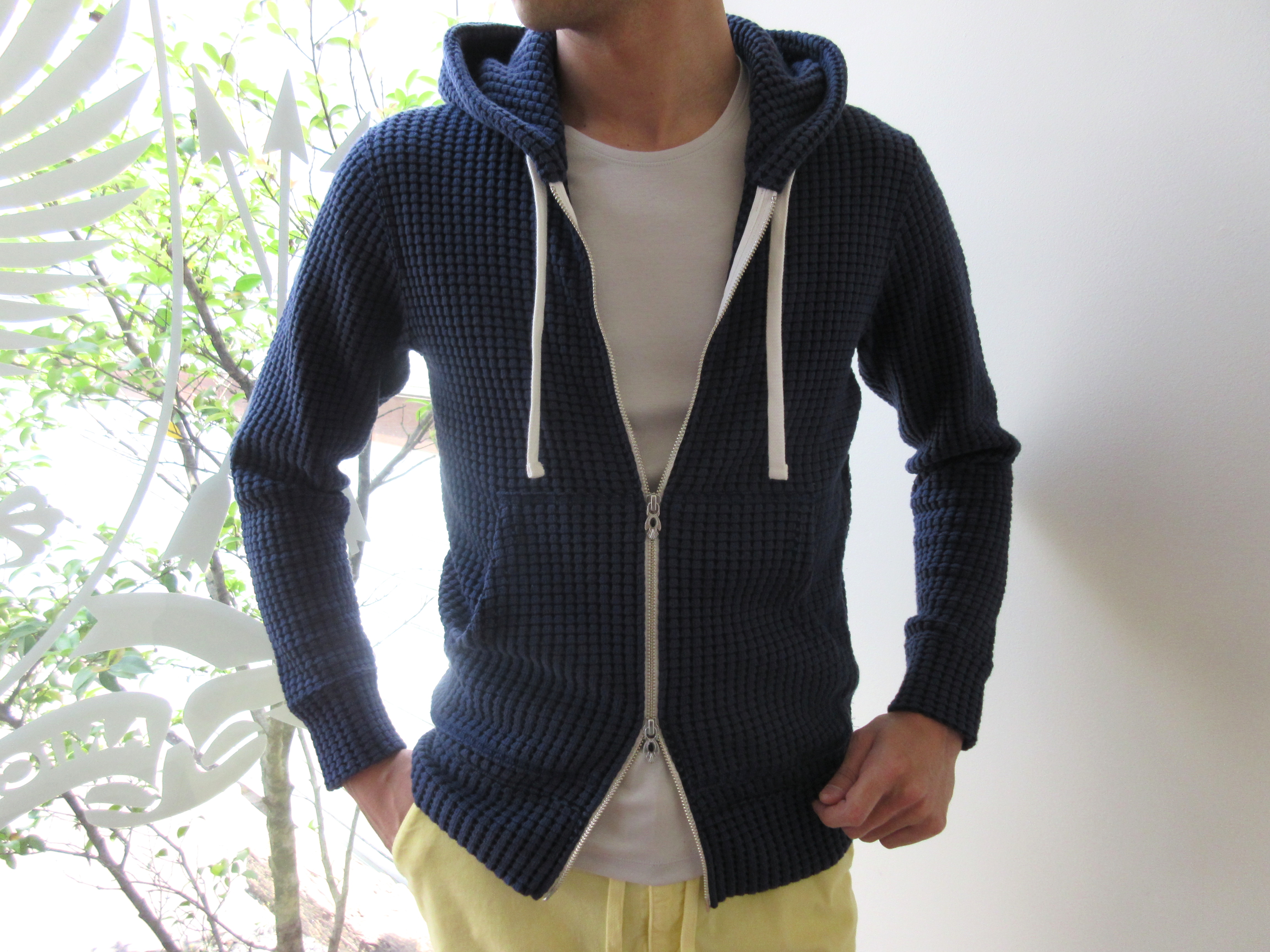 真夏のリゾーティな着こなしにも、3シーズン使える街着としても、ひょっとしたら秋冬のインナーとしても?、兎に角、長く活躍しそうなビッグワッフルの生地を使ったジップアップパーカーです。