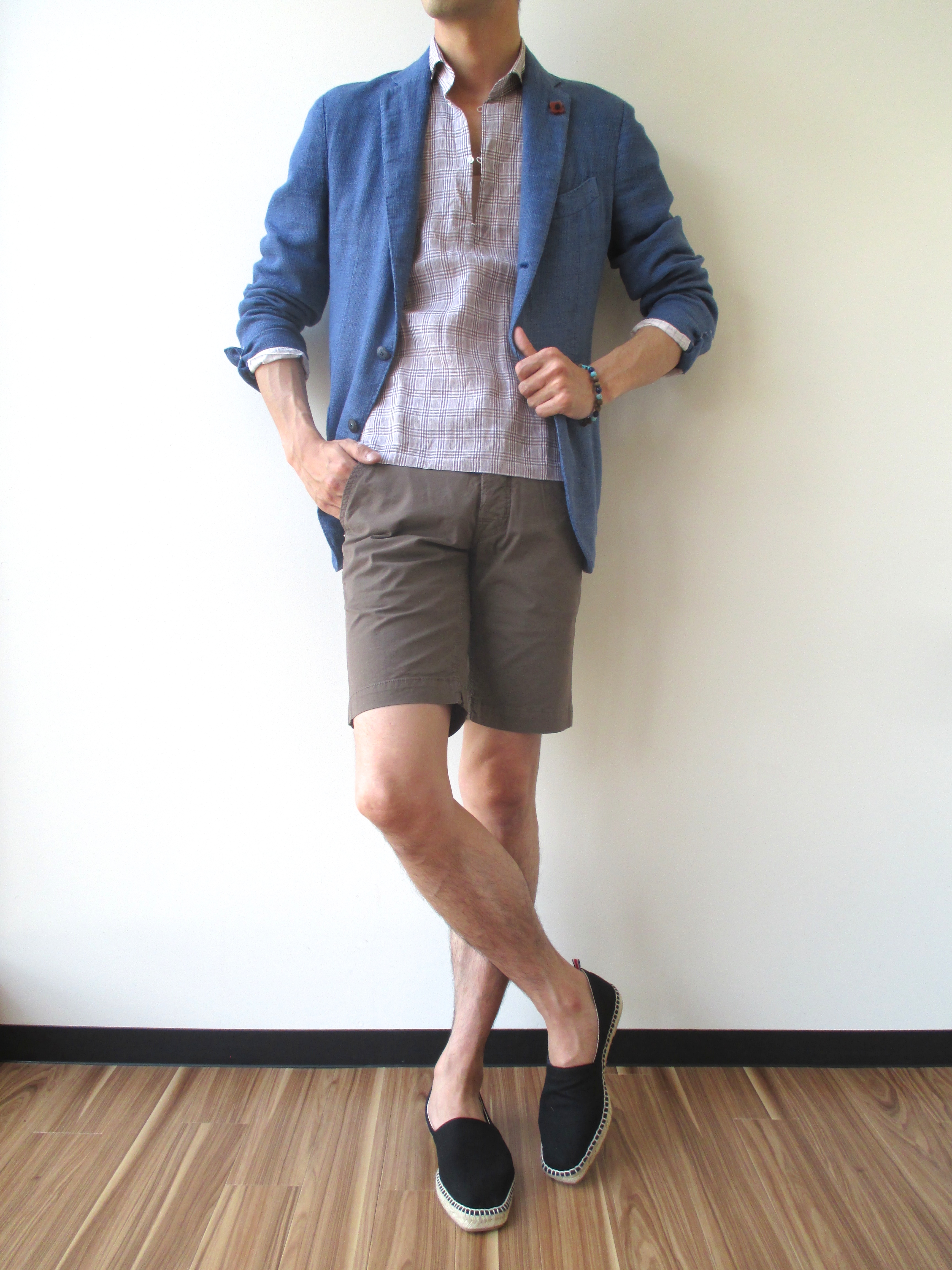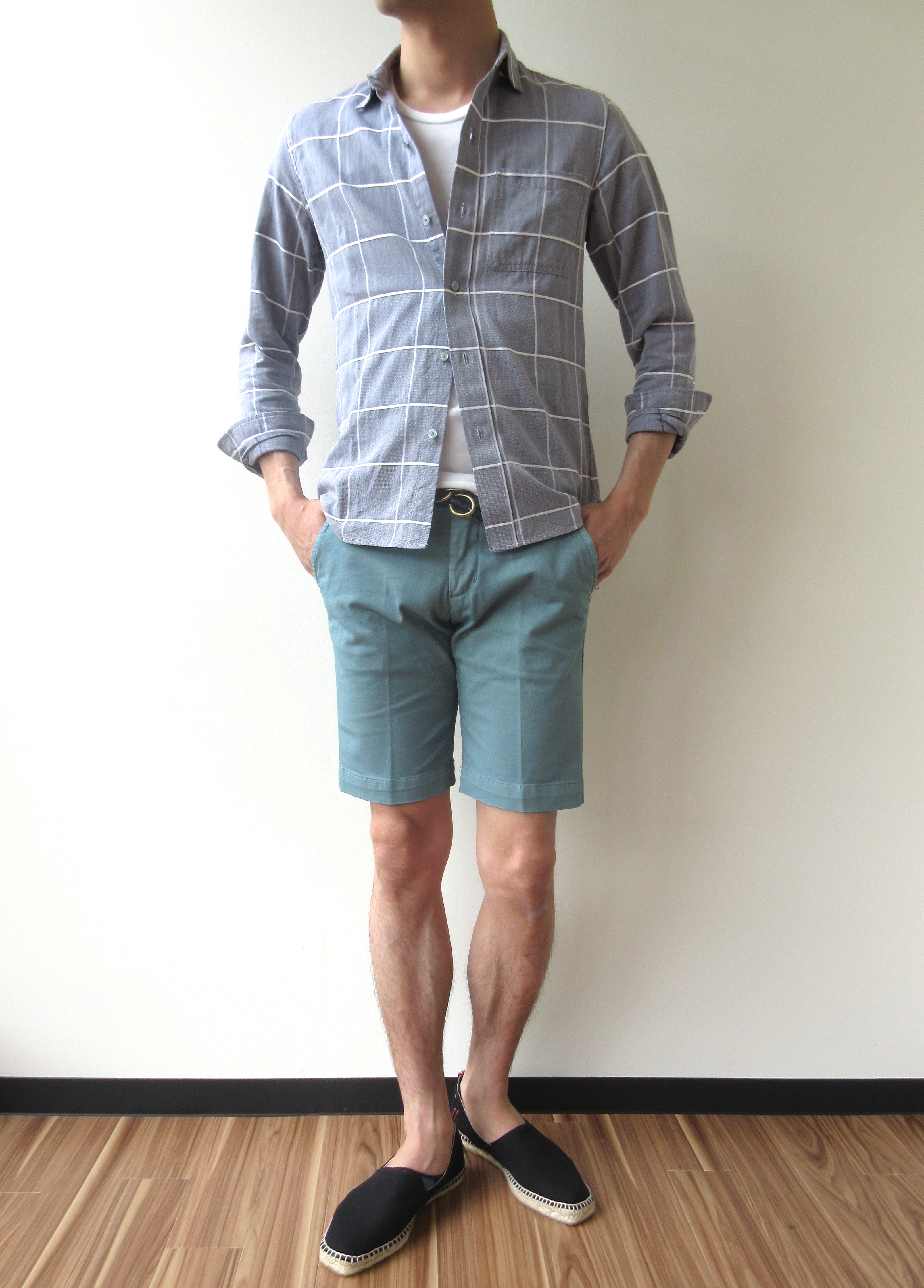 コーディネートは、Seagreenのクルーネック(未公開)に、TIBERIO FERRETTIのフックベルト、entre amisのショーツ、シューズはRivierasです。