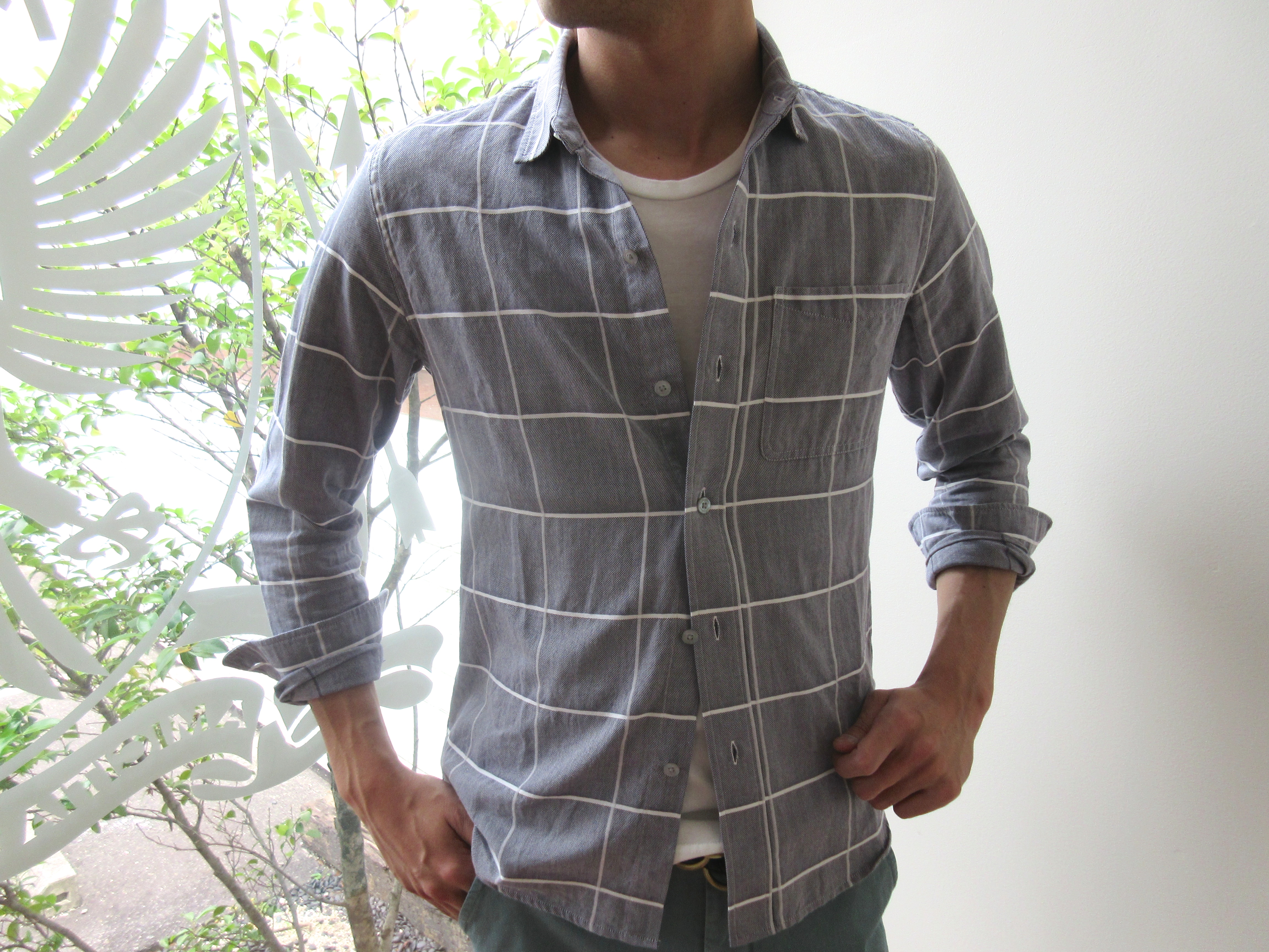 シンプルなウインドウペンが、優しめのカラーによく映えるシャツです。ポケットの少なくなる夏に何気に嬉しい胸ポケット付きで、タッグアウトでも着用できる着丈の長さです。