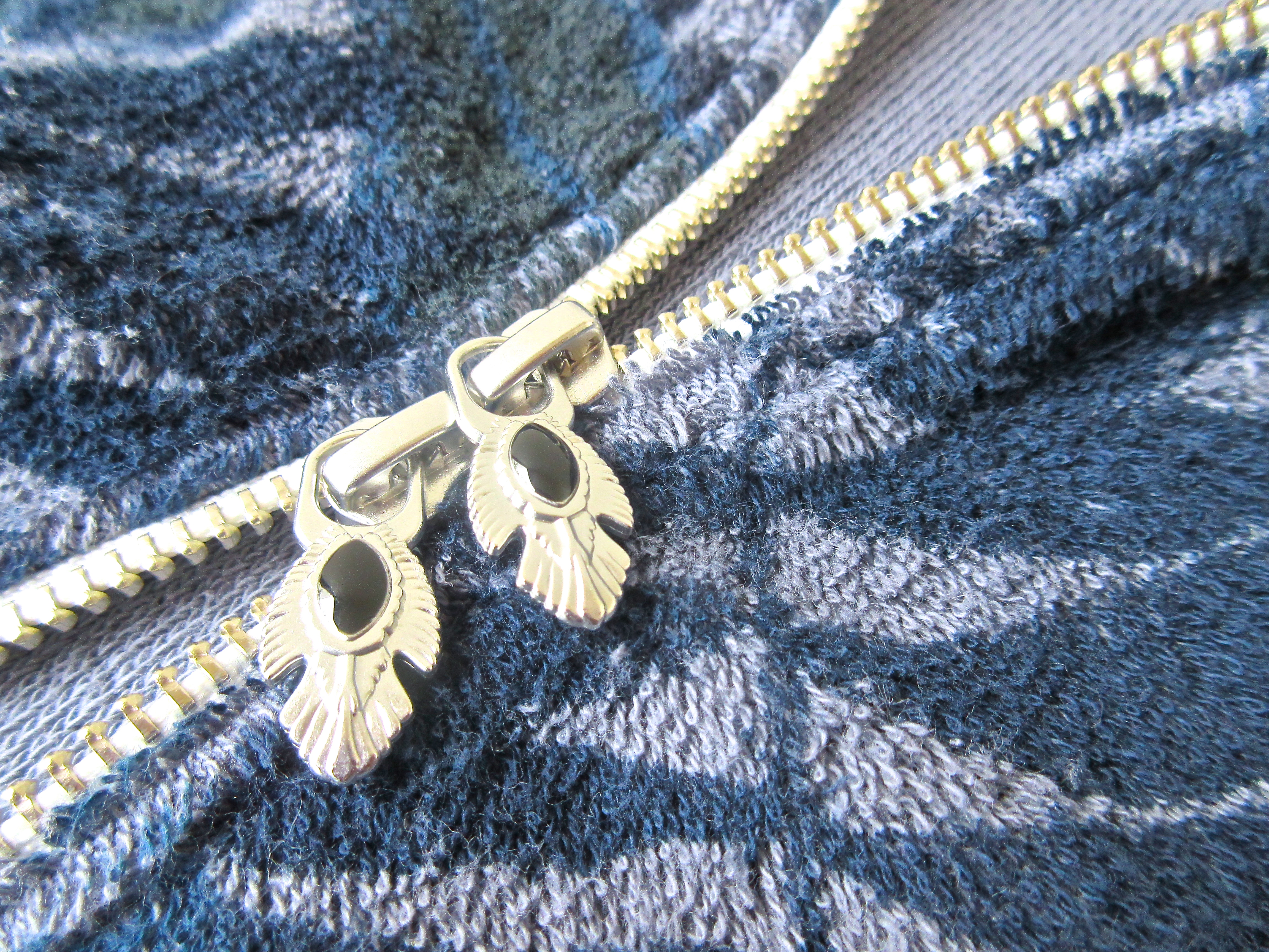 ジップ部分はコンチョ釦風(コンチョとは、ネイティブアメリカン=インディアン ジュエリーの装飾釦のことです)に仕上げられ、アクセントになっています。
