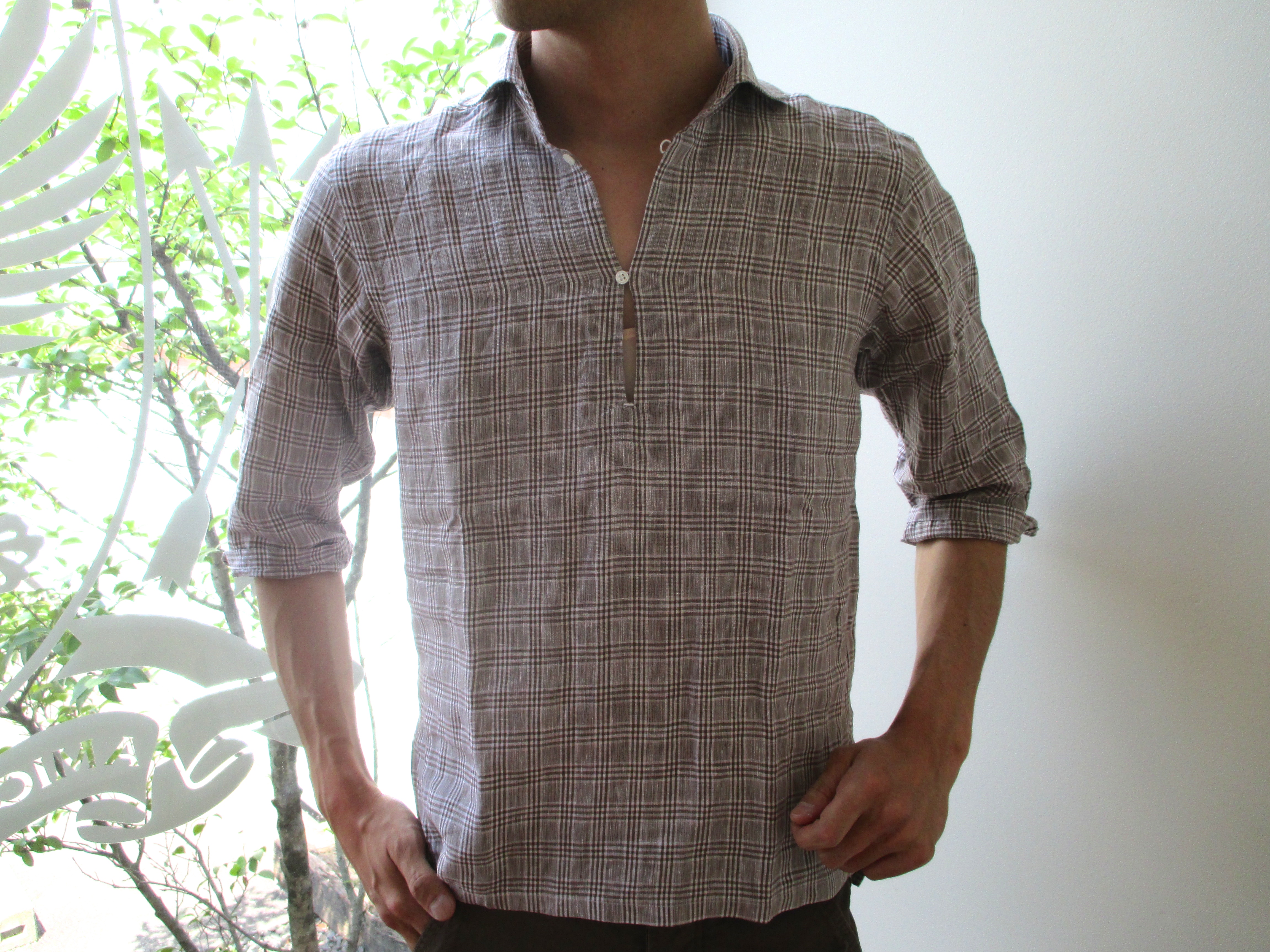 夏場においても欠かさず着用していたいのは、チェック柄。やや掠れた発色と、リネンのシャリッとした生地感によって、大人の余裕が存分に感じられる雰囲気に。釦に注目して頂くと、ブラウン×グリーンが白の貝釦、ブルー×グレイがシルバーのメタリック釦となっております。