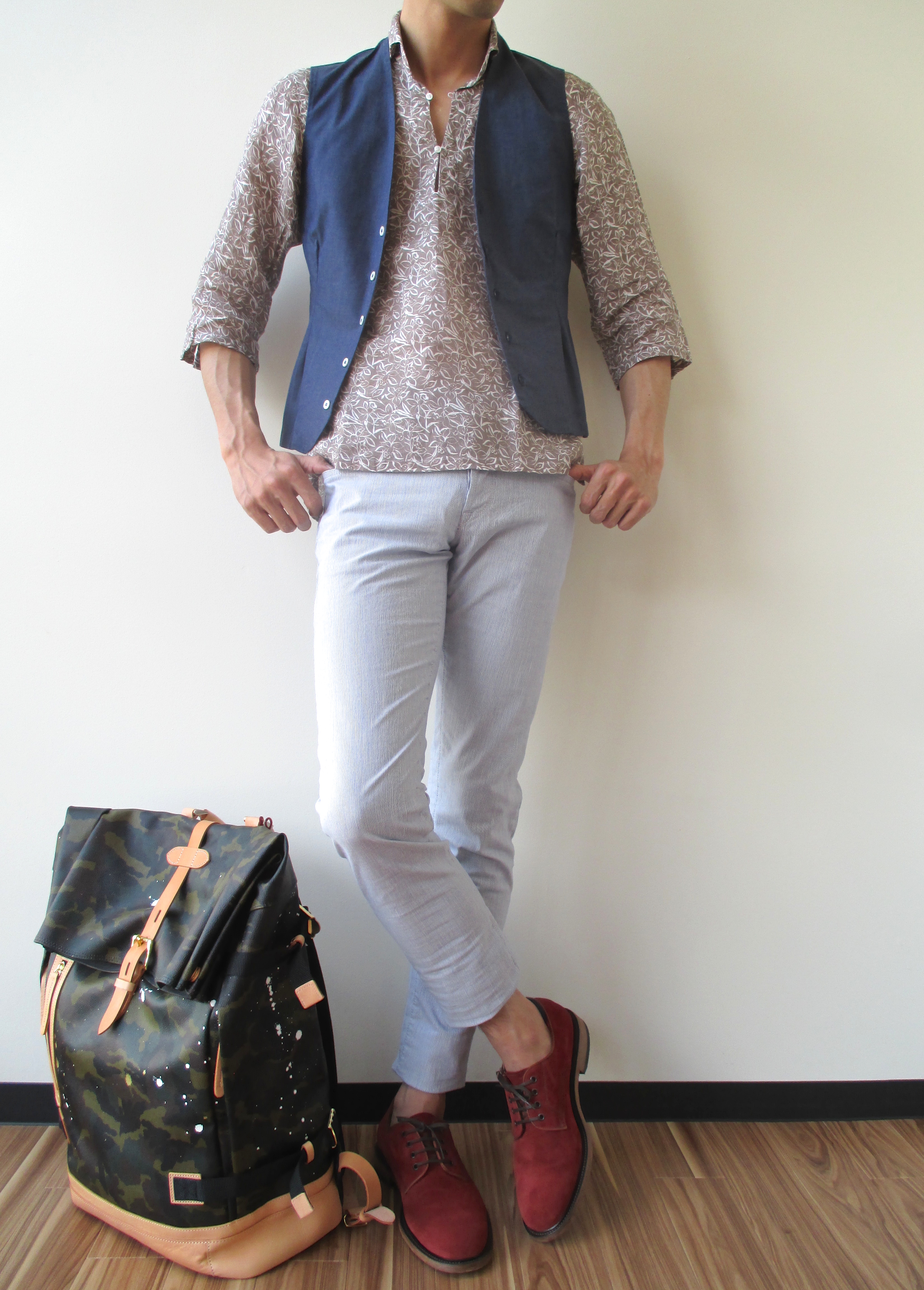 盛夏の旅行やお出掛けの際に着用していたいリネンのカプリシャツは、季節感を醸し出すのに最適なアイテムかもしれません。花柄もどこか自然に見せてくれる雰囲気が、このアイテムに宿っているかのようです。Mario Muscarielloのコットンジレ(未掲載・サイズ44のみ)に、パンツはSIVIGLIAのベビーコードレーンパンツ、靴はDOUCAL'Sのスエードオックスフォードシューズを合わせてみました。流離う旅人のように?隣に置いたバッグはGENTIL BANDITのバックパックです。