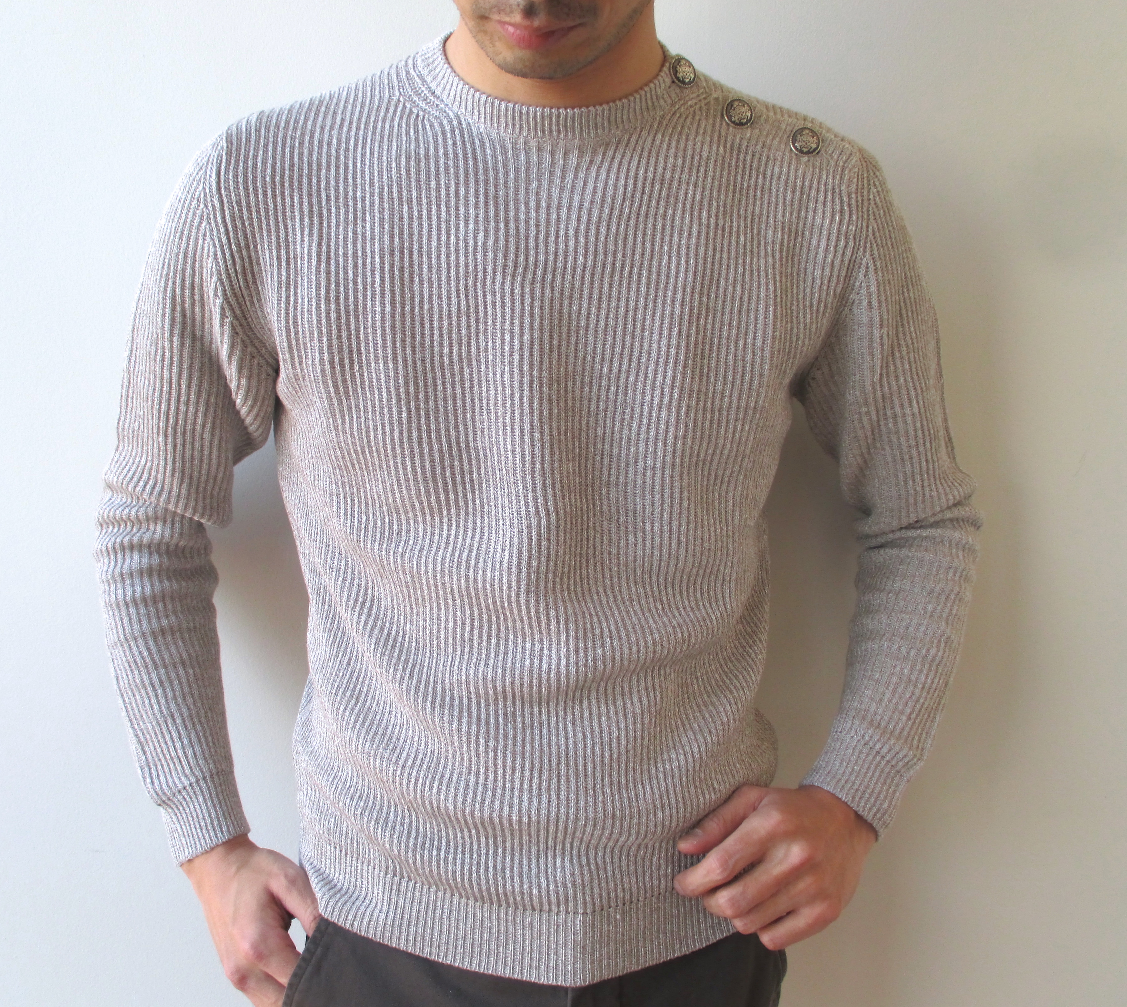 続いては、こちらもイレブンティらしい、Vネックの変形ヘンリーネック。上2つの釦が斜めに付いている点、襟口に白い生地が縫い付けられている点が珍しく、これ1枚で簡単にレイヤードスタイルが楽しめます。これからの暑い時期、重ね着しないで済むのは助かりますよね。