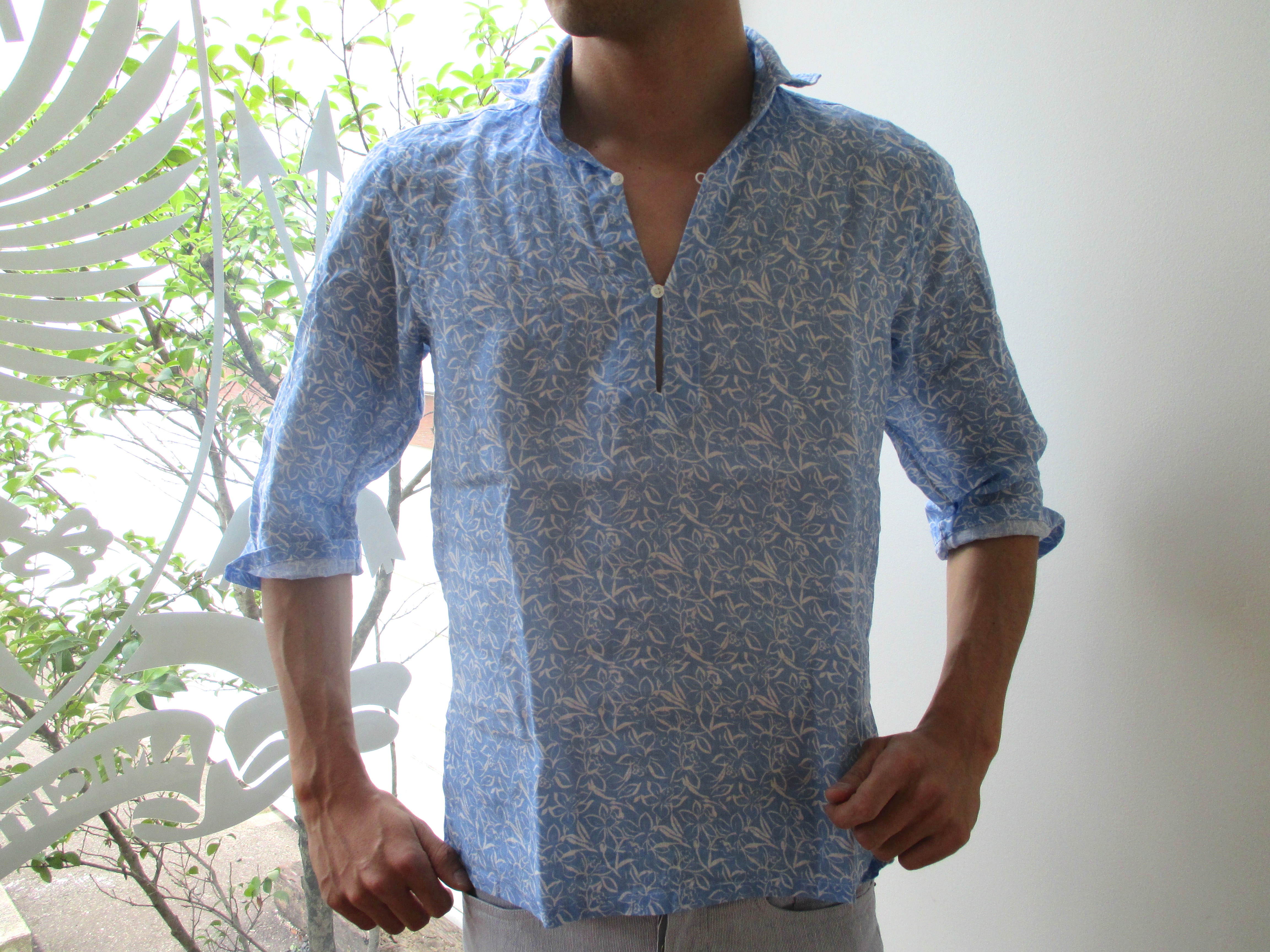イタリア人の様に、一度は着てみたいのが、花柄。ややスモーキーなベースカラーに、擦れた様にプリントされた花柄は、存在感を出し過ぎず、バランスが巧く取れているように見受けられます。リネンのシワ感とも相まって、花柄初心者にも易しい顔つきに仕上がっています。