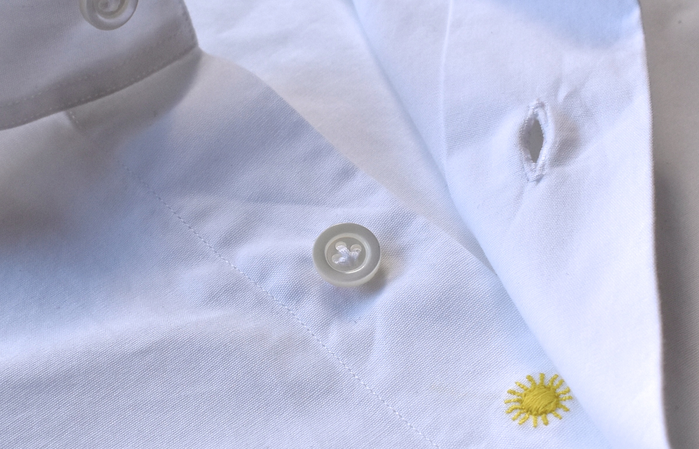 面白いのは、ハンドステッチによるストライプ。大きさにムラがあり、シャツの表情を大いに豊かにします。使用していくたびにカディコットンは柔らかく空気を含むようになり、ステッチの表情も存在感を増す...と言われています。