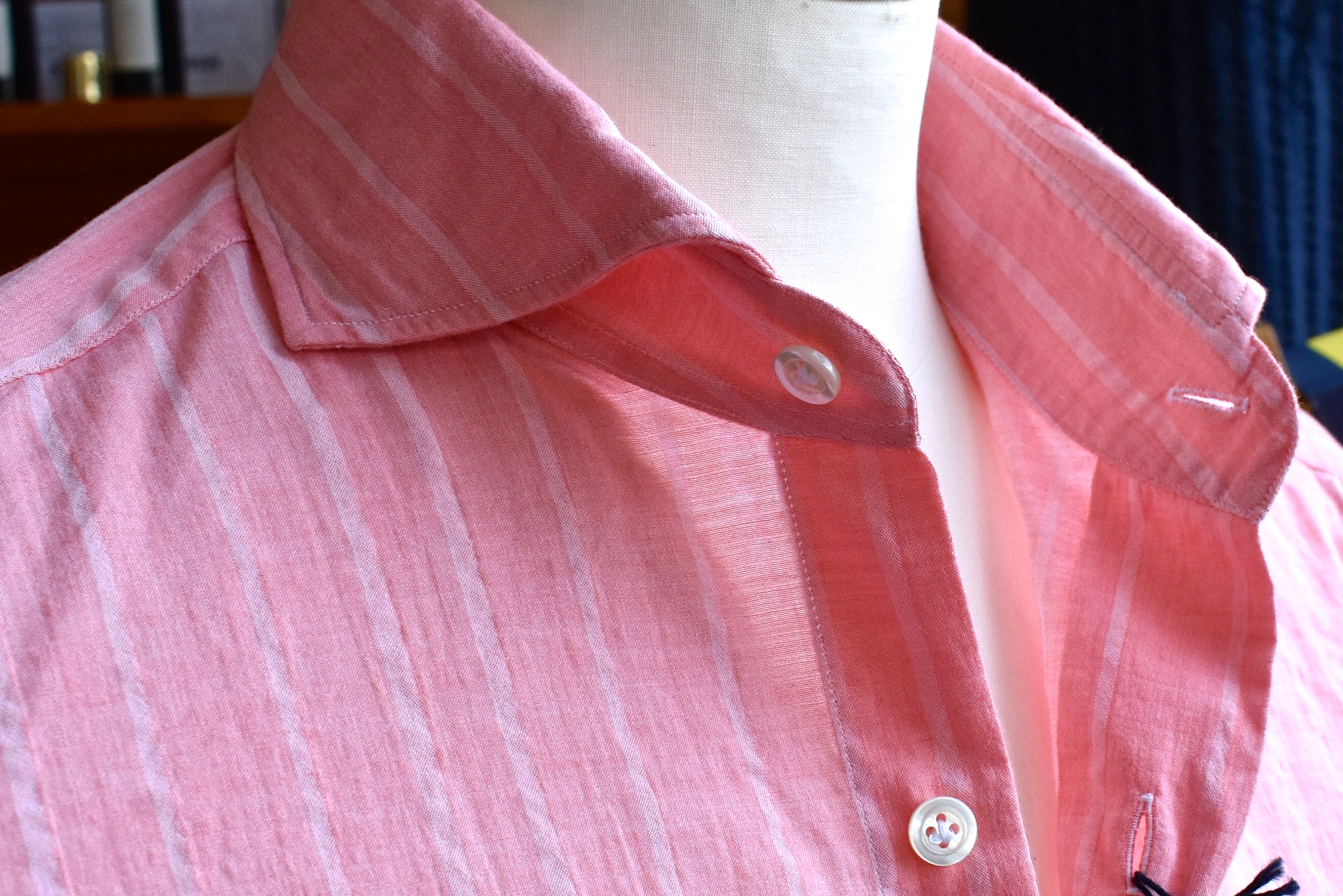 まずは、無地が適当でしょうか。毎シーズン定番としてセレクトを重ねているのは、オックスフォードの無地。23,000円(税別)という魅力的なプライスに、やや柔らかめで・イタリアのシャツらしい色気の詰まった生地。汎用性の高さを見込んでか、毎シーズンよく売れております。真っ先に手に入れておきたい(?)大定番・ホワイトと、