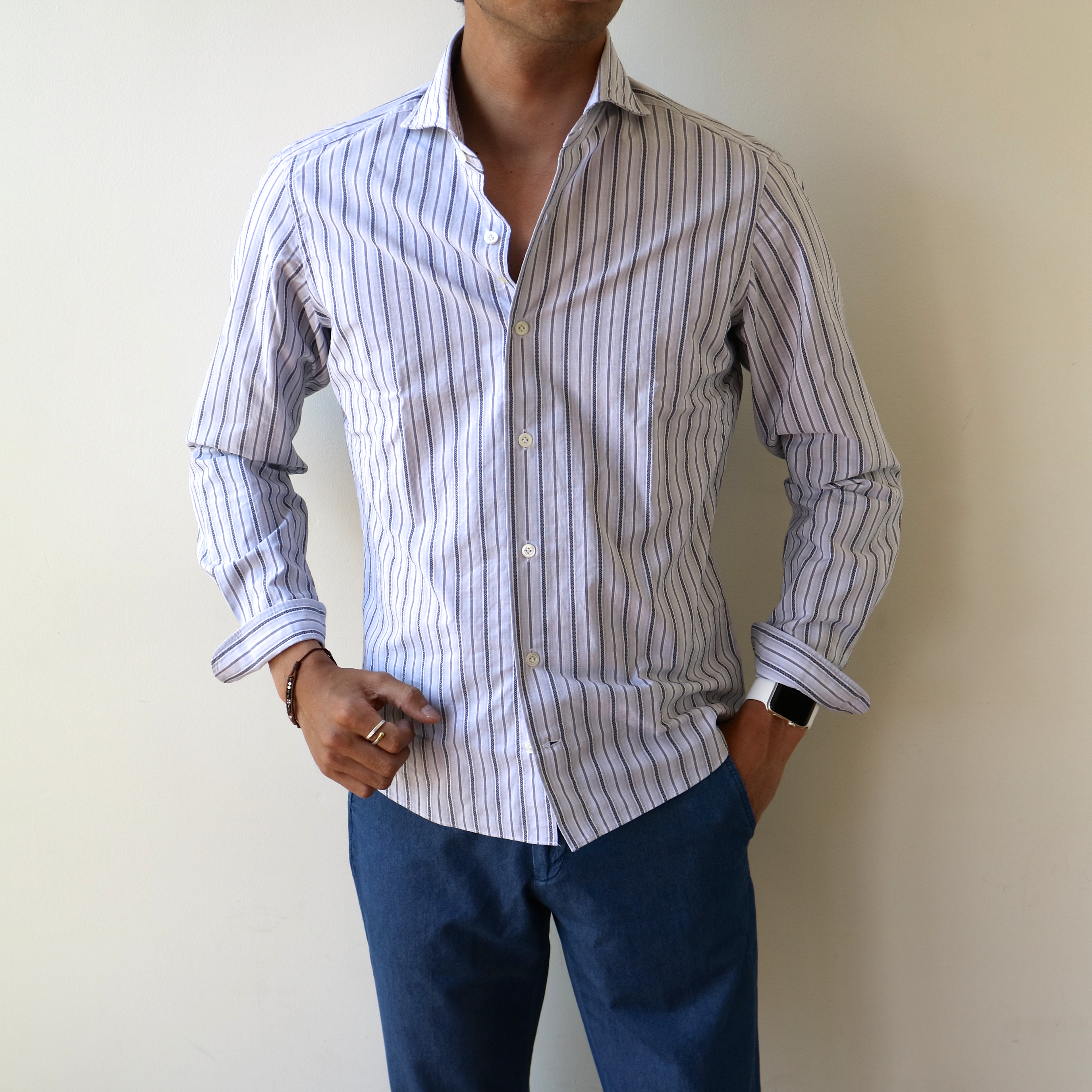 形は、短丈モデルの「VINCI FIT/ヴィンチ フィット」。シャツは裾を出して着たい...そんな方にうってつけのモデルです。他のシャツブランドと比べて、袖丈・着丈を遠慮なく短くしており、ファンが急増中のモデルでもあります。