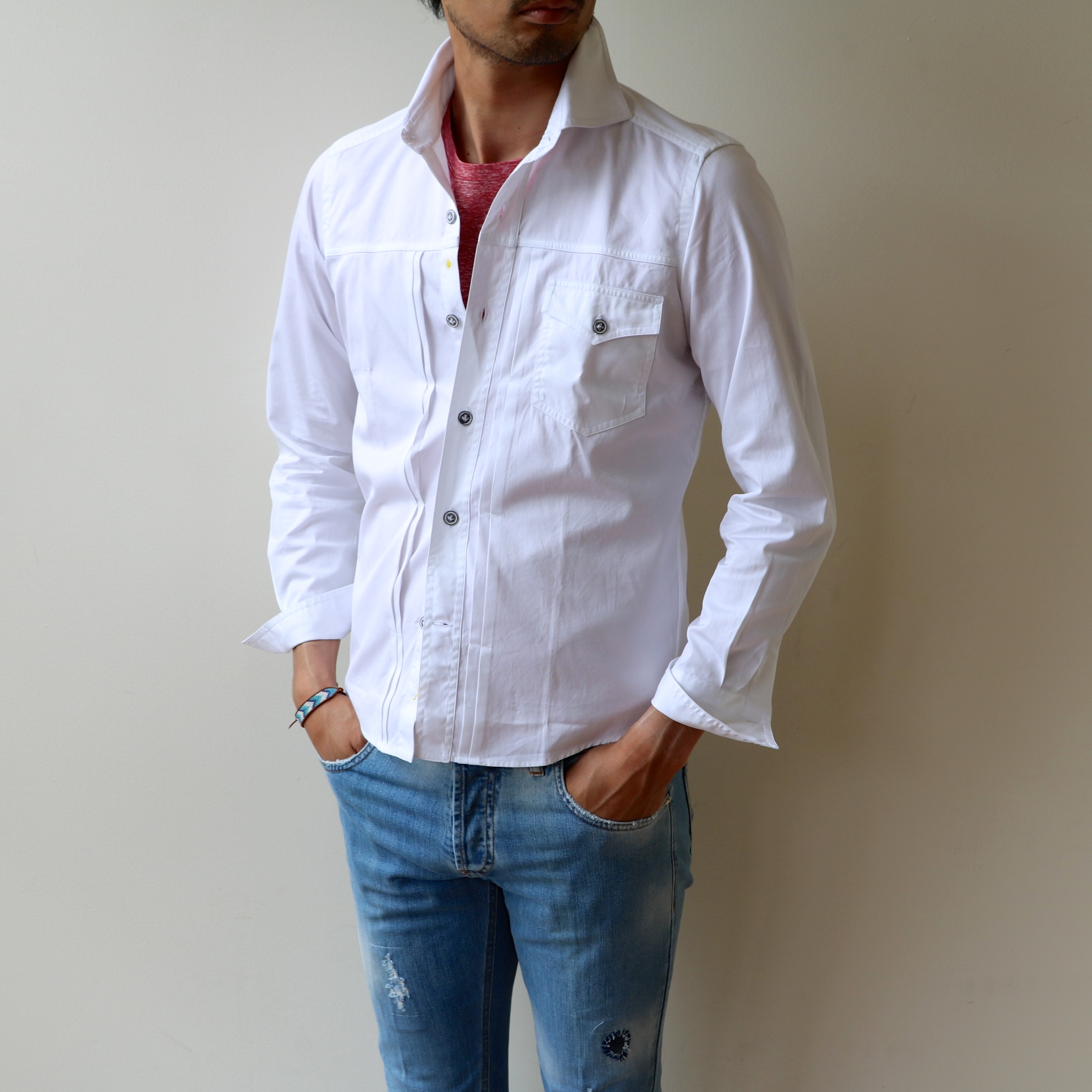 白シャツ。ただし、ちょっぴりカジュアルなデザインの入った白シャツですので、夏のアウター的に使うことも可能な白シャツです。オトコなら、夏にさらりと羽織っていたいホワイト。ジャケットやブルゾンでは勇気がいるかもしれませんが、シャツなら気軽にどうぞ...そんな雰囲気です。