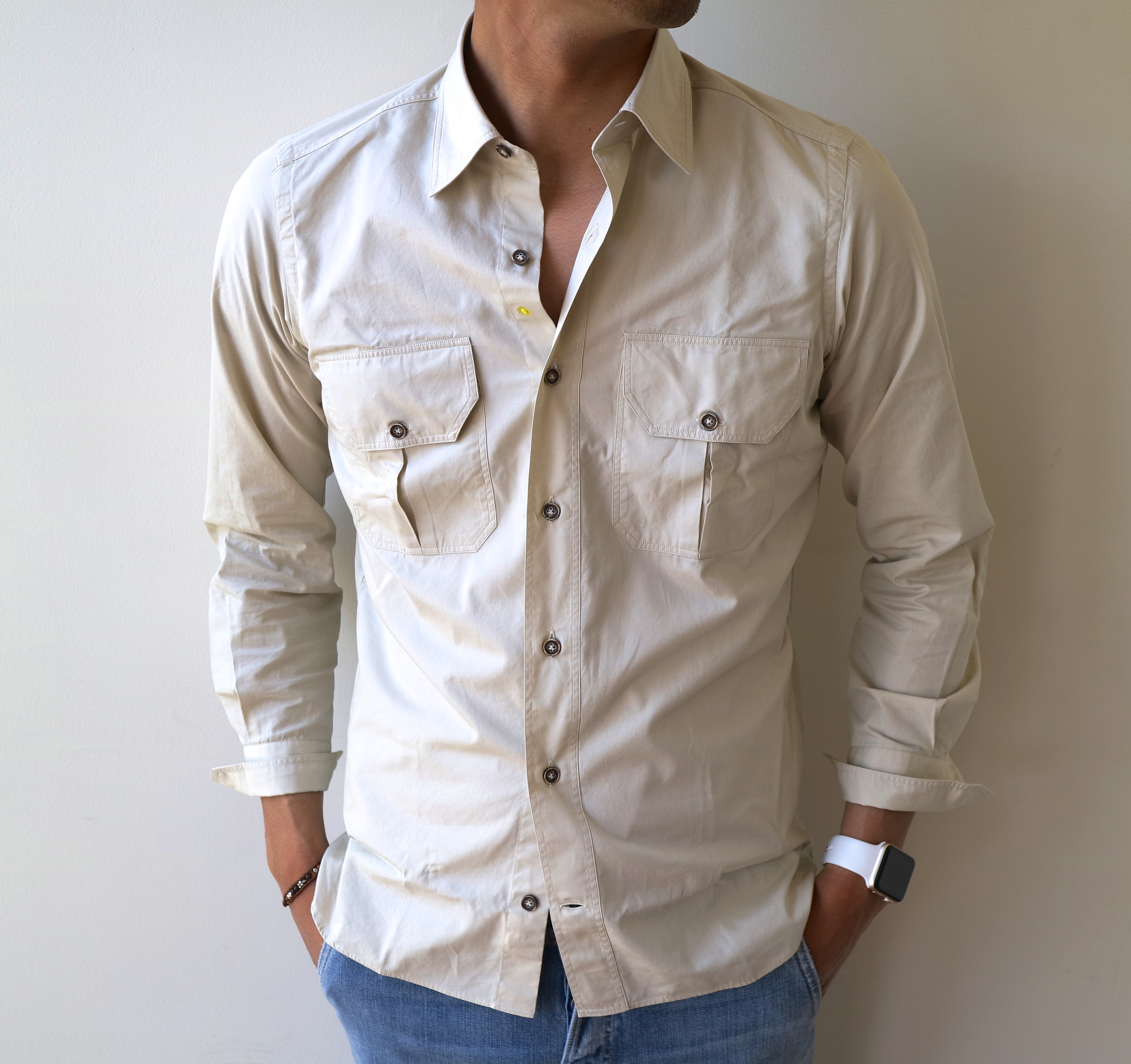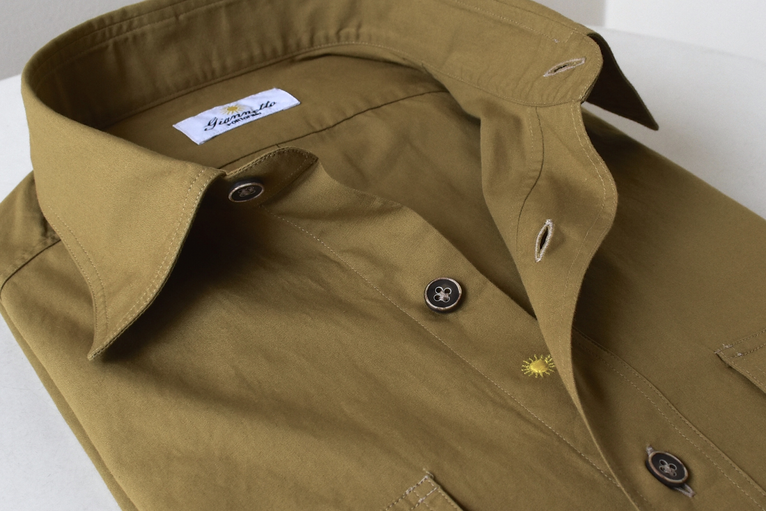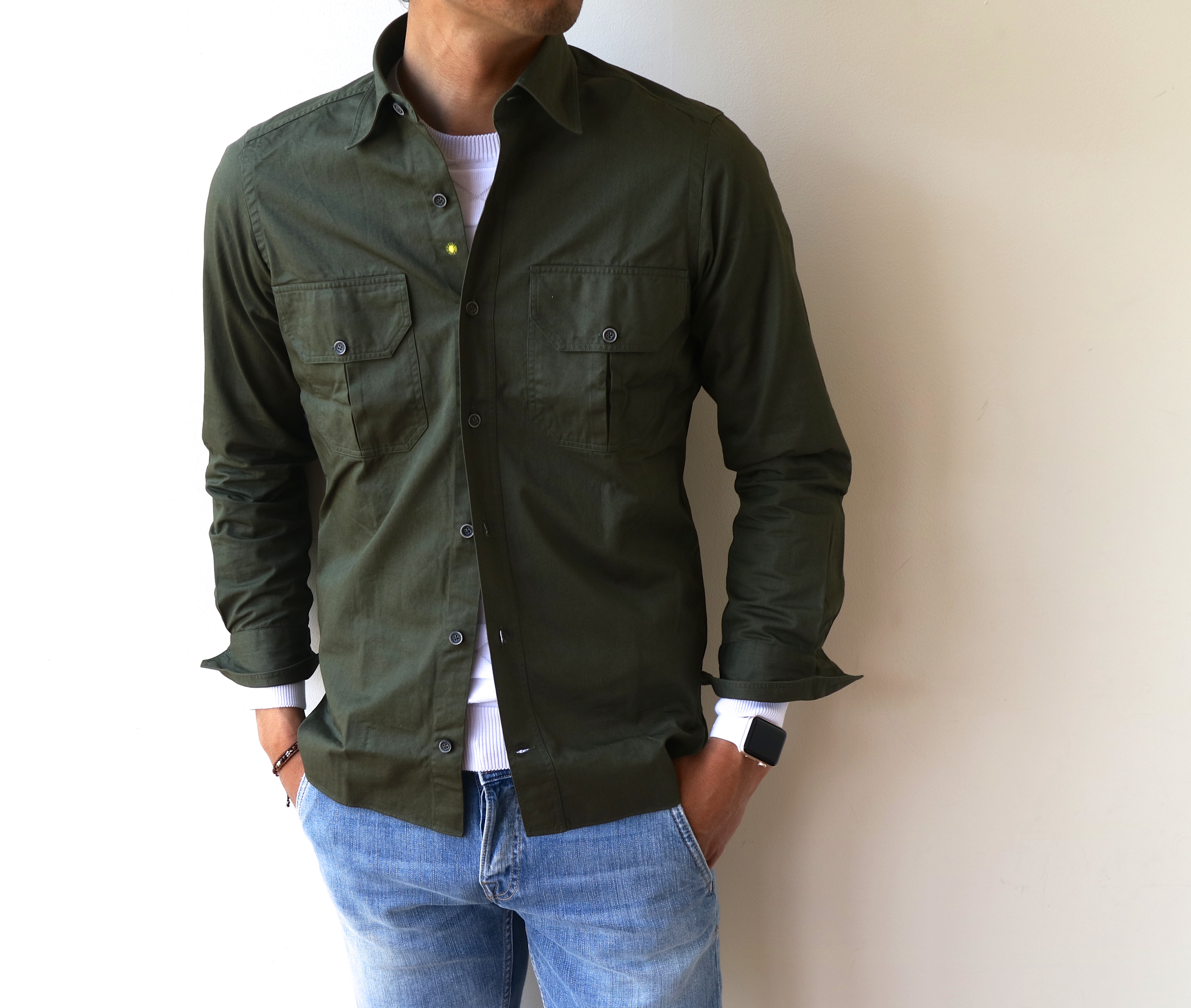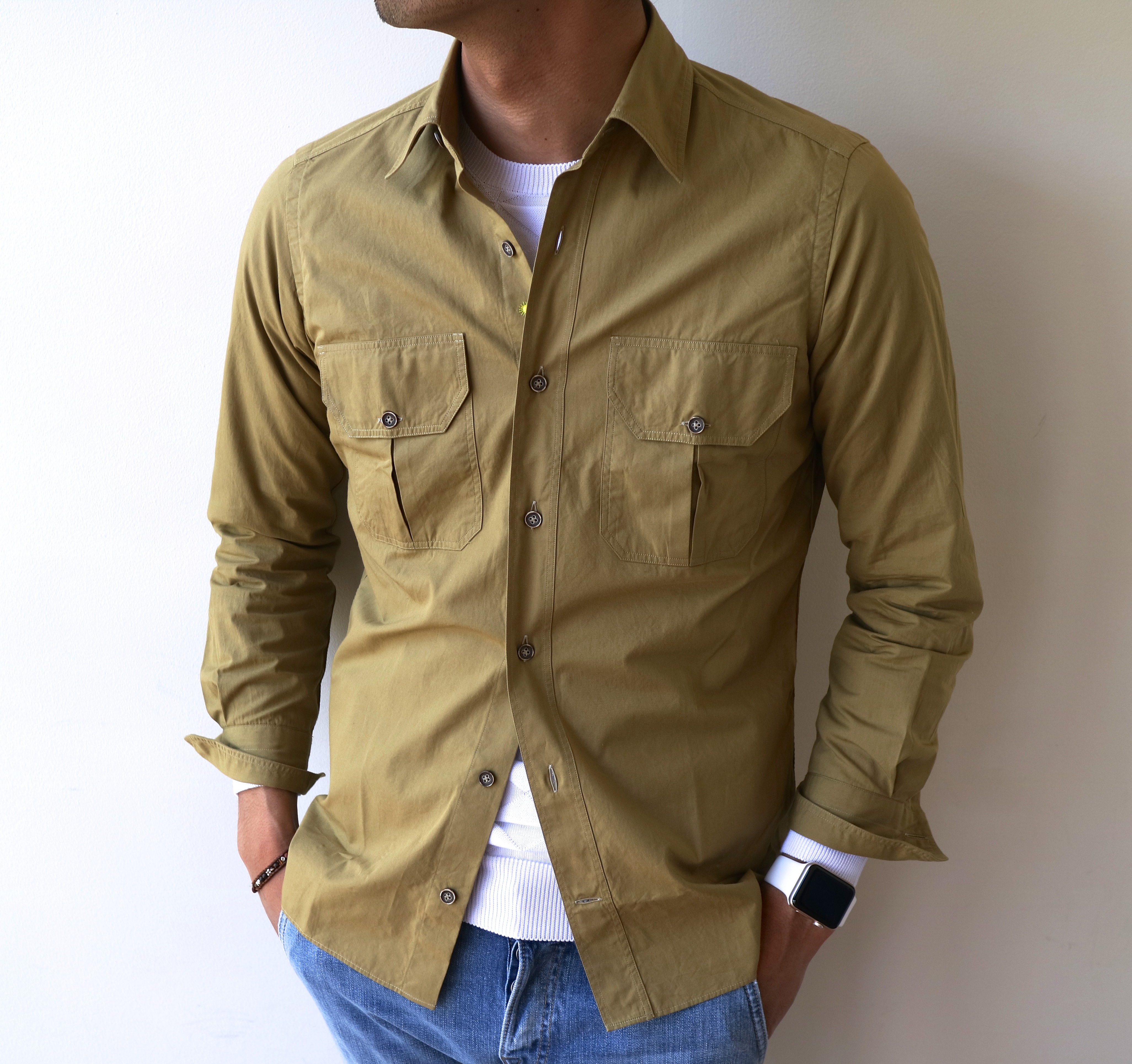 さて。ジャンネットが提案するミリタリーシャツ「ALPHA/アルファ」シリーズです。敢えて綺麗めなコットンのポプリン地をチョイスしましたが、落ち着いた全体の雰囲気のなかに、ほんのりミリタリー感が漂う...そんな良い塩梅で仕上がってきました。薄手でさらりとした生地でもありますので、夏にかけて大活躍しそう...自信アリです。黄味の出方が絶妙なオーカー(黄土色)に加え、