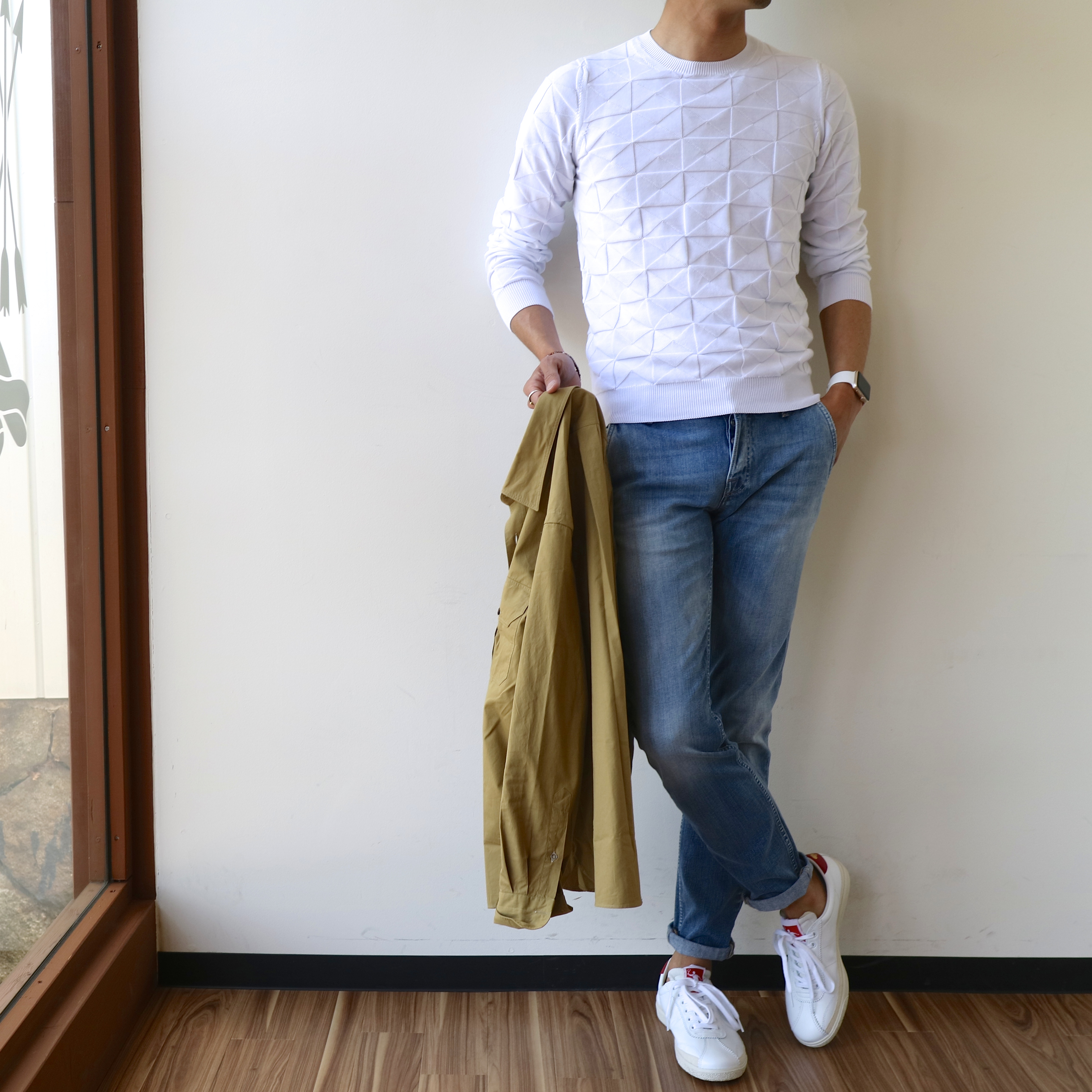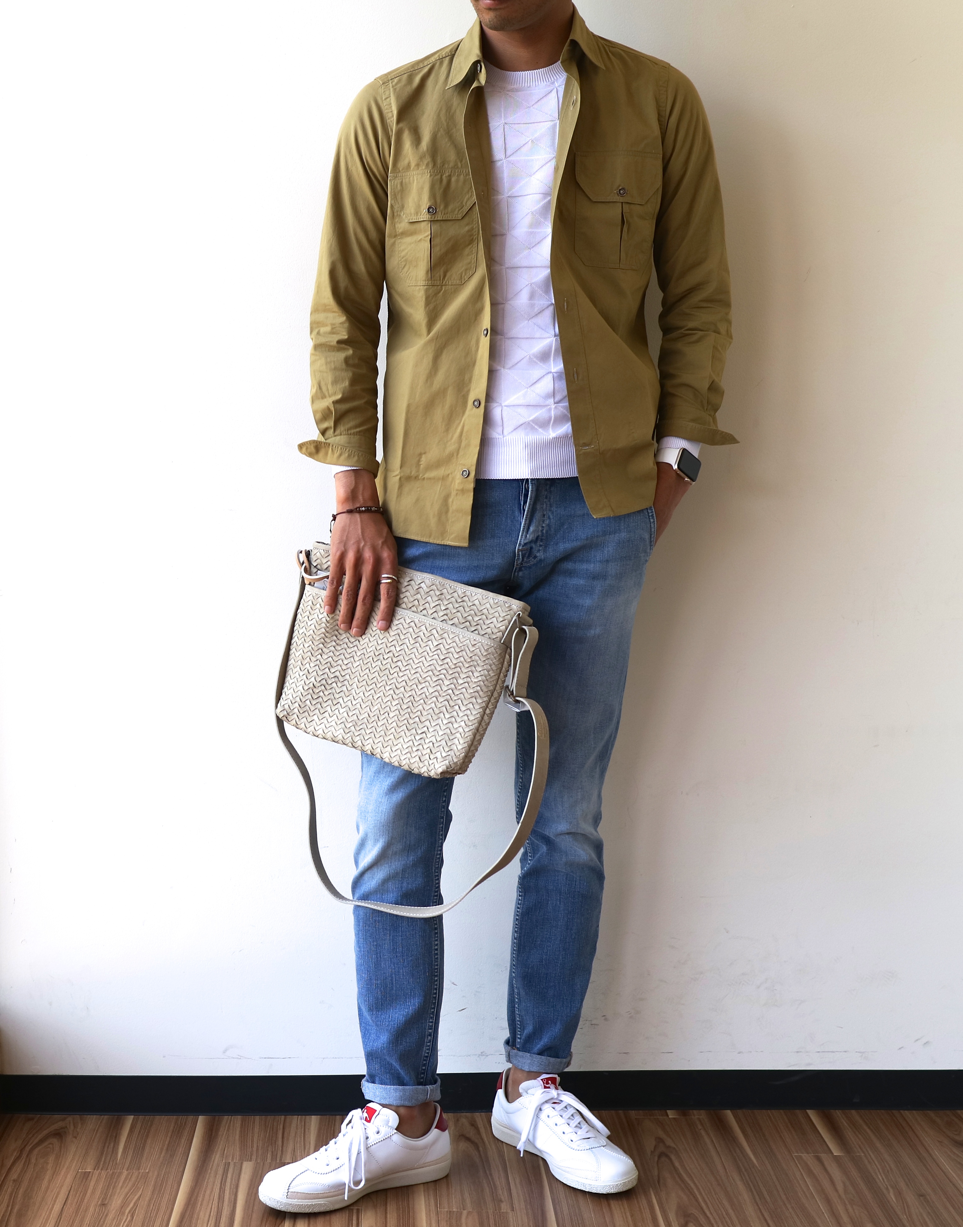 今の時期なら、インナーにはサマーニットがお勧めです。PANICALEの白ニットがとても良かったので、思わず追加で撮影してしまいました。ライトブルーのデニムはCare label、白のレザースニーカーはPantofola d'Oroです。それから、1枚目の写真ではTIBERIO FERRETTIのサコッシュ型バッグを手に持っています。
