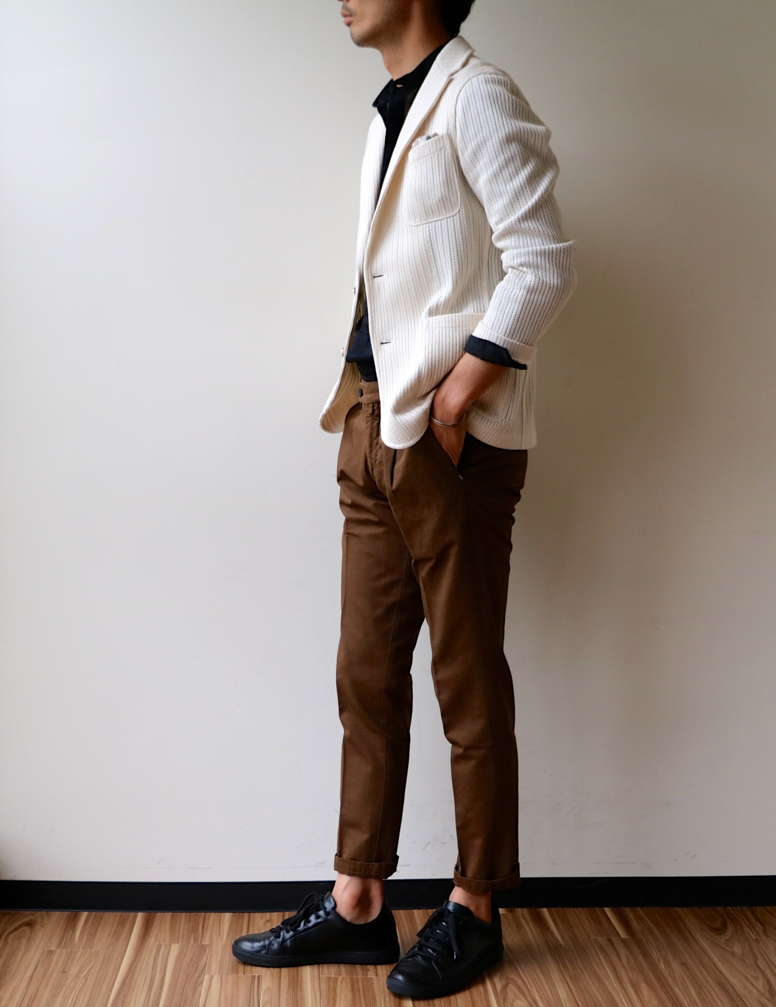 上にジャケットを羽織りました。もうちょっと正面を向けば良かったですね。反省です。メッシュのオフ白ジャケットはCOPPER、ブラウンパンツはMICAEL COAL。靴はPantofola d'Oroの黒スニーカーです。バンドカラーの小振りな襟が、襟元に違いを生み出すことでしょう。