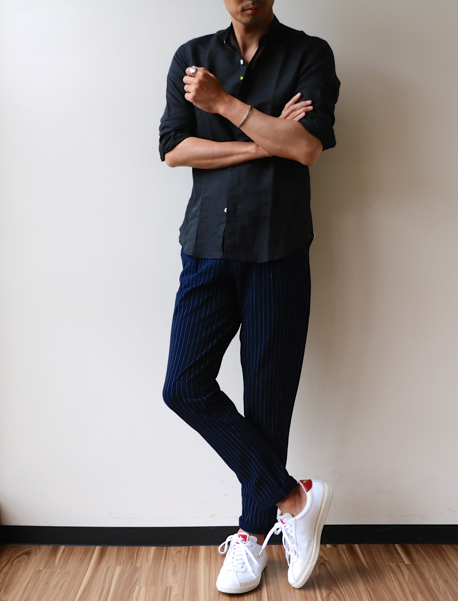 タックアウトでラフに着こなすのも良いですね。CIRCOLO 1901のジャージーパンツ、Pantofola d'Oroの白スニーカーなんかピッタリです。その他バングルはD'AMICO、リングもD'AMICOを合わせています。