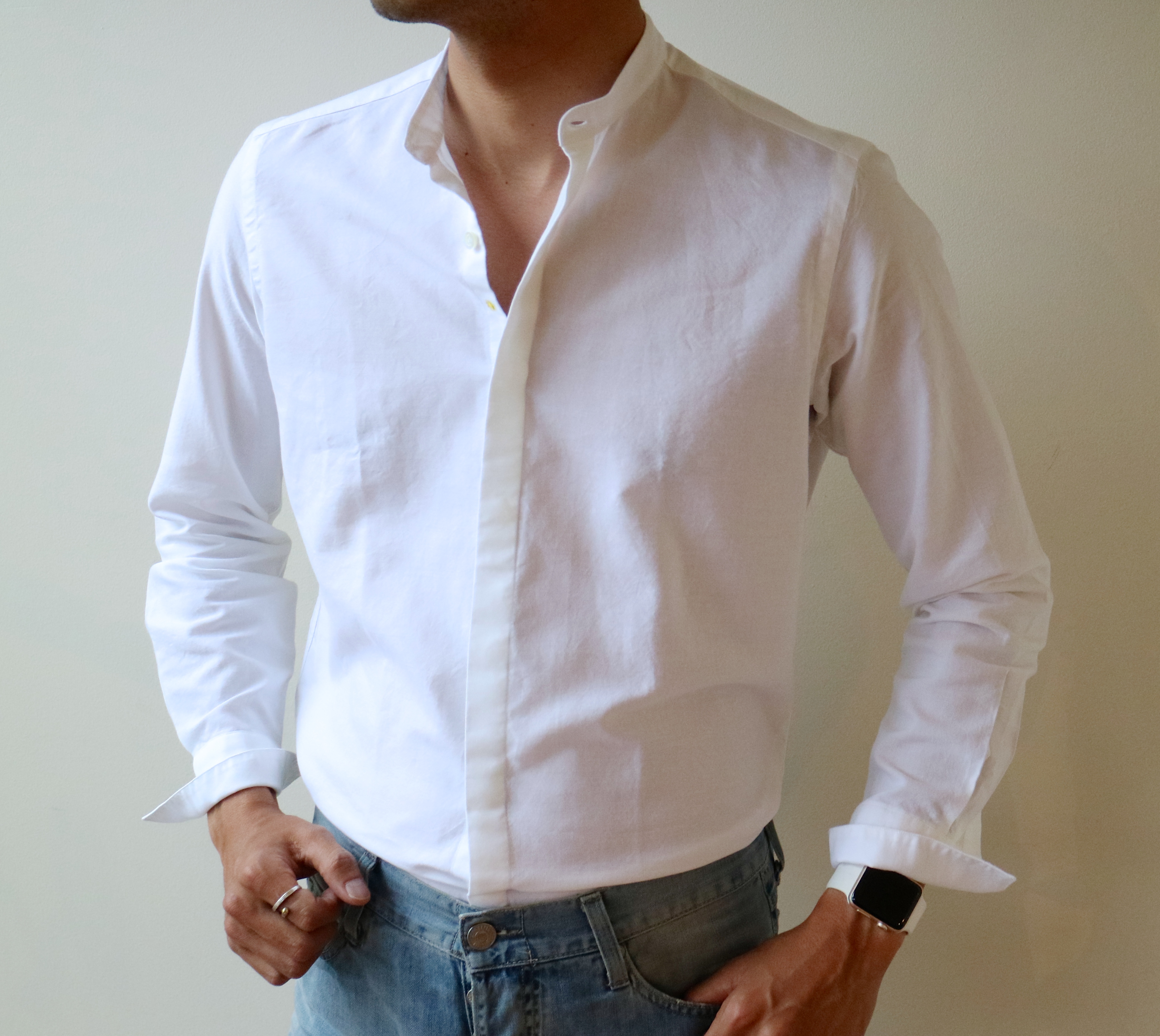 MODEL:「SLIM FIT」リネンコットン ソリッドバンドカラーシャツ
