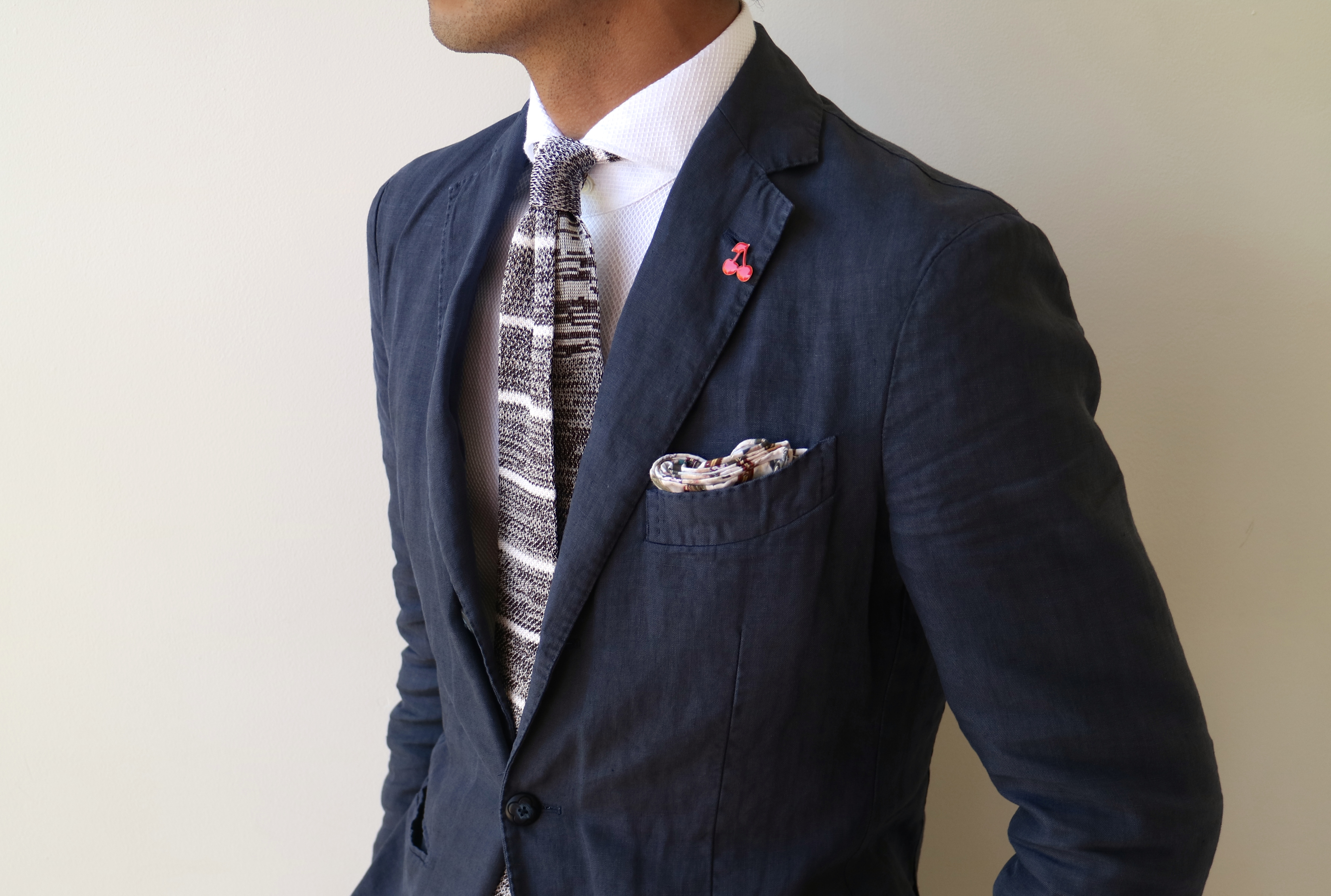 先週のL.B.M. 1911のコットンスーツの時と同じですが、タイドアップもお勧めです。夏素材のニットタイ(AD56・店頭のみ)なんてどうでしょう。Giannettoのポケットチーフに、KOKILICOのピンバッジ(店頭にしかないものもあります)を遊びで使っています。ジャケットは私物ですが、LARDINIのリネンスーツのもの。だいぶ年季が入ってきました。