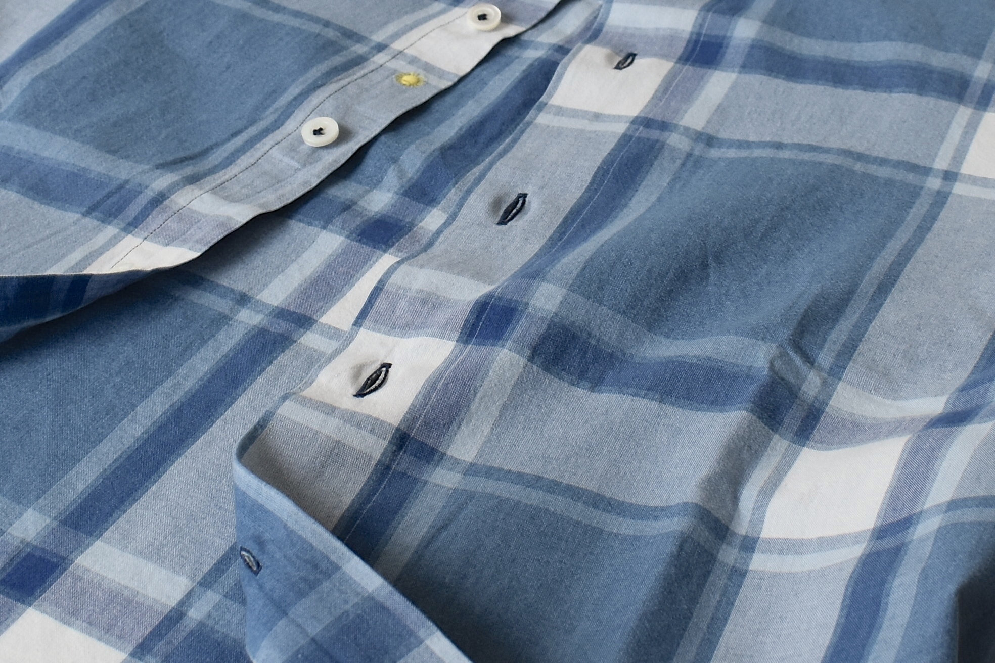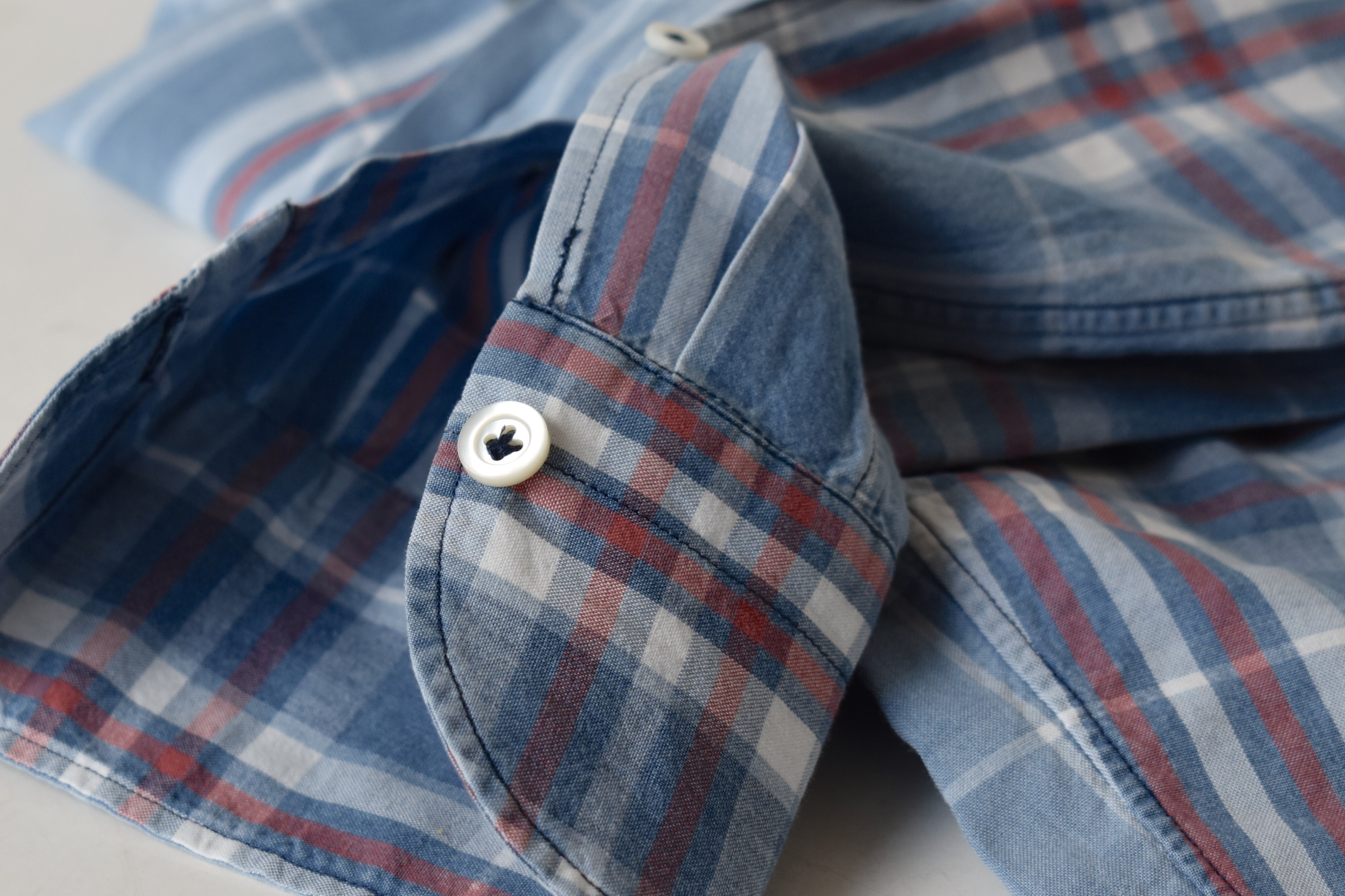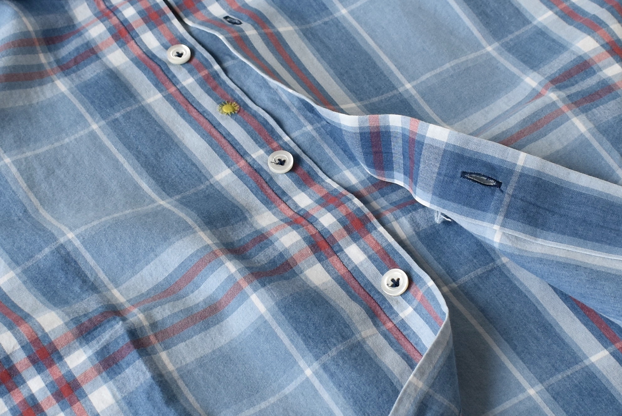デニム風のブリーチ加工を施した「WASH CHIARO/ウォッシュ キアーロ」の生地。淡い・褪せたブルーが交差するチェック柄は、なんとも良い塩梅。昨年大の付く好評でしたので、今季もしっかりご用意しました。既に店頭では、昨年購入出来なかった方が今年こそは!!と購入していかれました。