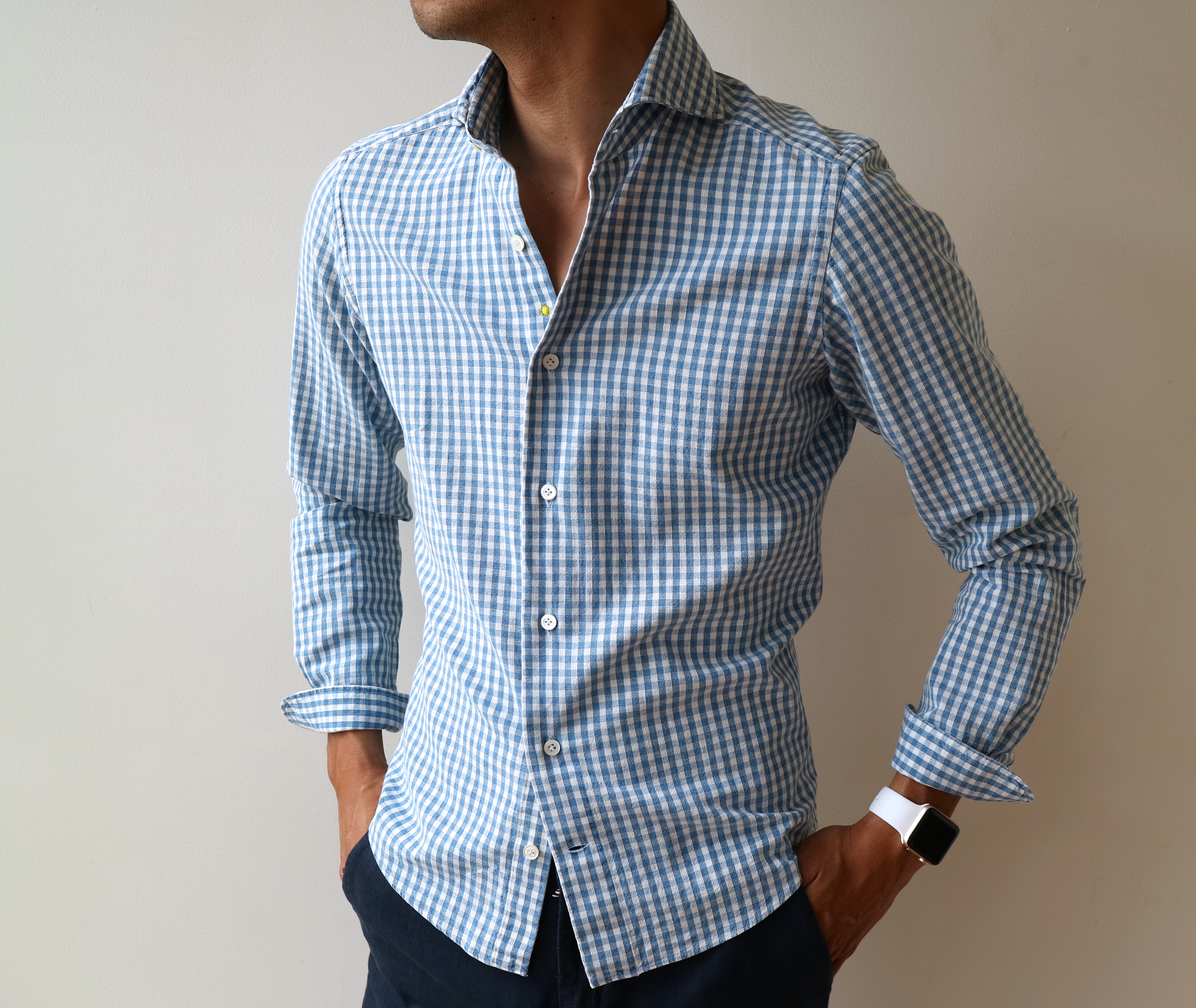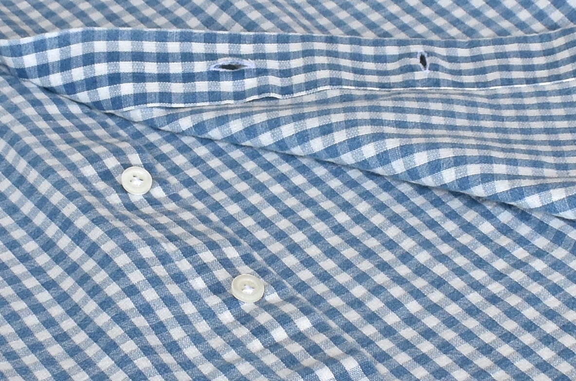ブリーチウォッシュのギンガムチェック柄。淡い発色は一見春夏っぽいですが、いつ何時も手元に置きておきたい色とも言えるのが、ブルー。生地は綿100%・厚みは普通ですし、秋冬の重ね着でも、きっと活躍するでしょう。