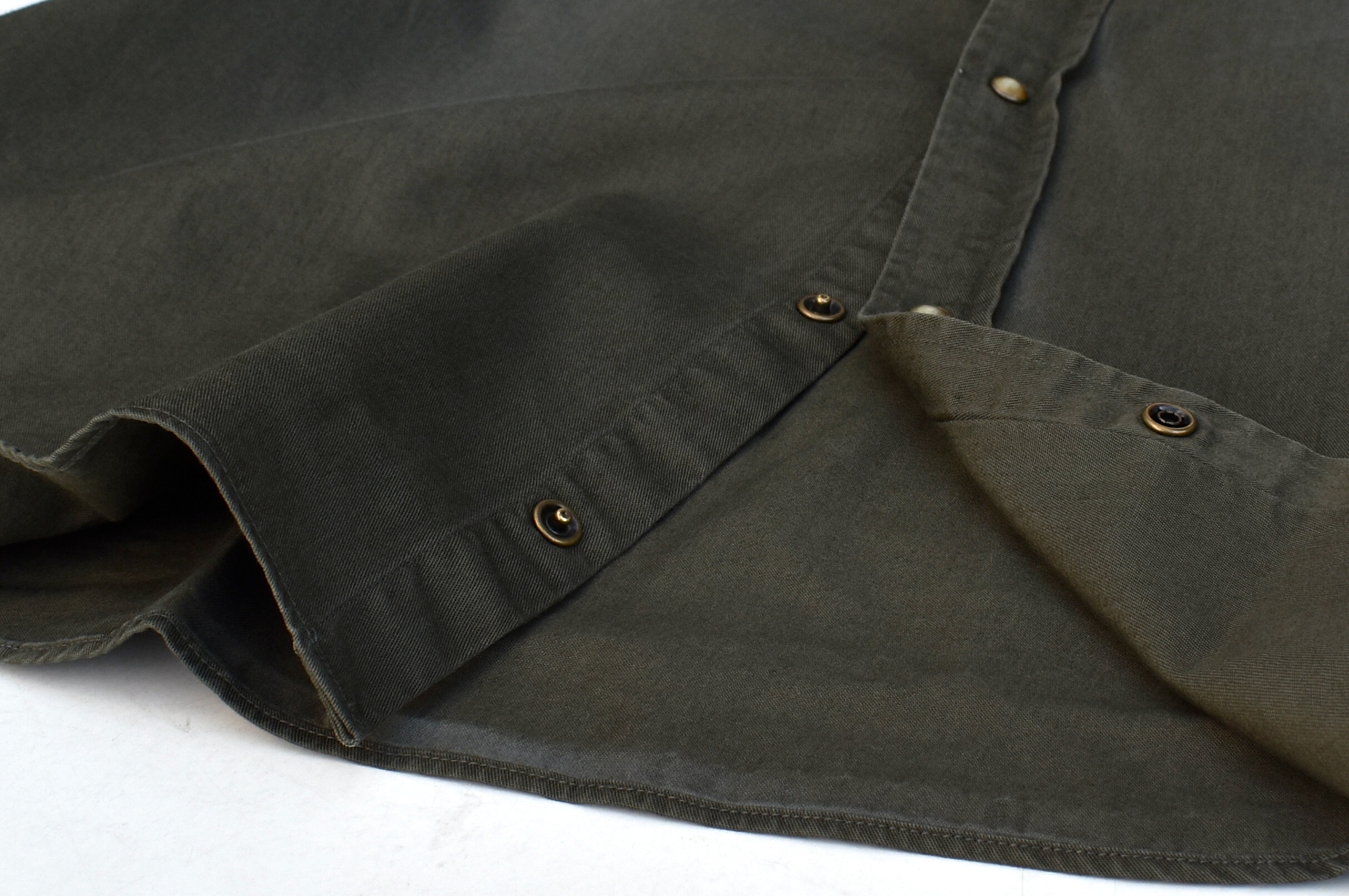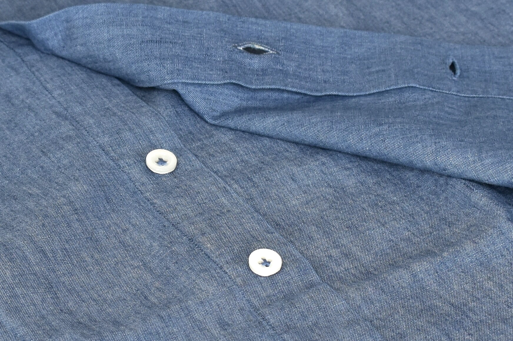 同じ生地&同じ色と申しましたが、では、どこが違うの?...と言いますと、形と仕様(加工)が異なります。まず形。いつものホリゾンタルカラーに、短丈の「VINCI FIT/ヴィンチ フィット」です。それから仕様(加工)は、釦をスナップ釦に変更し、尚かつダメージ加工をリクエストした1枚になります。