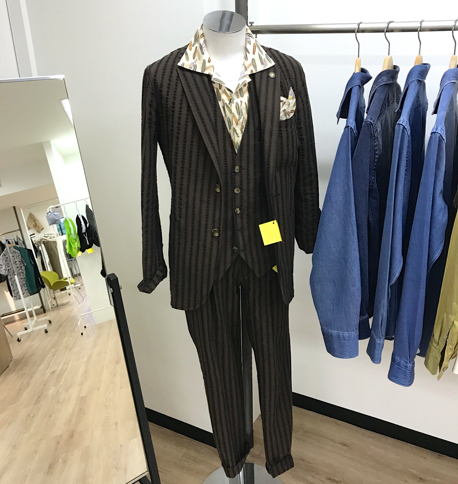 5月末のプレコレクションに加え、今月に出掛けたメインコレクション。マガジーノの2018年春夏商材は、ほぼほぼ確定しております。写真は、【Giannetto/ジャンネット】の展示会場にて。新しく&面白い提案が続くシャツブランドは、来春夏も健在です。ブラウンのシアサッカーストライプのシャツ地スリーピースに、サーフボードの柄が可愛い開襟シャツ&ポケットチーフ。すべてを仕入れた訳ではありませんが、既に来春夏が楽しみで堪らなくなっていたりして...。これからの秋冬物があるのにも関わらず、困ったものです。