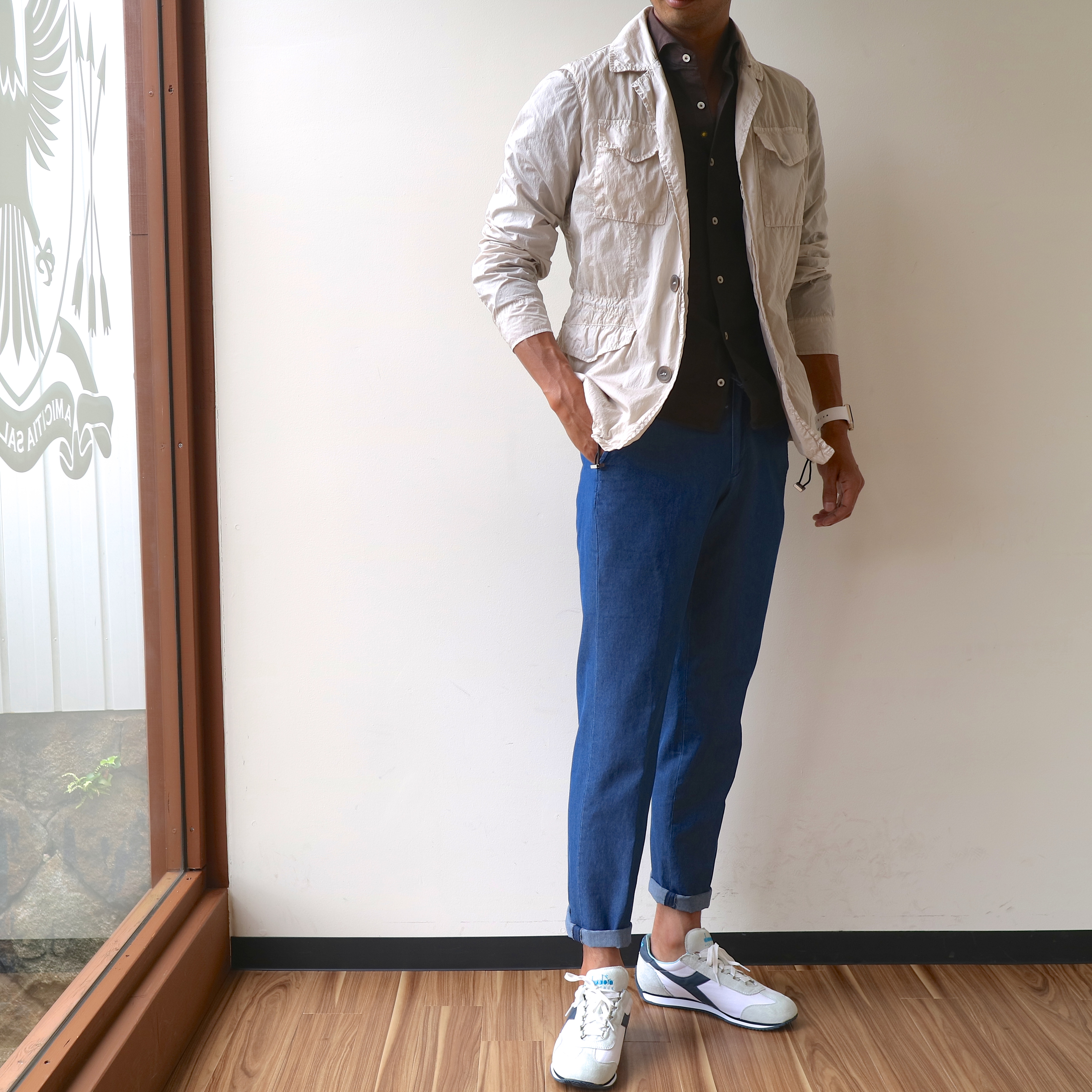 発見と言えば、シャツファクトリーの【Giannetto/ジャンネット】が思い浮かびます。今春夏はシャツ地を使ったスリーピースやコートが斬新でしたね。では、今秋冬は?と言いますと...、ミリタリーシャツの新シリーズに注目です。秋の序盤から投入しやすい、今ピッタリなアイテムなのではないでしょうか。 カットソーーveil デニムーCare label 靴ーSpring Court ブレスレットーCHAN LUU