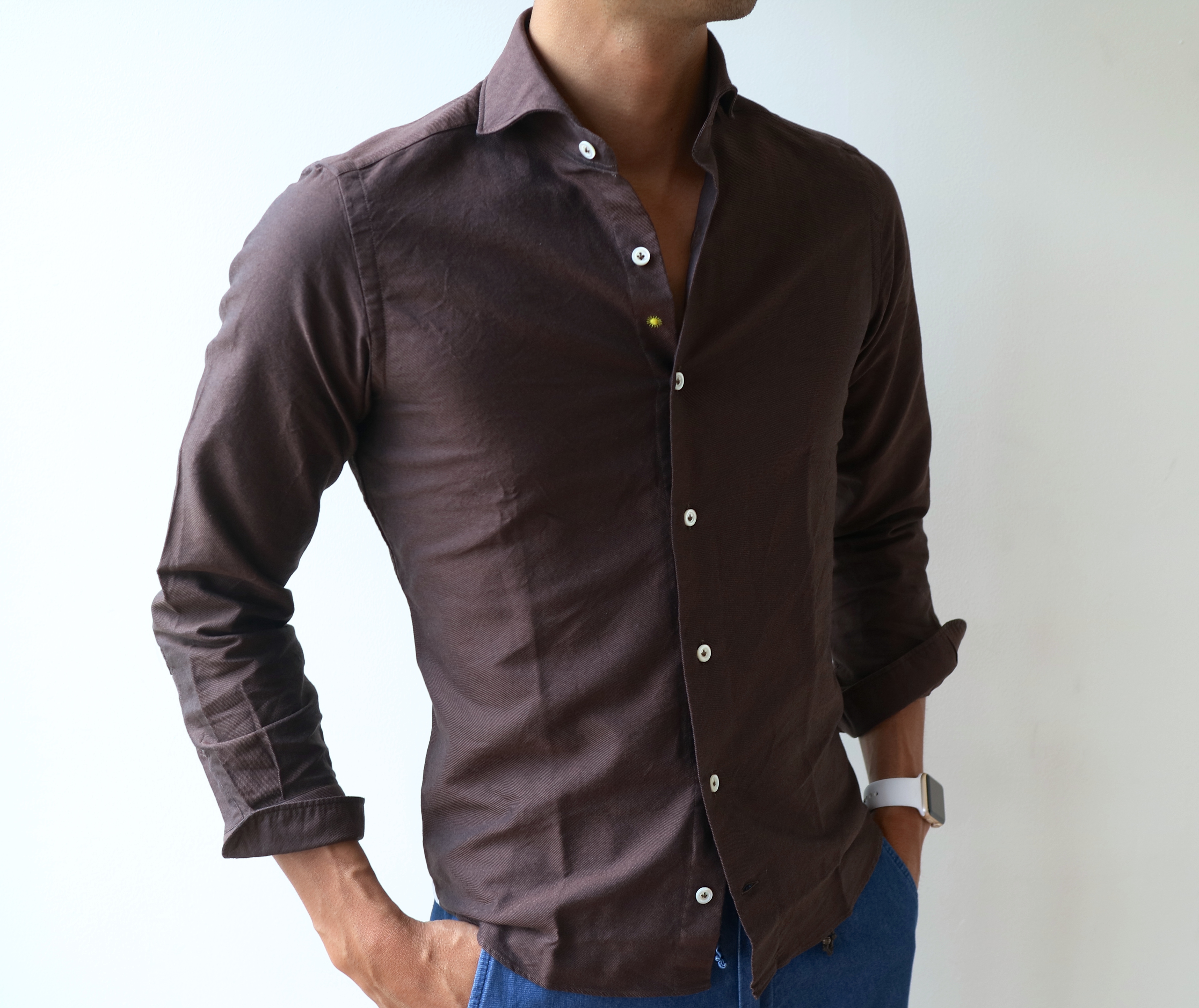 通年素材のオックスフォードの無地シャツ。今年むちゃむちゃ気に入っていたのが、このブラウン。オックスのざっくりした織り感だからこそでしょうか、程よくカジュアル感が伝わってきて、尚かつモダンな雰囲気を感じる発色です。手前味噌ですが、当たりのブラウン...だと思います。次の秋冬はオックスフォード地を入れておりませんので、気になる方はこの機会にどうぞ。