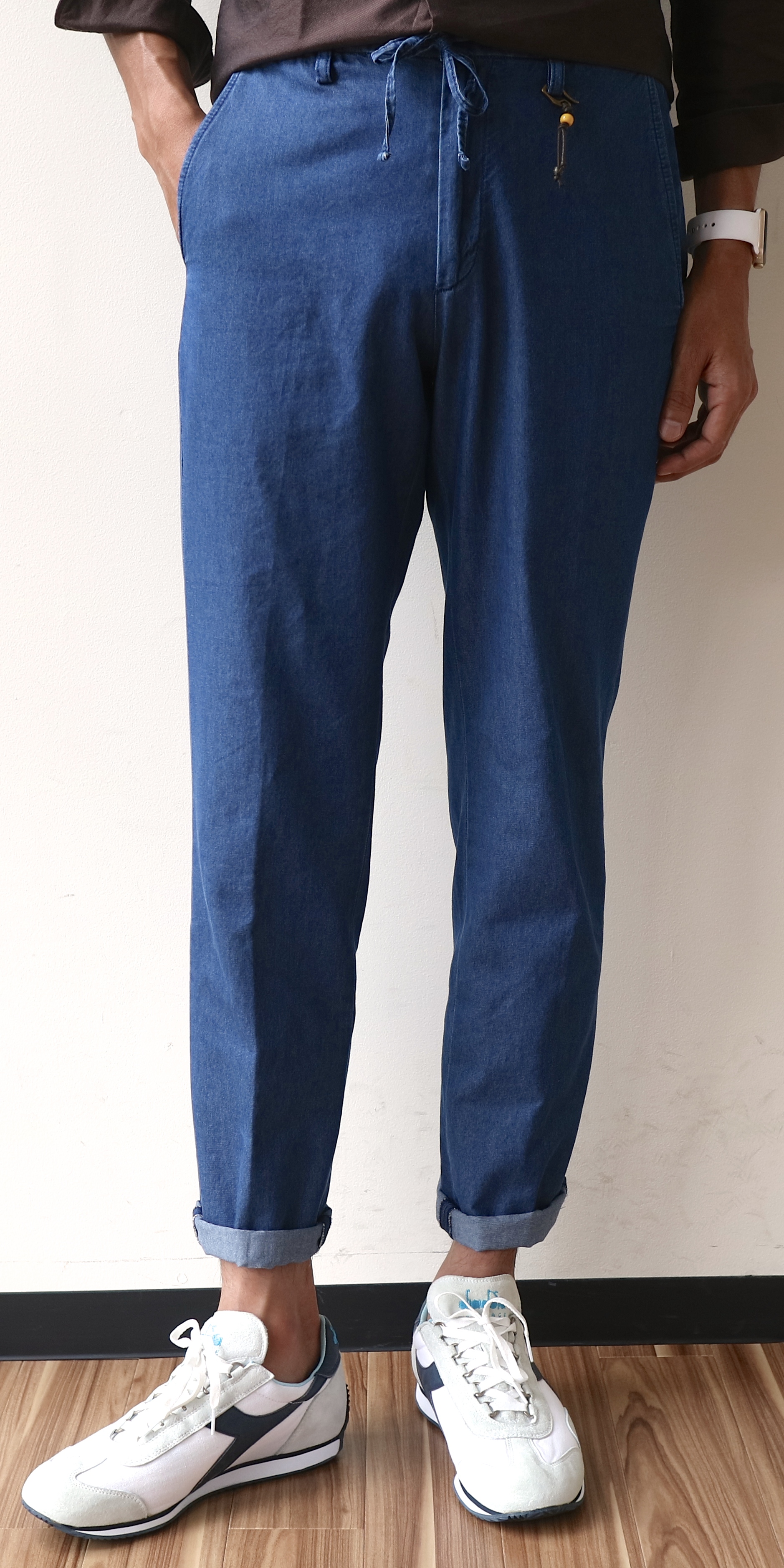 もうひとつだけ、お付き合いください。今季から仕入れをスタートした、シャツ生地のパンツ。ゴム仕様&ドローコード付きのウエストに、股上深め・太もも余裕有り・裾にかけて良い塩梅のテイパードと、秀逸な仕上がりでした。とっても履きやすいです。来春夏以降も期待大ですが、今季デニム代わりの1本としてお勧めしております。