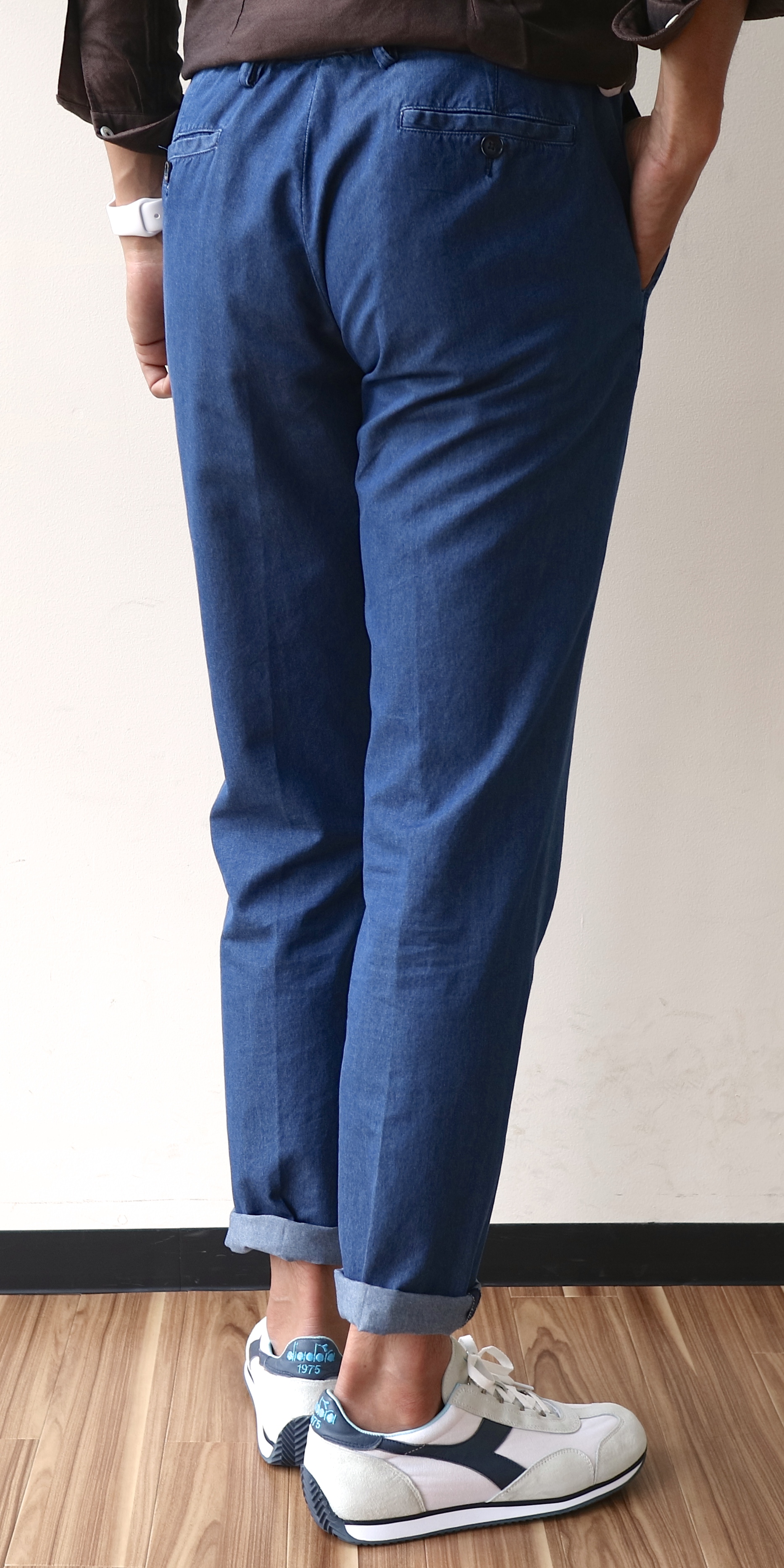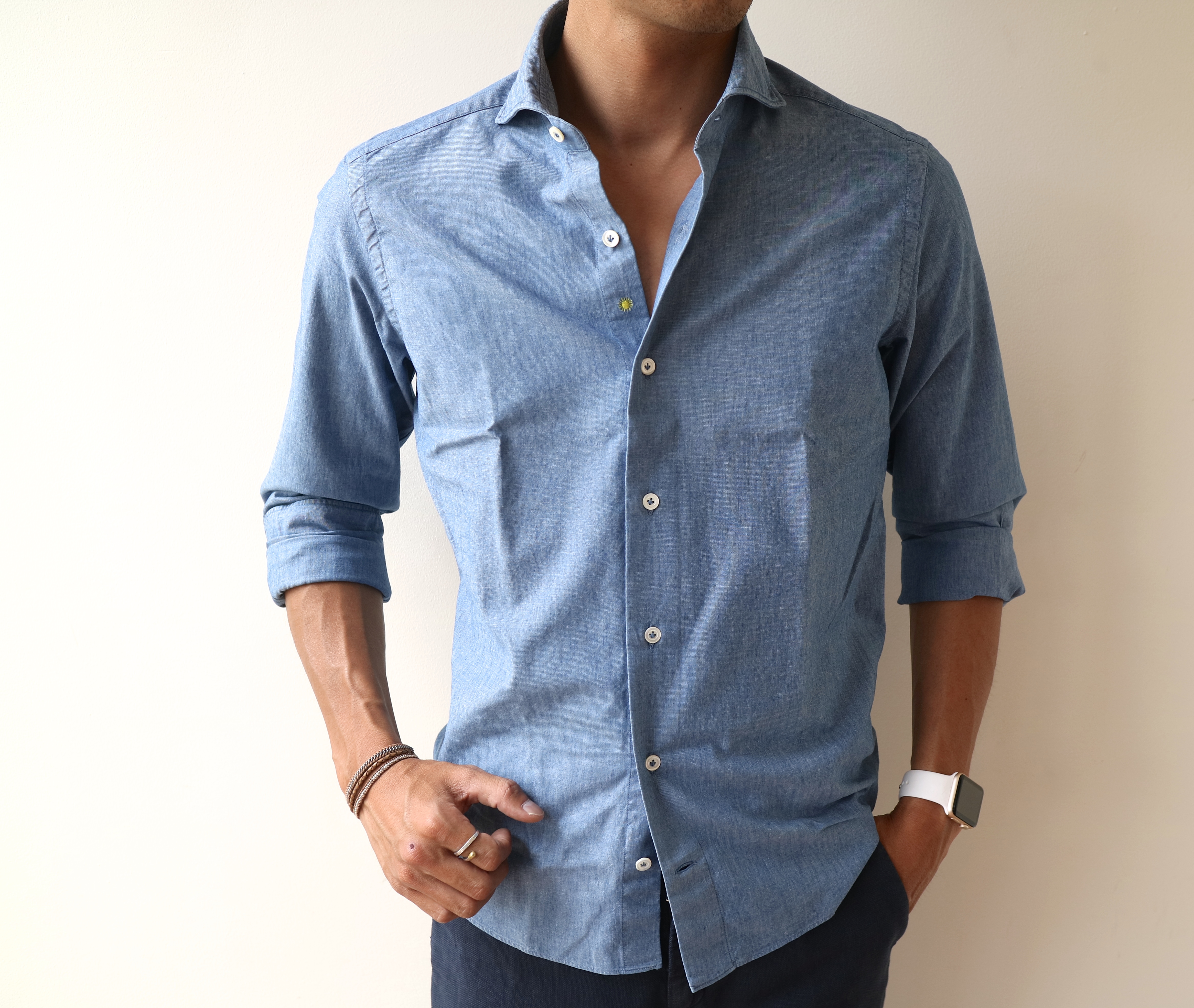 定番のシャンブレーシャツ。丈の短いVINCI FITで1枚、如何でしょう。タックアウトした状態で上に重ね着しても、裾がちょい見え隠れする位の短い丈感。シャツを出したまま着たい方は、秋冬もVINCI FITを買い足してください。